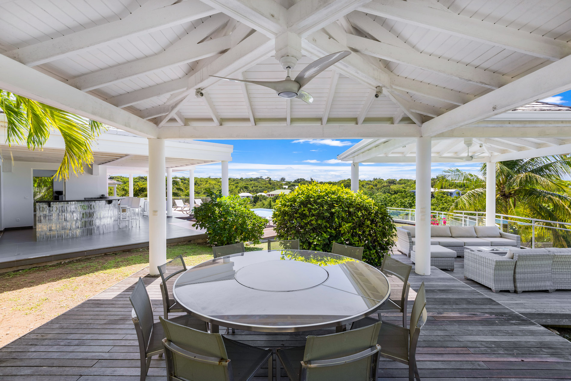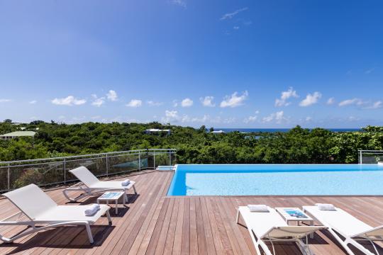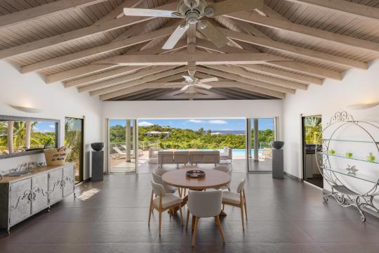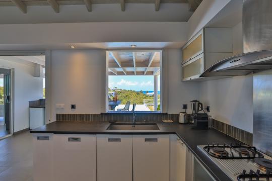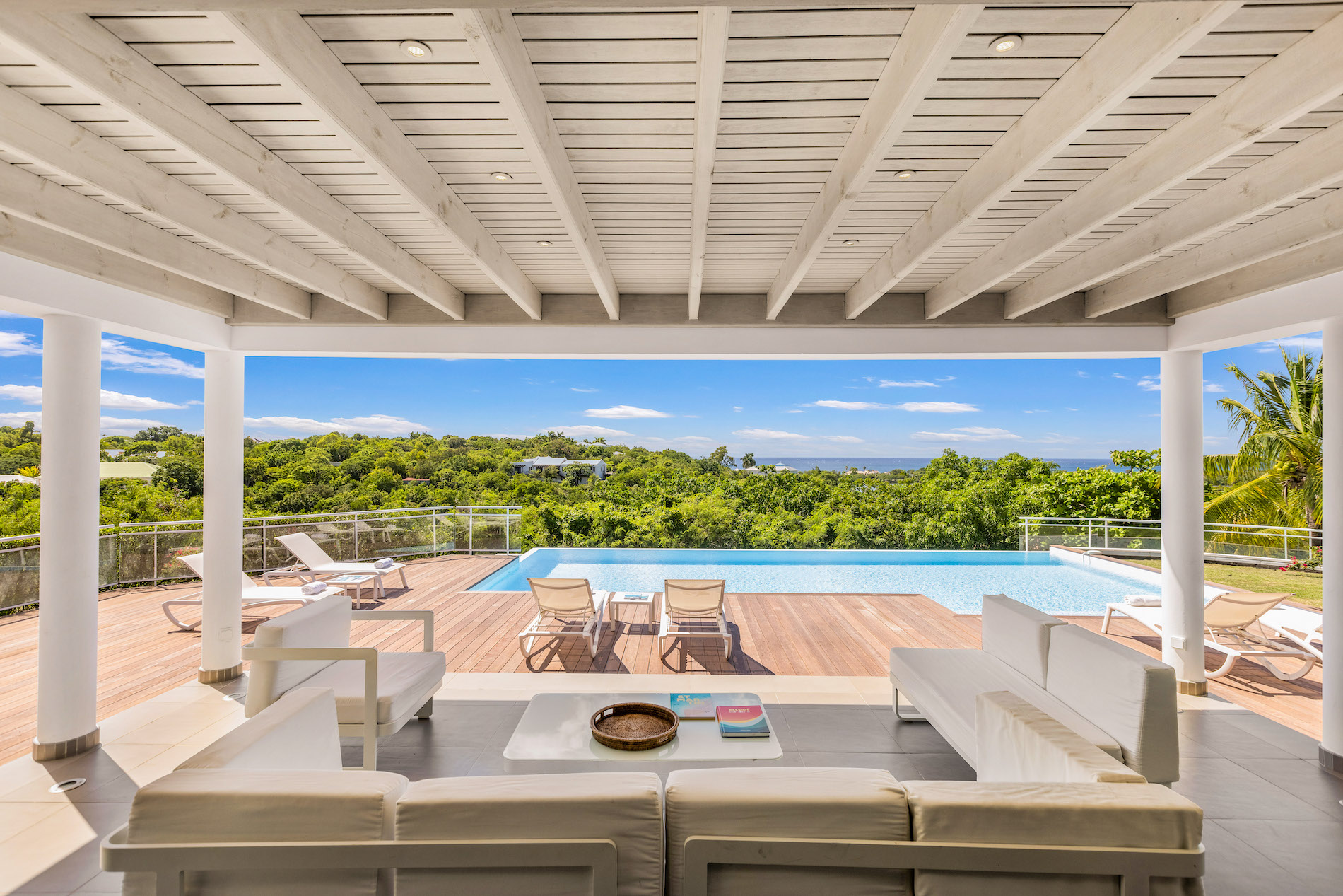 The kitchen in Villa No Limit is fully equipped, allowing you to prepare your favorite meals and enjoy them in the dining area or al fresco on the terrace. The infinity pool faces the magnificent view of the sunset over Baie Longue and the Caribbean Sea, providing a picturesque setting to relax and unwind.