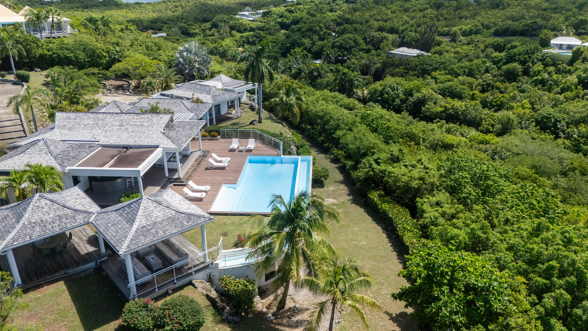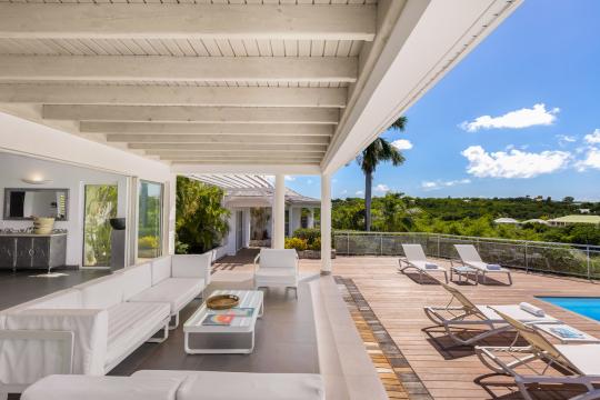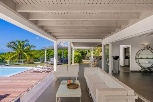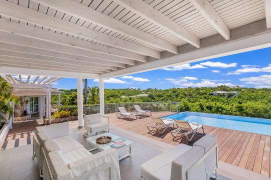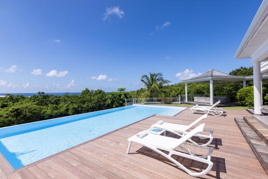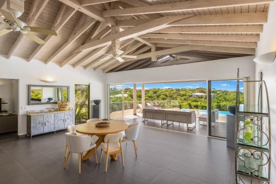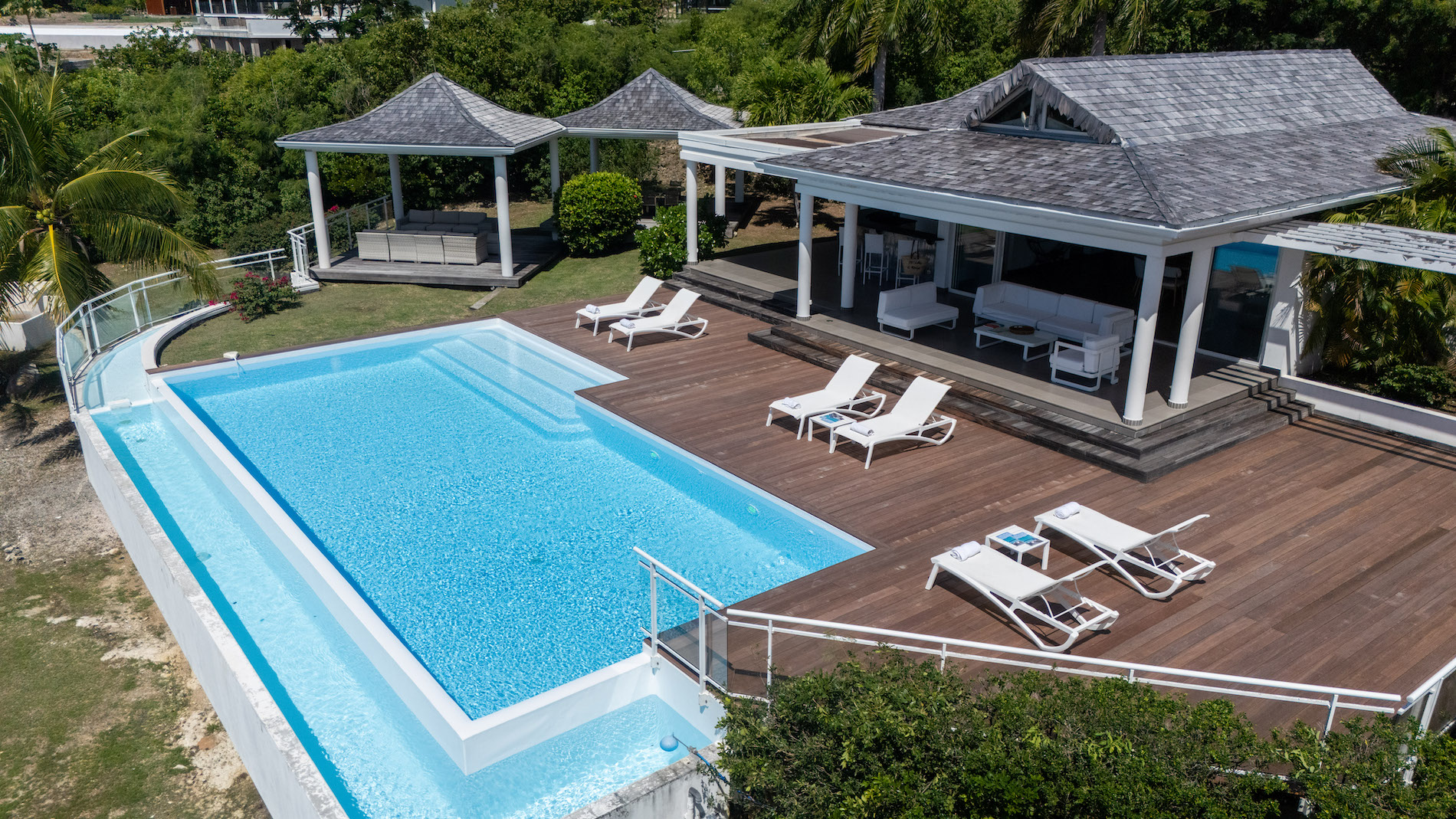 The kitchen in Villa No Limit is fully equipped, allowing you to prepare your favorite meals and enjoy them in the dining area or al fresco on the terrace. The infinity pool faces the magnificent view of the sunset over Baie Longue and the Caribbean Sea, providing a picturesque setting to relax and unwind.