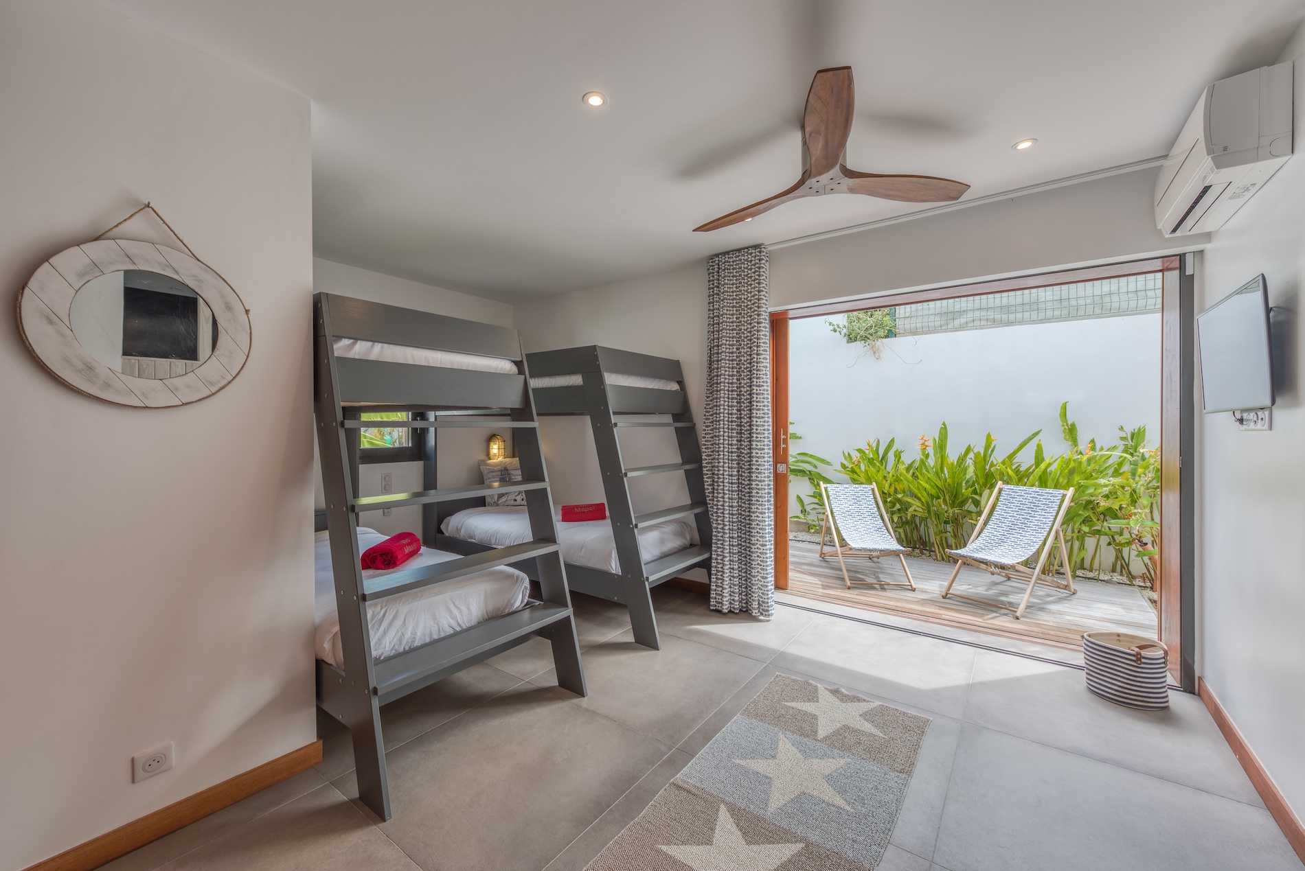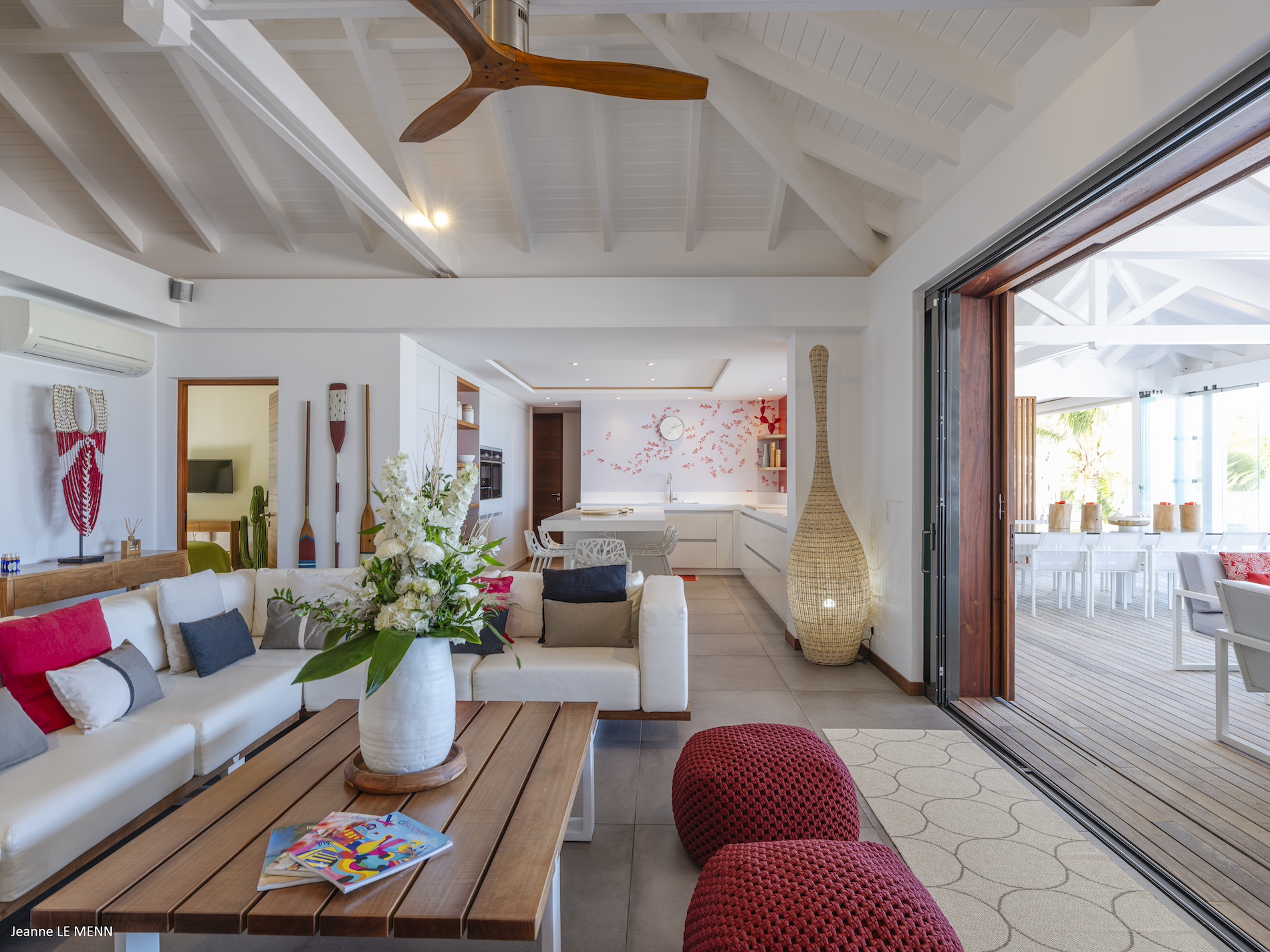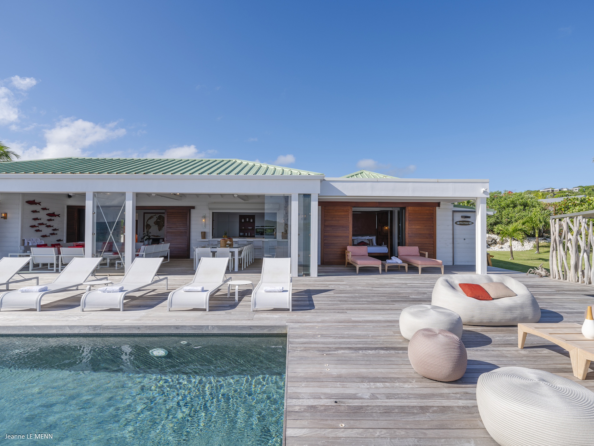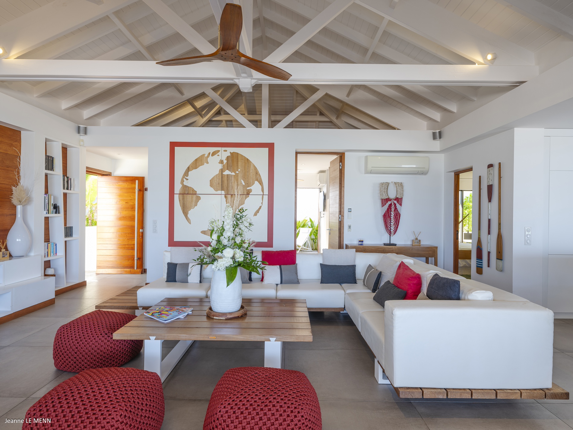 Inside, the interior spaces are tastefully decorated, fully air-conditioned, and designed to maximize the flow of the ocean breeze. All bedrooms are equipped with air conditioning, ceiling fan and TV, for optimal comfort. Note also that the sixth bedroom is accessible from the outside, located after the pool, which gives it a little more privacy and separation from the common areas.