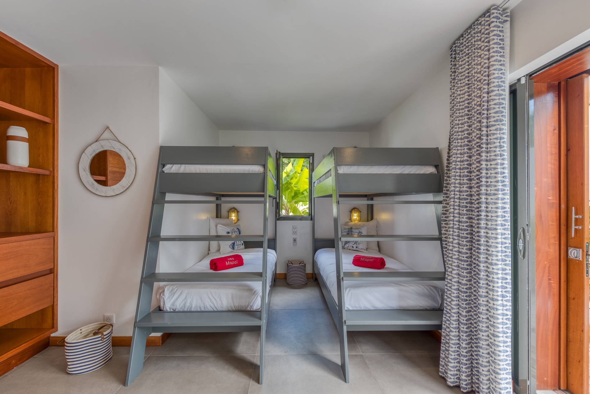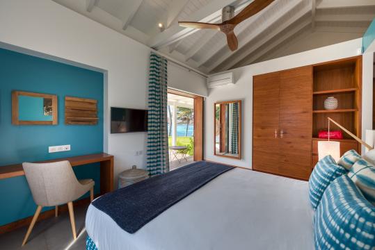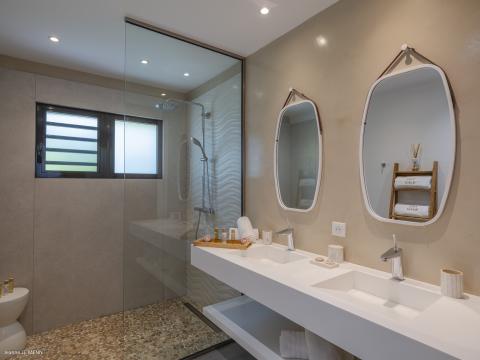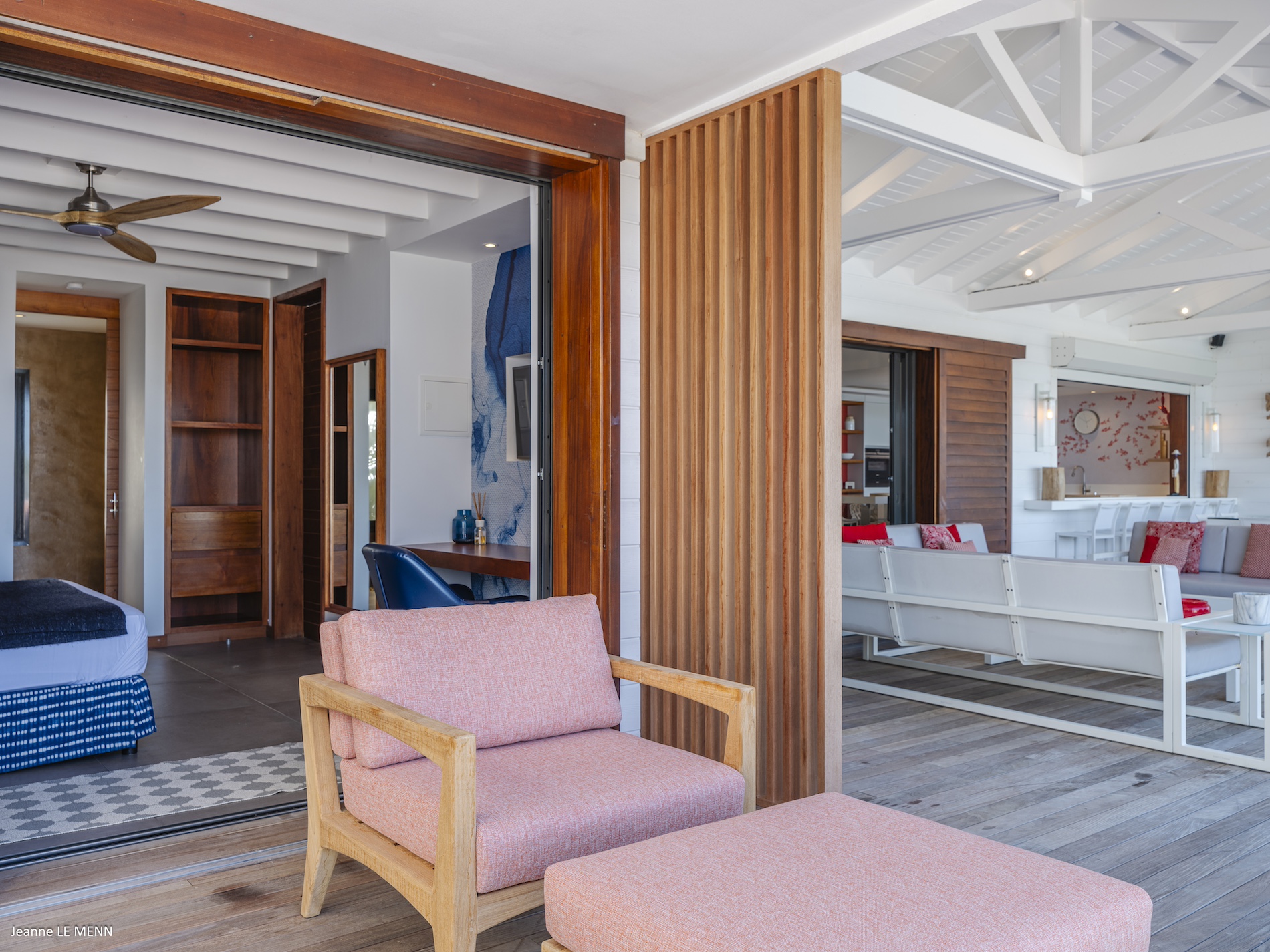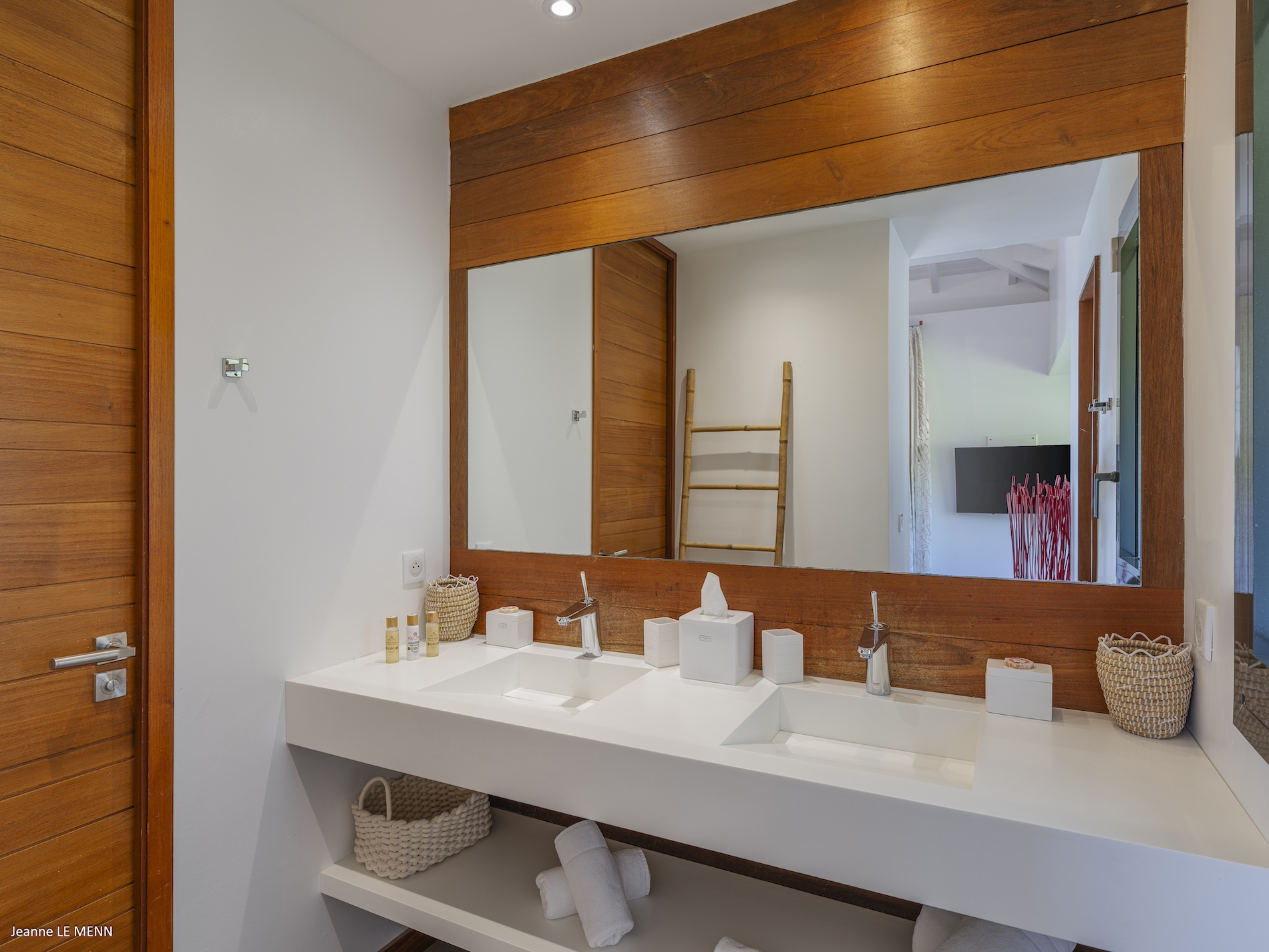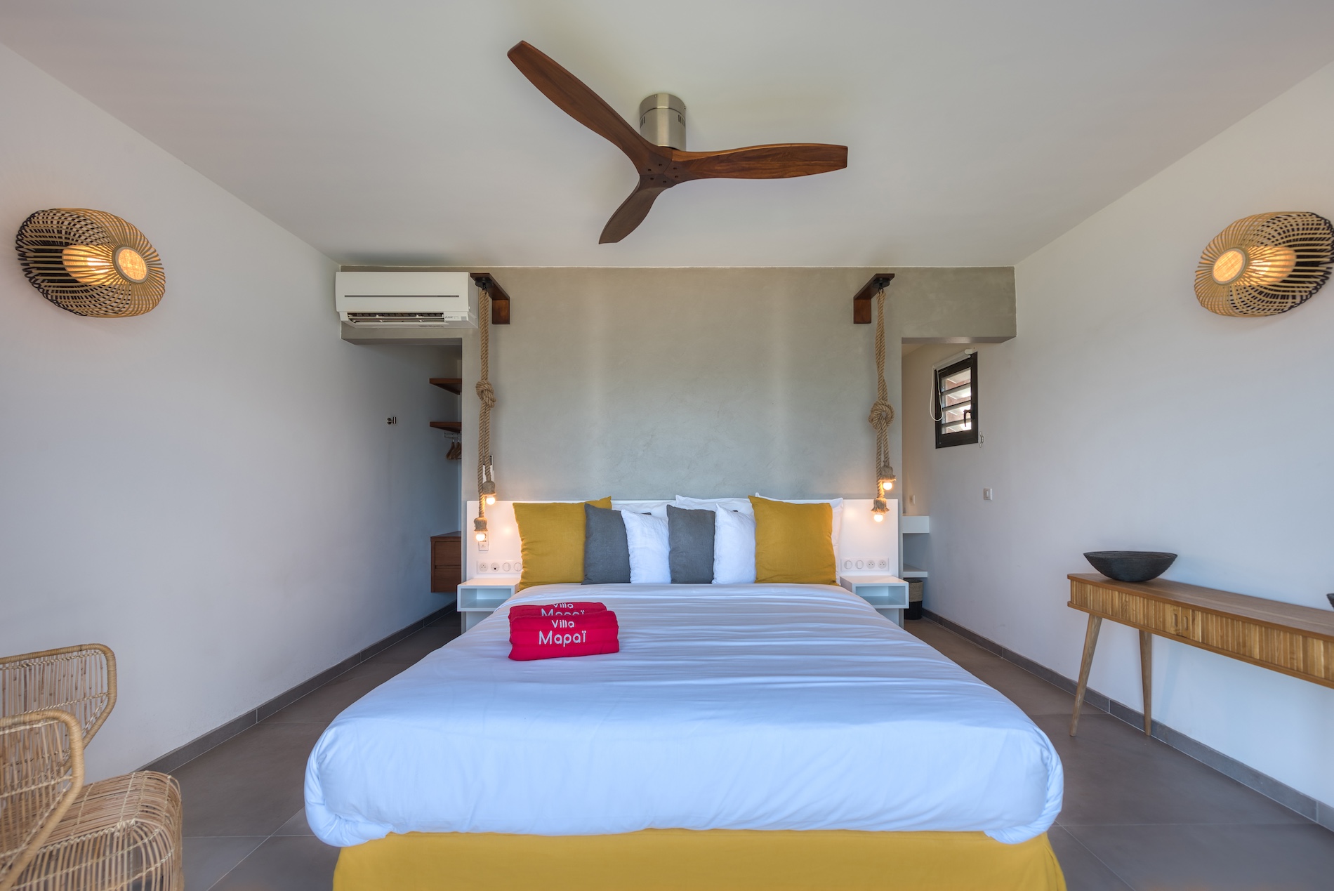 Inside, the interior spaces are tastefully decorated, fully air-conditioned, and designed to maximize the flow of the ocean breeze. All bedrooms are equipped with air conditioning, ceiling fan and TV, for optimal comfort. Note also that the sixth bedroom is accessible from the outside, located after the pool, which gives it a little more privacy and separation from the common areas.