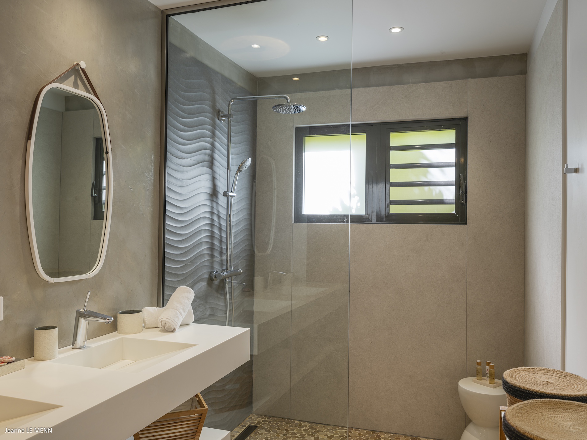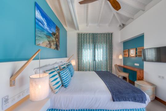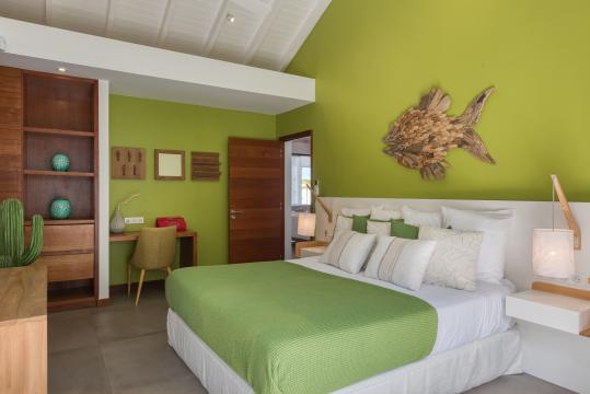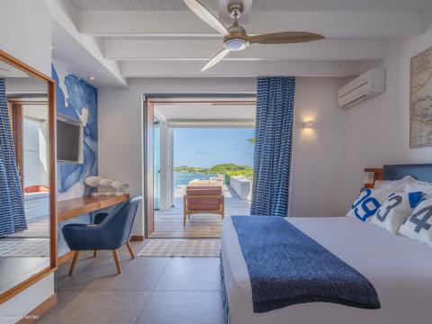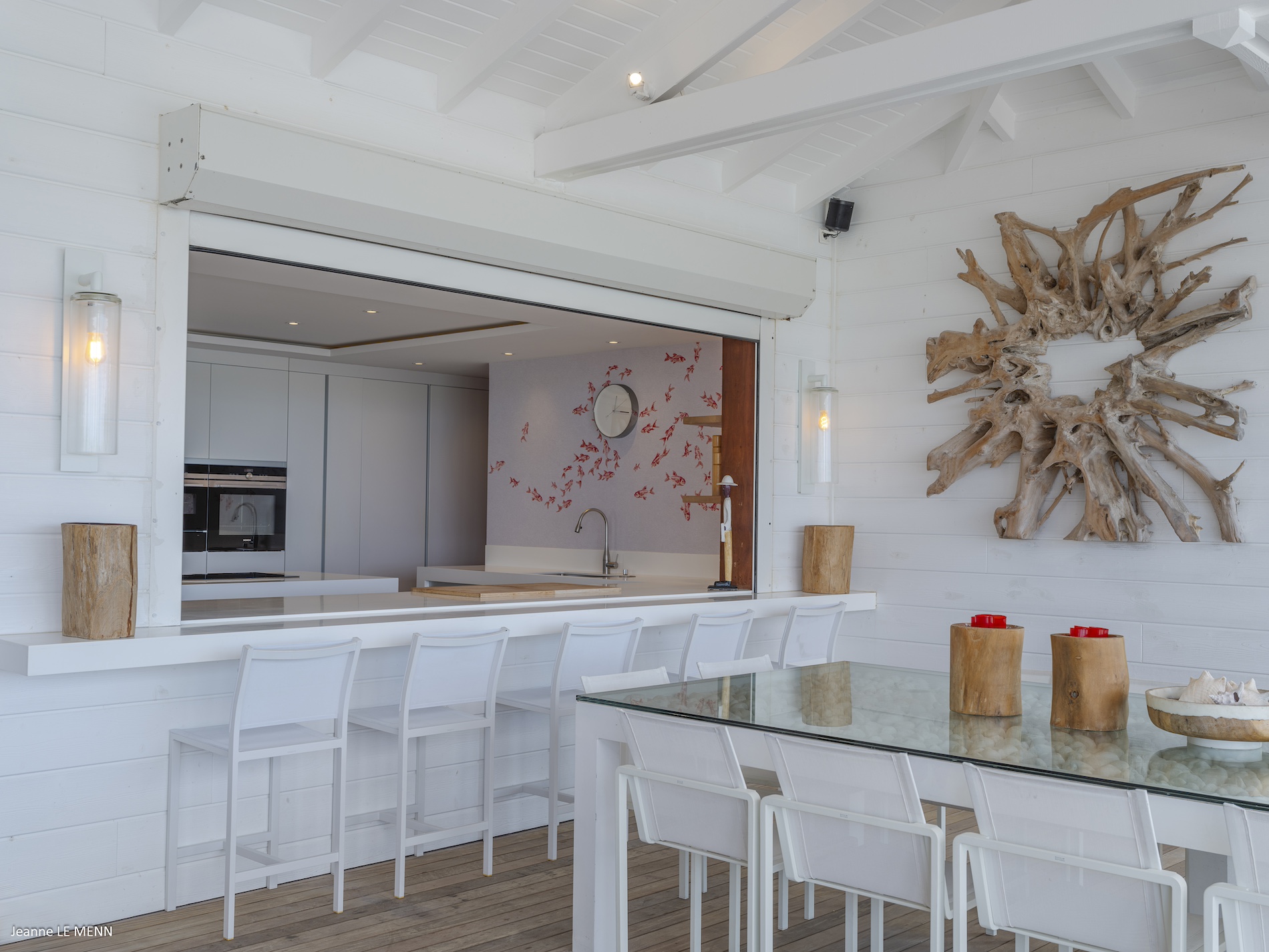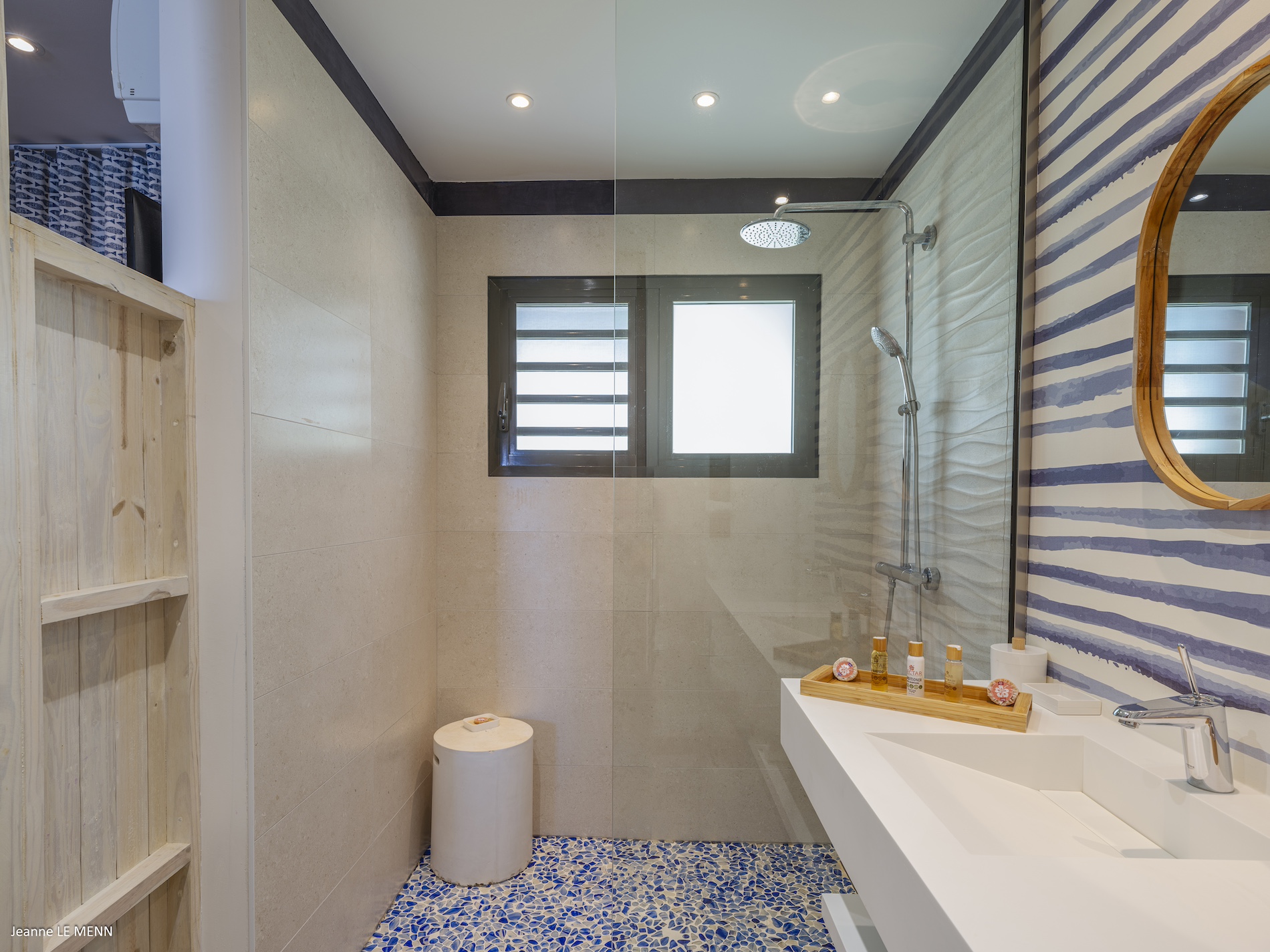 Inside, the interior spaces are tastefully decorated, fully air-conditioned, and designed to maximize the flow of the ocean breeze. All bedrooms are equipped with air conditioning, ceiling fan and TV, for optimal comfort. Note also that the sixth bedroom is accessible from the outside, located after the pool, which gives it a little more privacy and separation from the common areas.