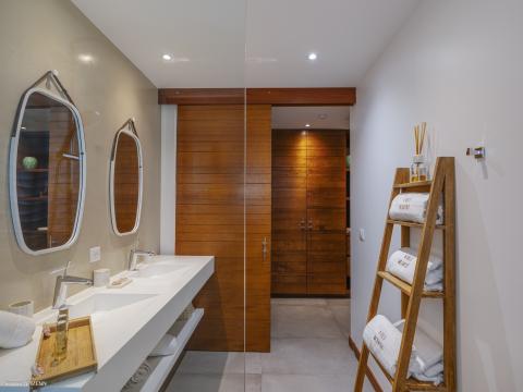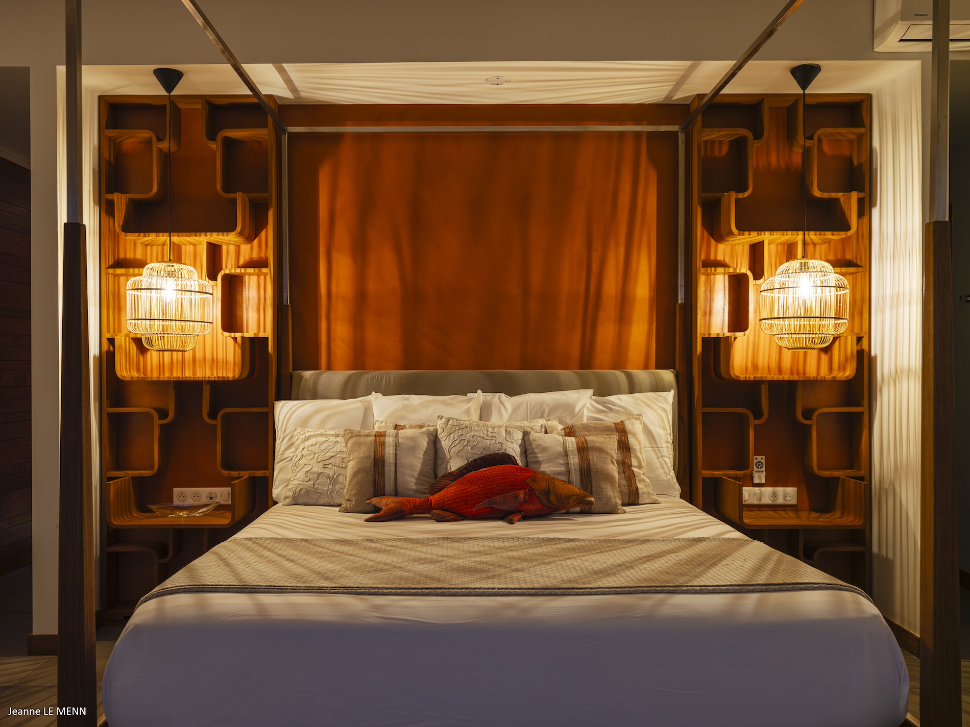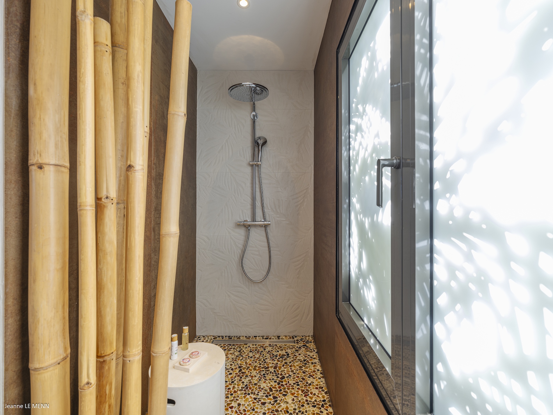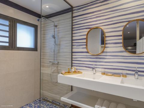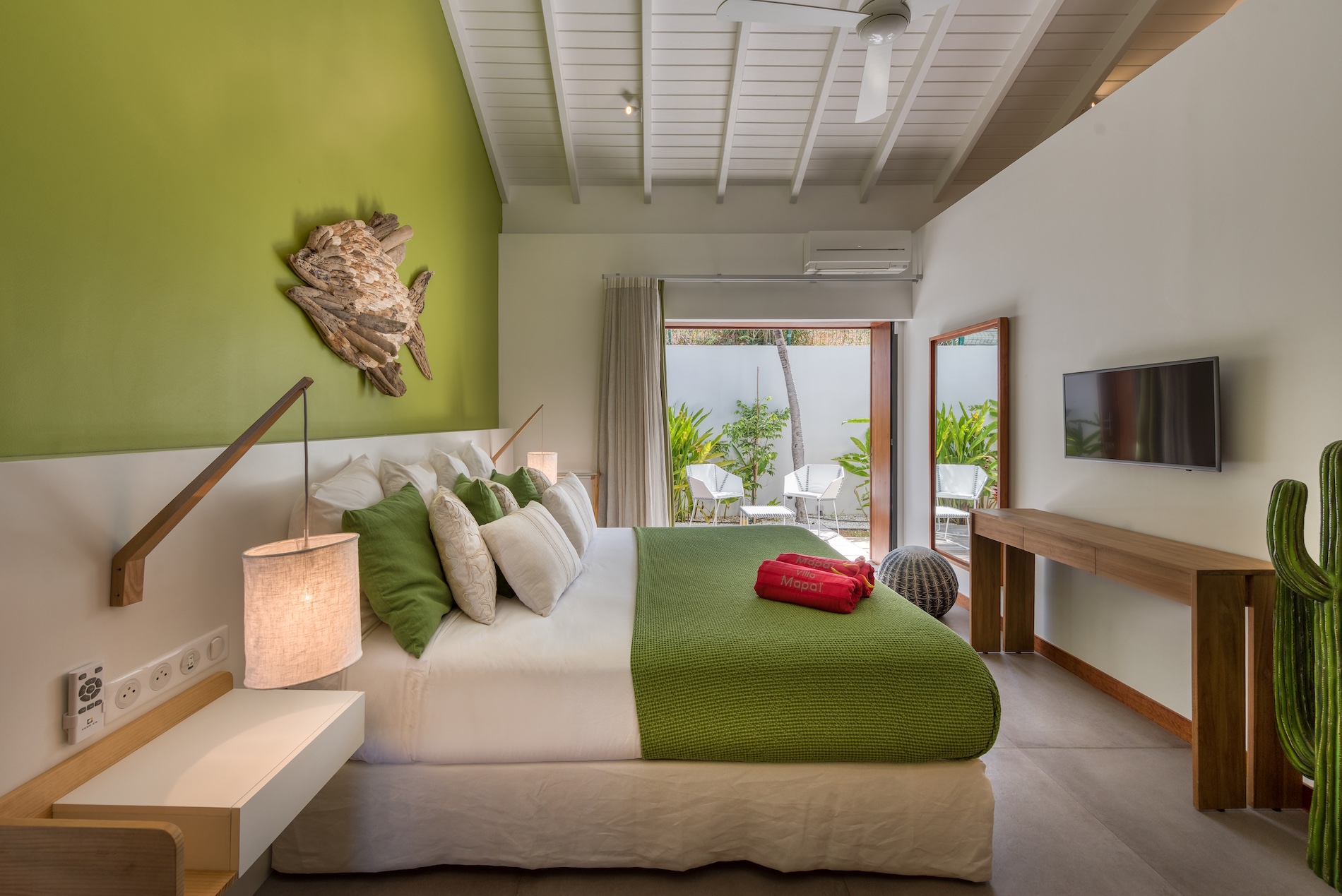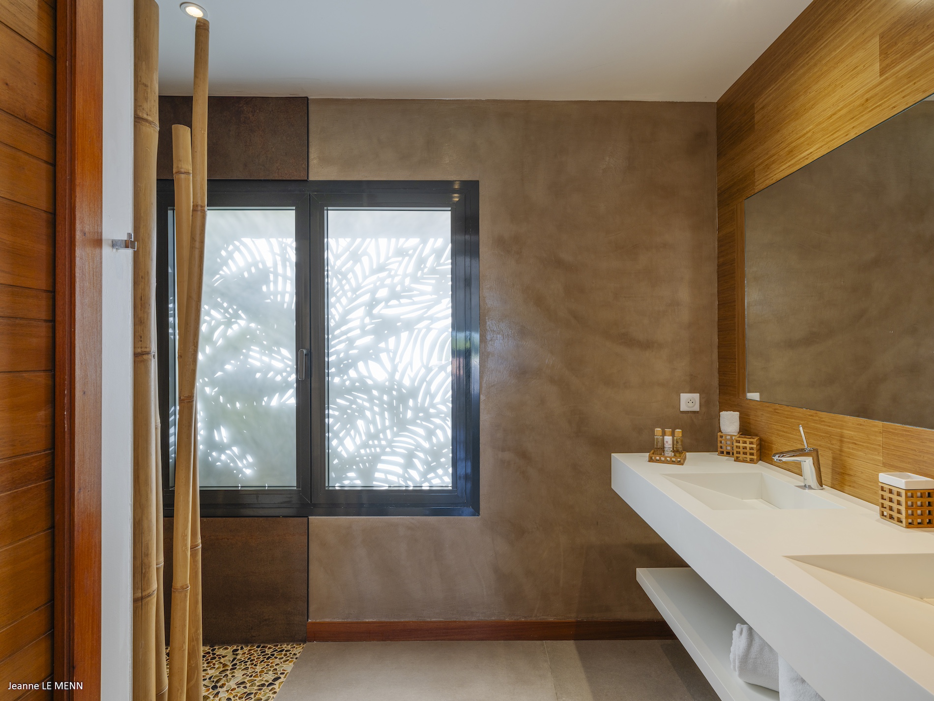 Inside, the interior spaces are tastefully decorated, fully air-conditioned, and designed to maximize the flow of the ocean breeze. All bedrooms are equipped with air conditioning, ceiling fan and TV, for optimal comfort. Note also that the sixth bedroom is accessible from the outside, located after the pool, which gives it a little more privacy and separation from the common areas.