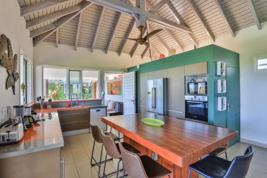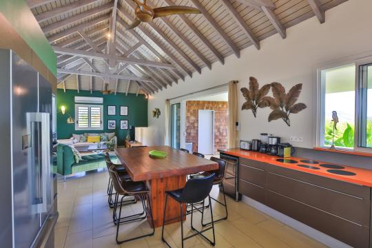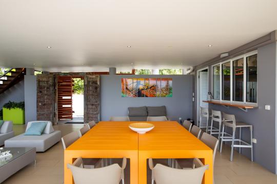 The covered terrace offers a space with generous armchairs for lounging and dining, as well as a barbecue. The equipped kitchen directly overlooks the superb view and is connected to the terrace.