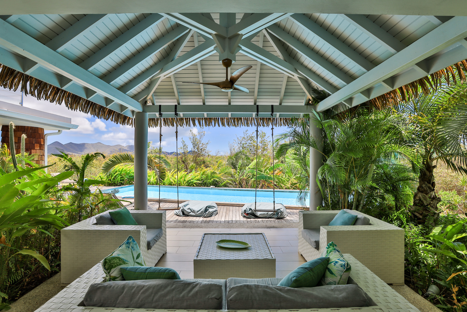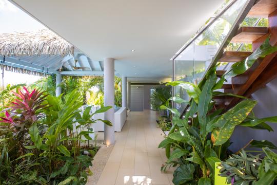 Villa Bahia Blue is a stunning vacation destination, nestled in the heart of a lush tropical forest with a gorgeous infinity pool overlooking the scenery.