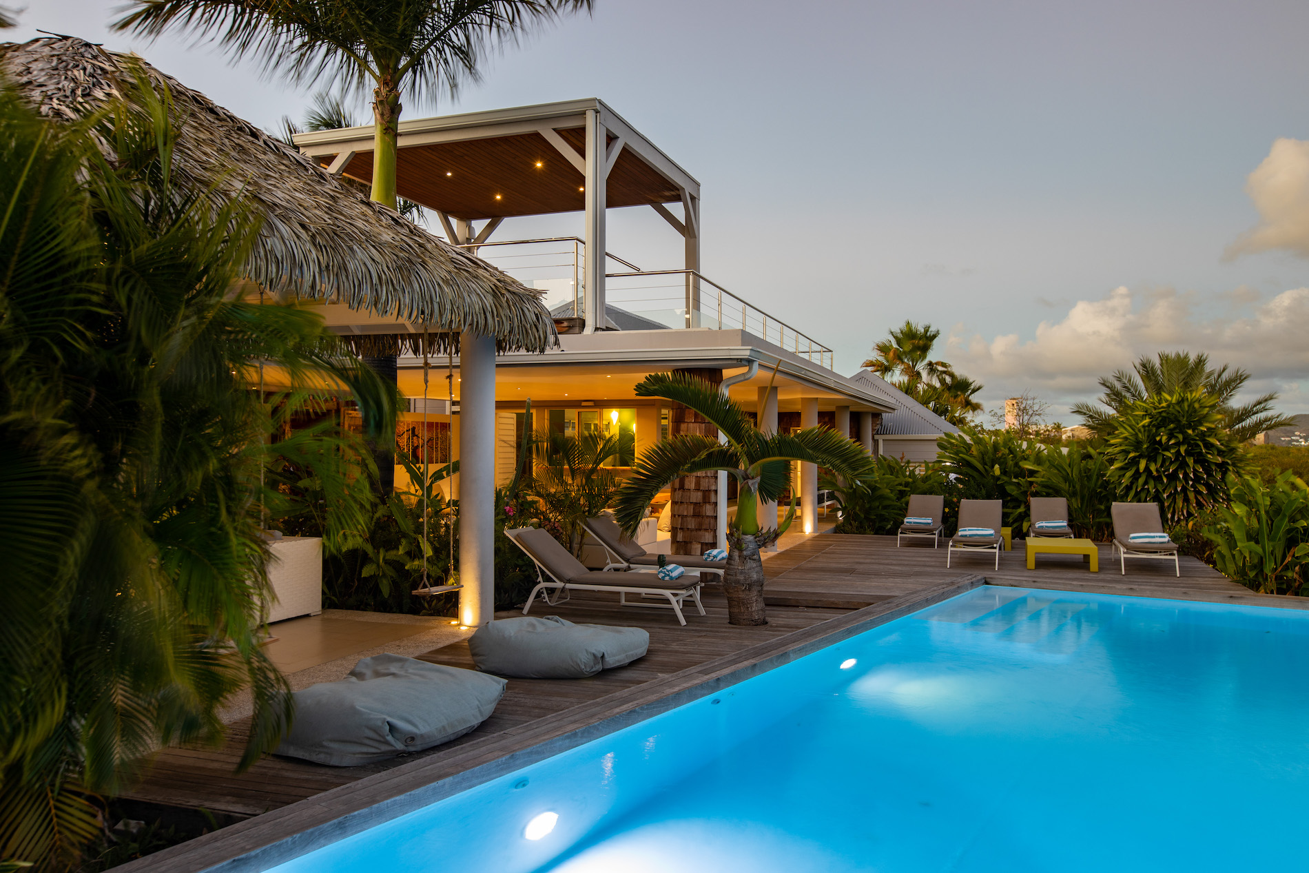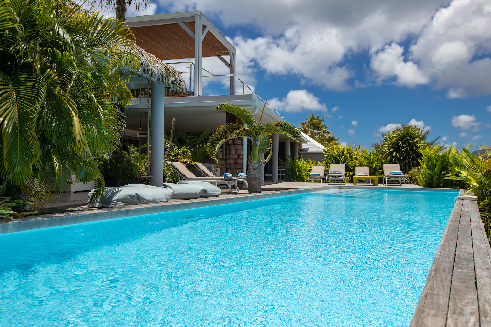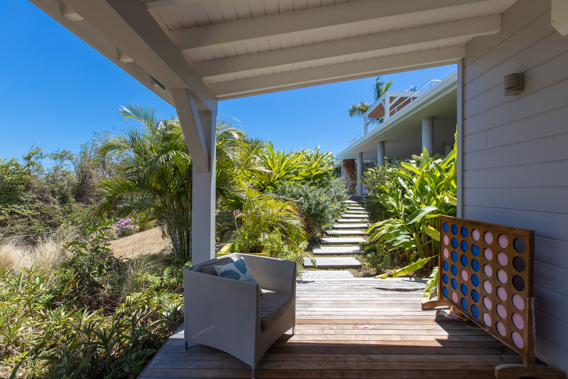 The tropical garden surrounding the house and deck adds to the enchanting atmosphere, creating a serene and peaceful ambiance that's perfect for relaxation and rejuvenation. The lush greenery and colorful flora are likely to attract an array of tropical birds and other wildlife, creating a natural symphony of sounds that soothe the senses.