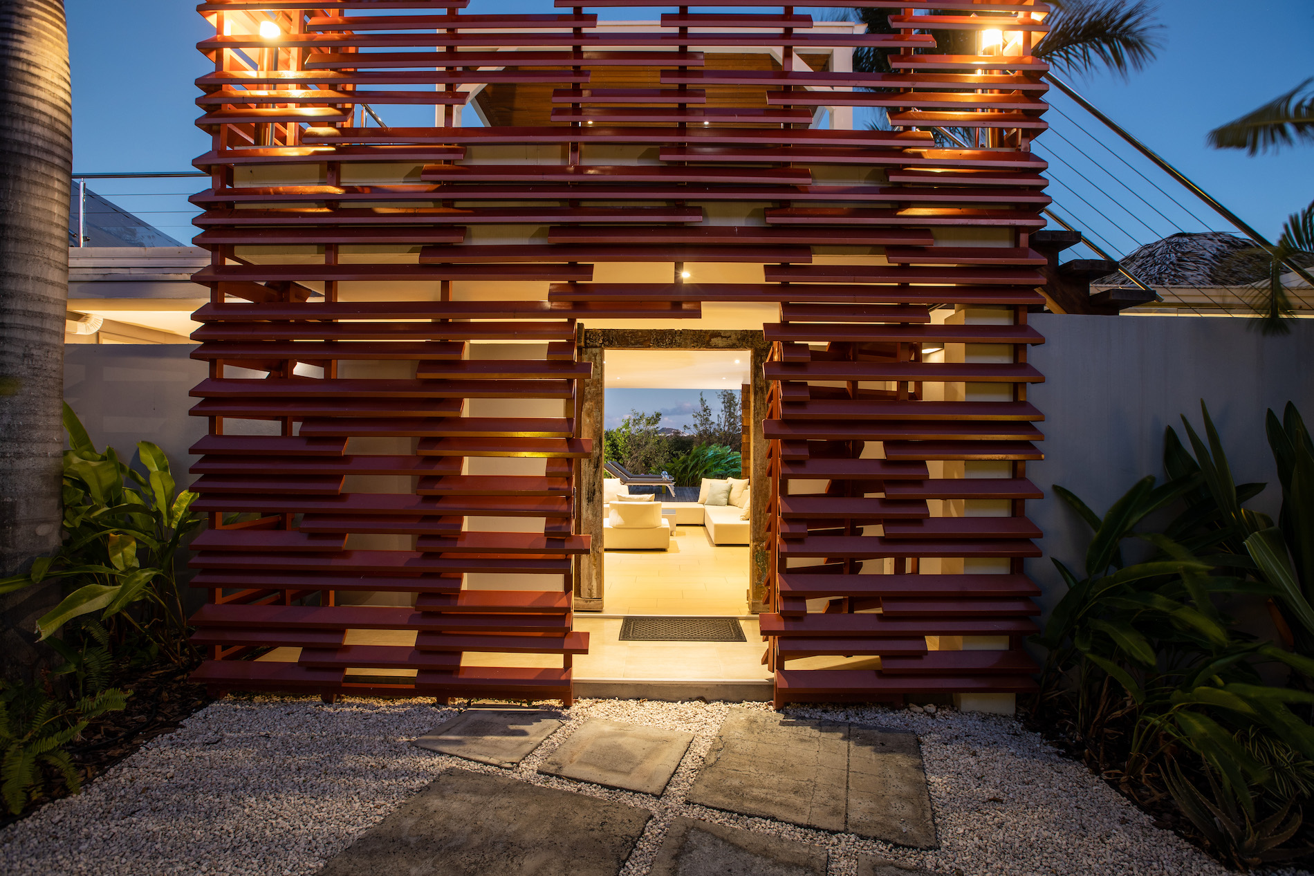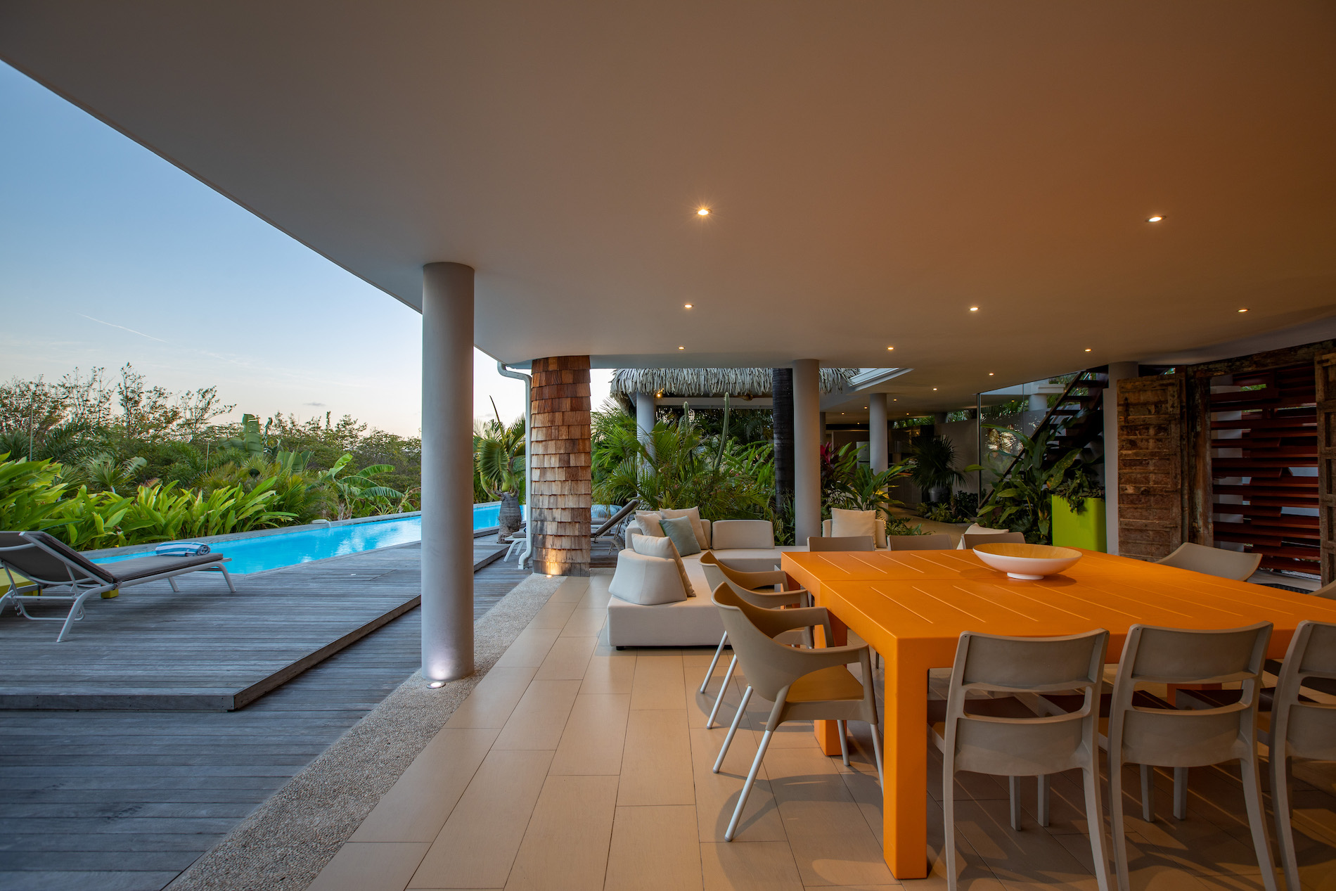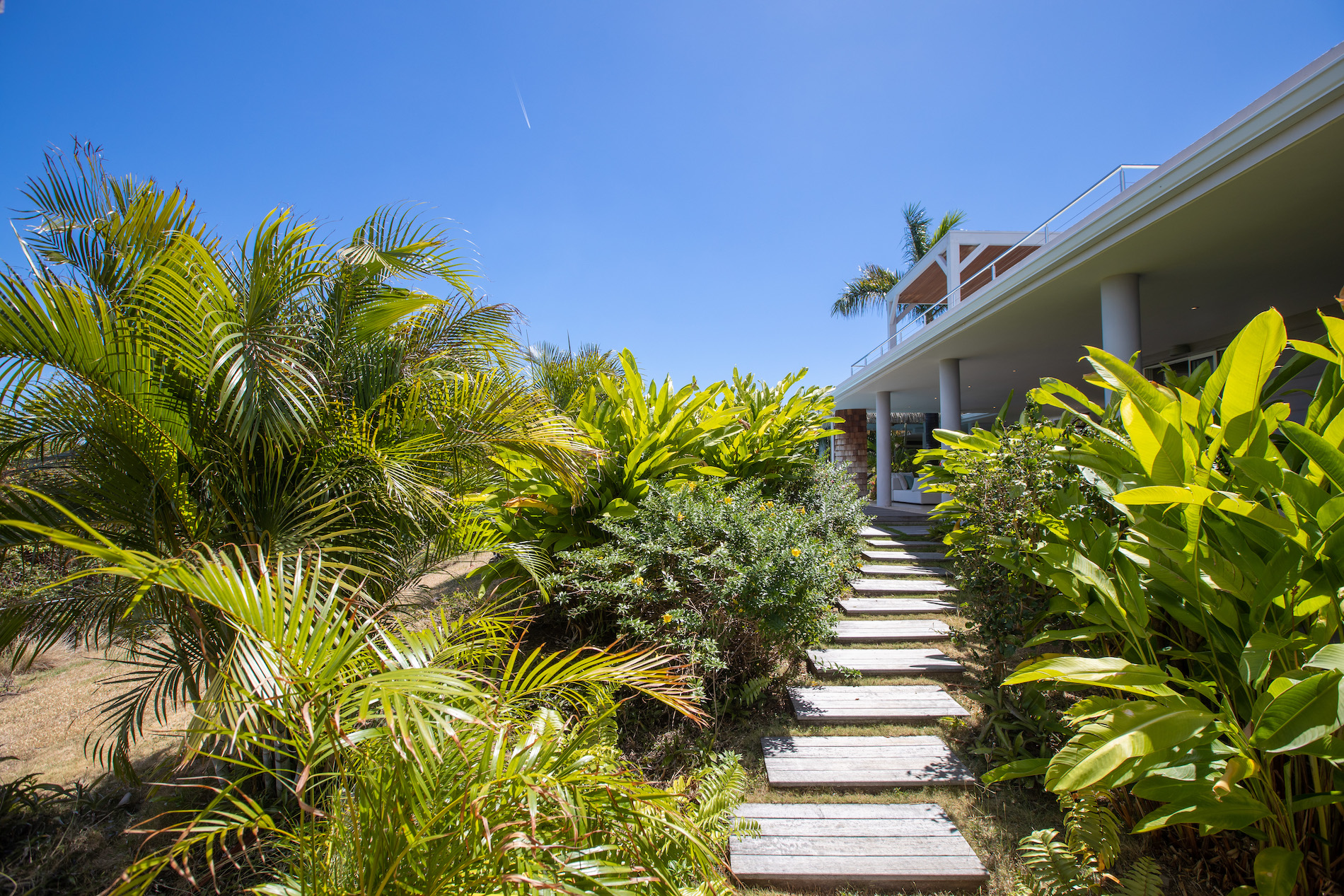 The tropical garden surrounding the house and deck adds to the enchanting atmosphere, creating a serene and peaceful ambiance that's perfect for relaxation and rejuvenation. The lush greenery and colorful flora are likely to attract an array of tropical birds and other wildlife, creating a natural symphony of sounds that soothe the senses.