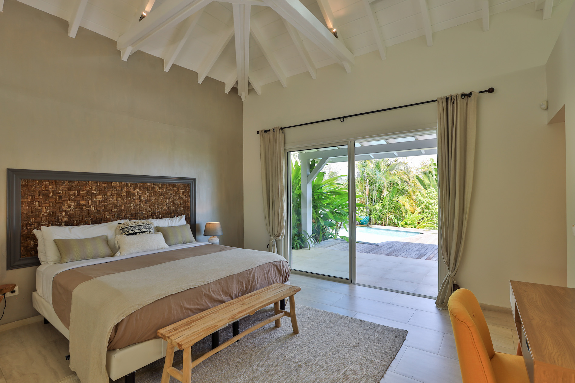 Two bedrooms are accessible from the inside and offer a view of the garden. From the living room, a few steps provide access from the outside to the other two bedrooms, located on the lower pool level.