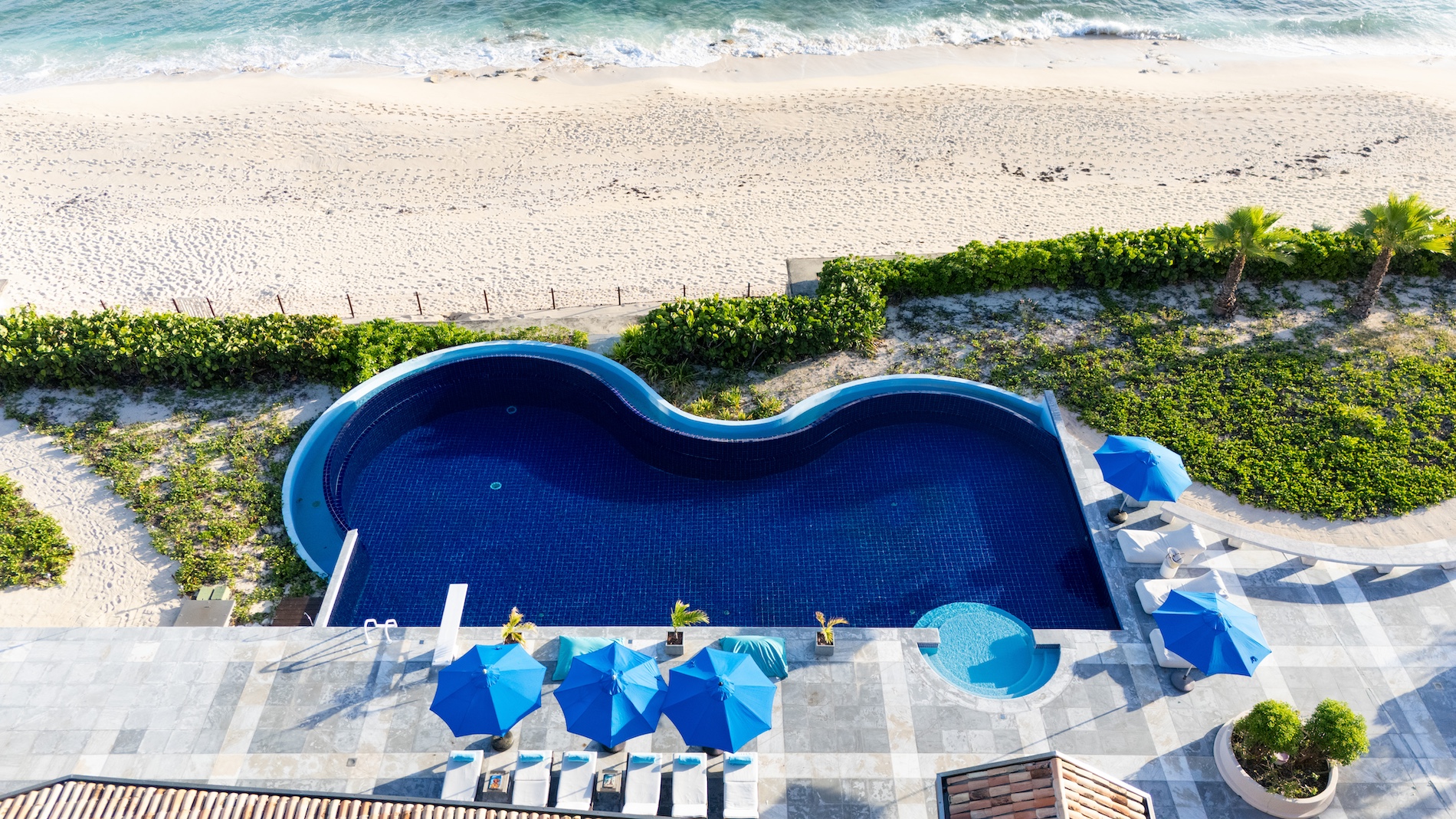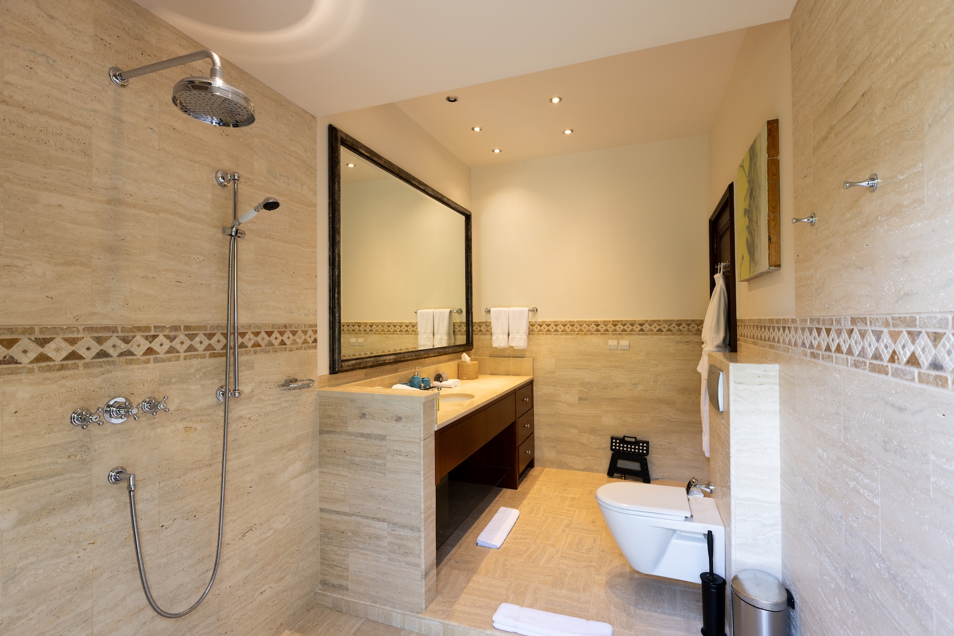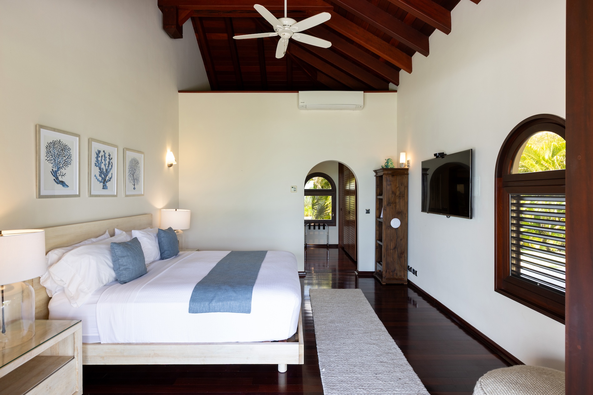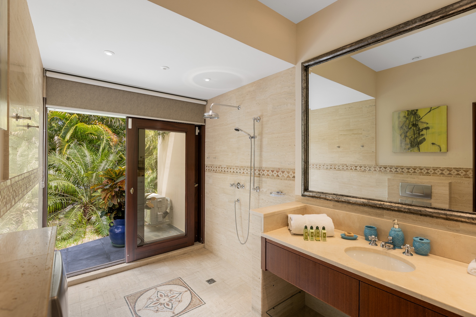 The five bedrooms in Villa Casa de la Playa are strategically laid out to offer beach views and privacy. Each bedroom has its own private access under the covered terrace, allowing you to enjoy the stunning scenery at any time. The master bedroom, located separately from the Great Room, features an en-suite bathroom with a soaking tub and a spacious rain shower, creating a tranquil oasis for relaxation.