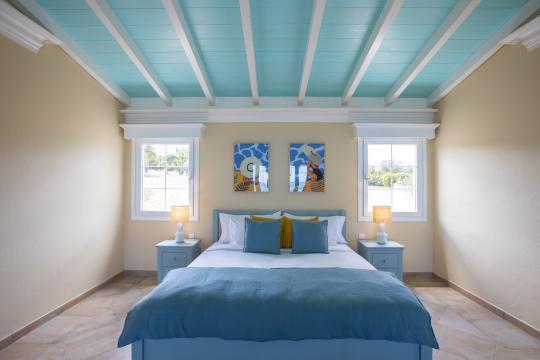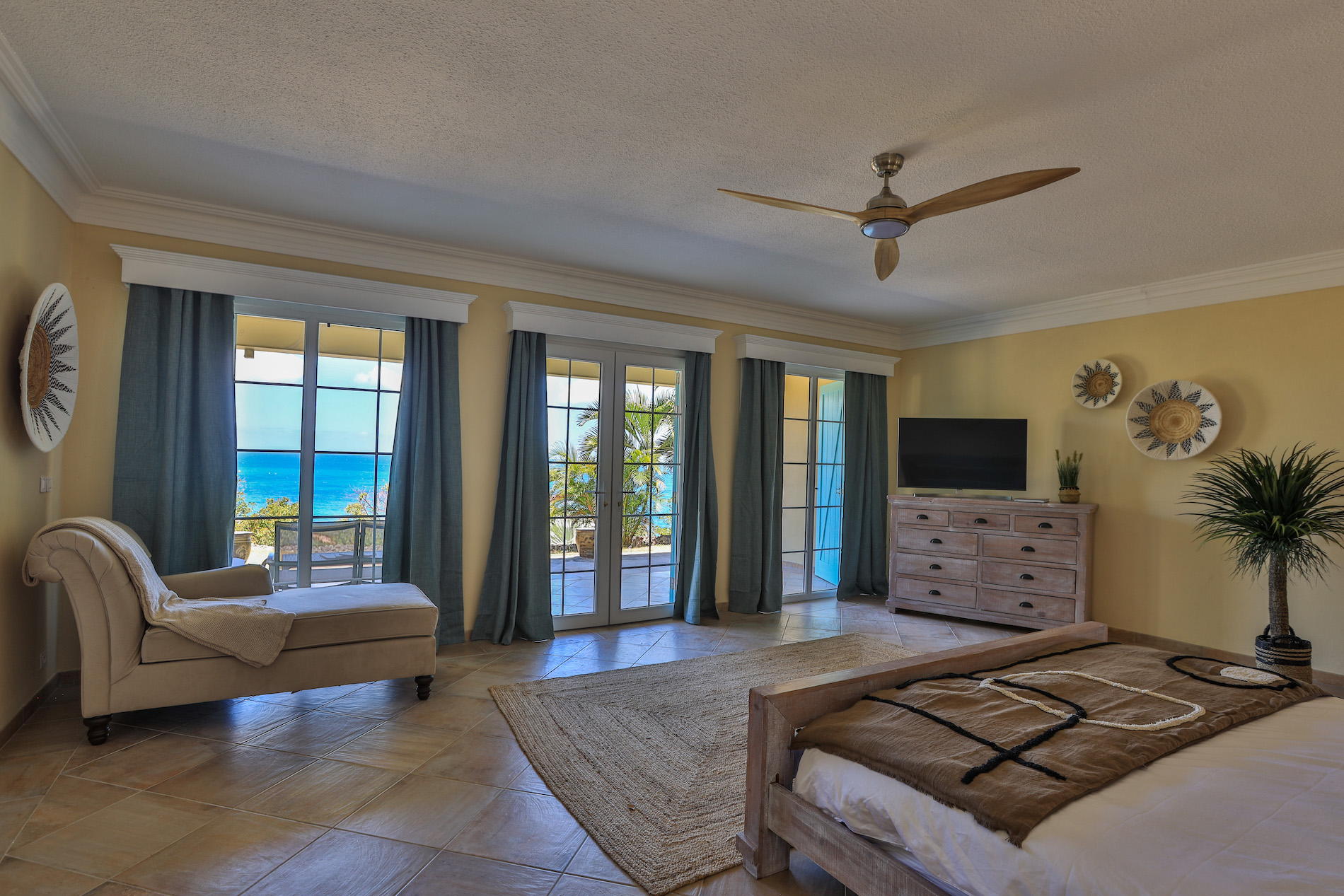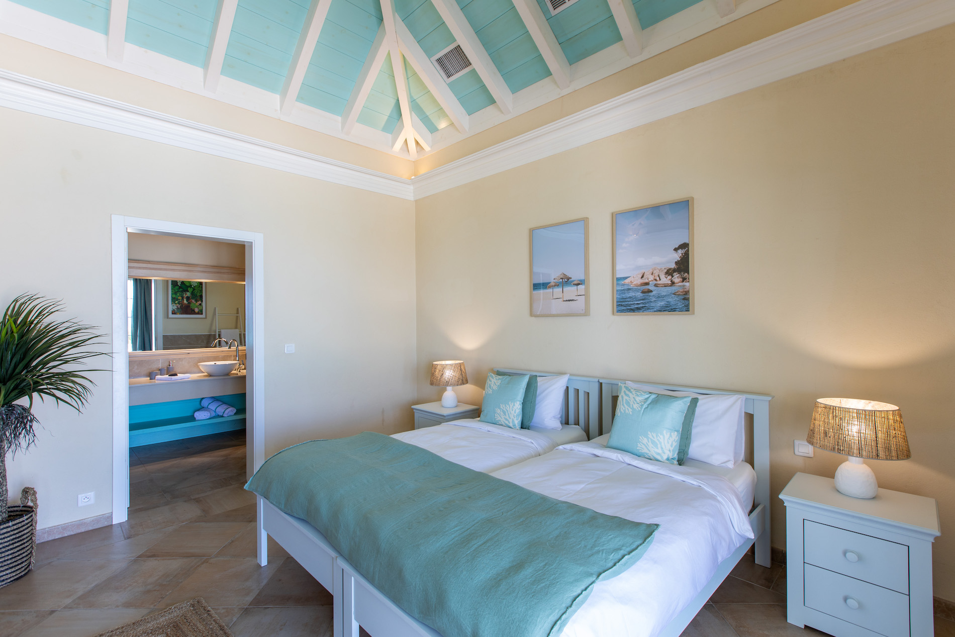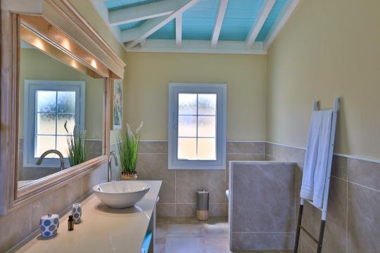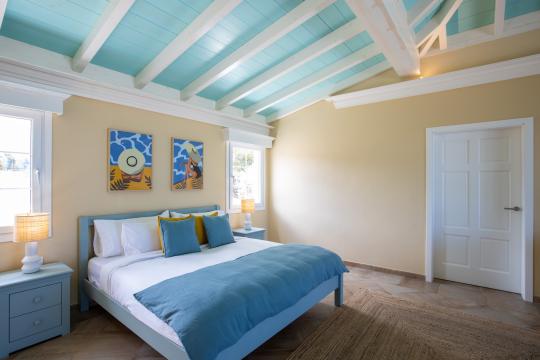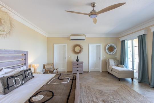 Inside the villa, guests will find a spacious and stylishly decorated living area, with an inviting atmosphere with warm colored decor and furnishings, and modern amenities. The villa features four bedrooms, each with its own en-suite bathroom, offering plenty of privacy and comfort for guests. The bedrooms are air-conditioned and feature quality bedding and linens, ensuring a restful night's sleep. Three of the bedrooms, including the master, are located on the main level giving access to the pool and the terrace. The fourth bedroom is on the lower level, accessible from the outside, offering a little more privacy. An ideal option for those who prefer a little more separation from the main living areas of the villa.