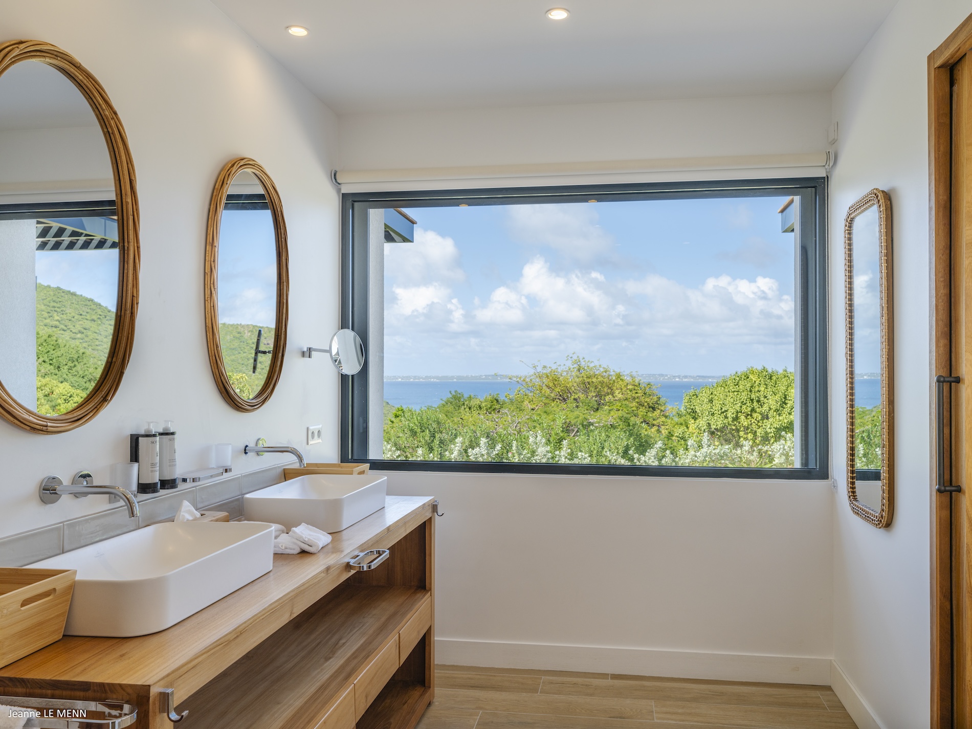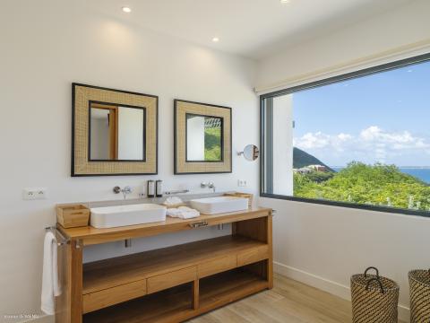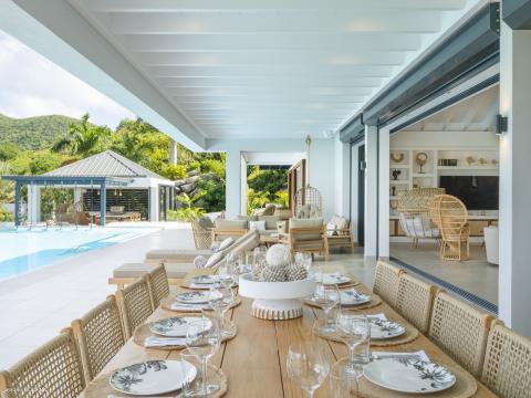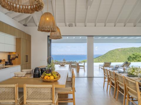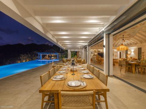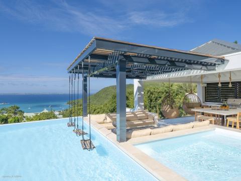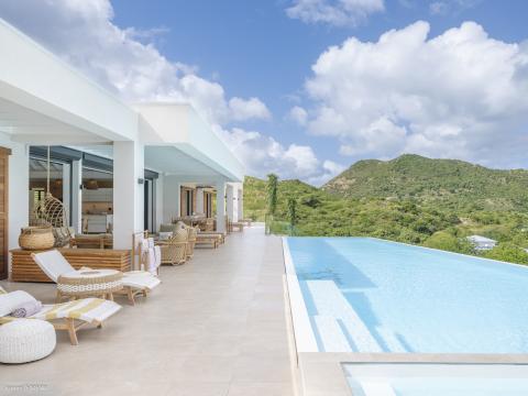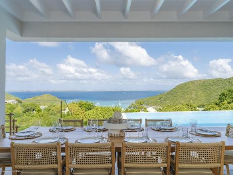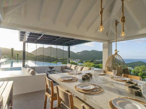 Villa Abaca is an exceptional retreat nestled in the heights of Anse Marcel, offering an idyllic setting where luxury and comfort blend seamlessly. This sumptuous five-bedroom residence captivates with its elegance and its openness to the ocean, providing breathtaking views from both the shared living spaces and the private suites.