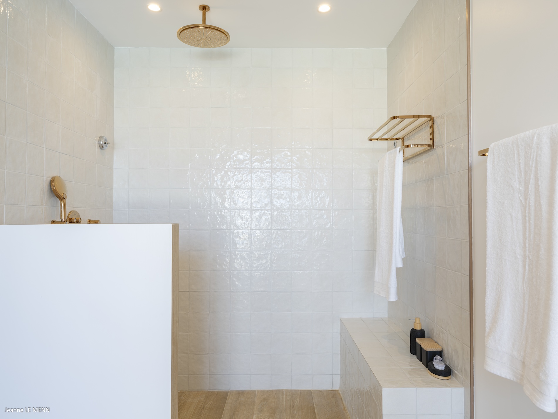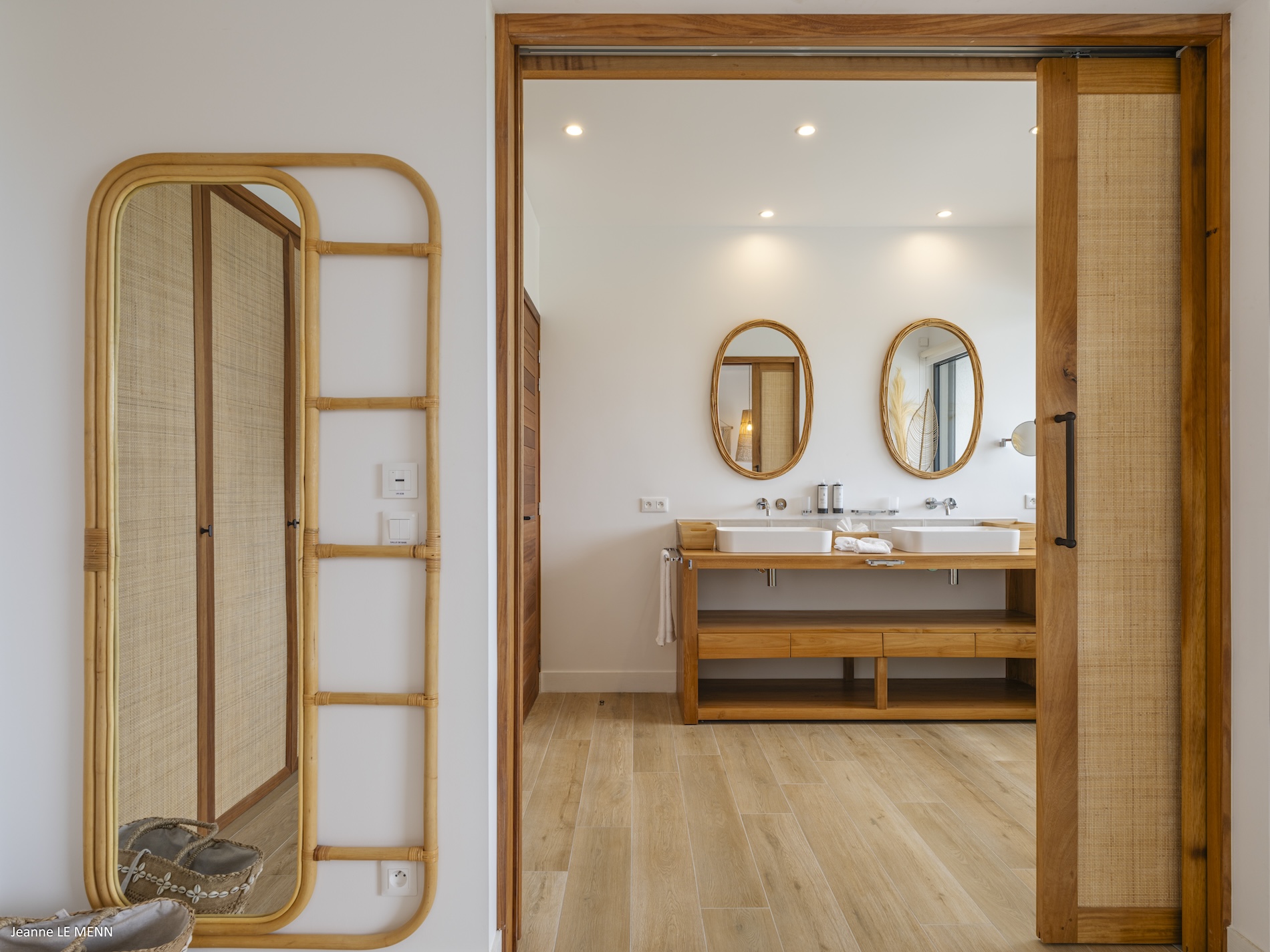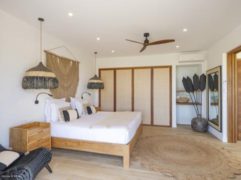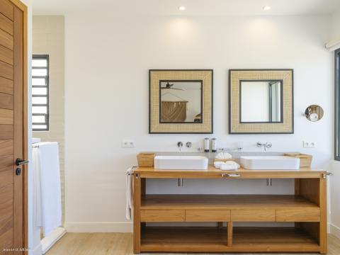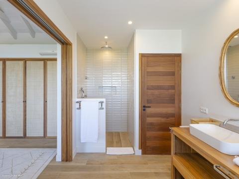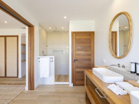 The five bedrooms, all offering unobstructed views of the horizon, ensure complete privacy. Three are located on the same level as the main living area and terrace, providing convenient access and a seamless indoor-outdoor flow. A small staircase beside the pool leads to two additional bedrooms, each opening onto a private terrace, ideal for enjoying the sun in a serene setting. Every bedroom is equipped with its own bright, en-suite bathroom, ensuring optimal comfort and well-being. The master suite is distinguished by its walk-in closet, thoughtfully designed to enhance the overall luxury experience.