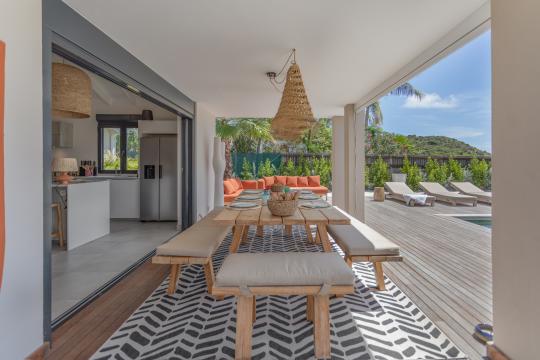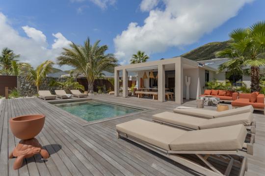 From the moment you arrive, natural light floods the living spaces through large sliding glass doors that extend the interior toward the outdoors. The spacious living room invites relaxation, while the terrace offers a true outdoor living experience, blending conviviality and serenity. A shaded dining area awaits for leisurely seaside lunches, while the outdoor lounges are ideal for unwinding or enjoying sunset cocktails. Under the gazebo, let the sea breeze lull you as you admire the distant islands of Pinel and St. Barts on the horizon.
