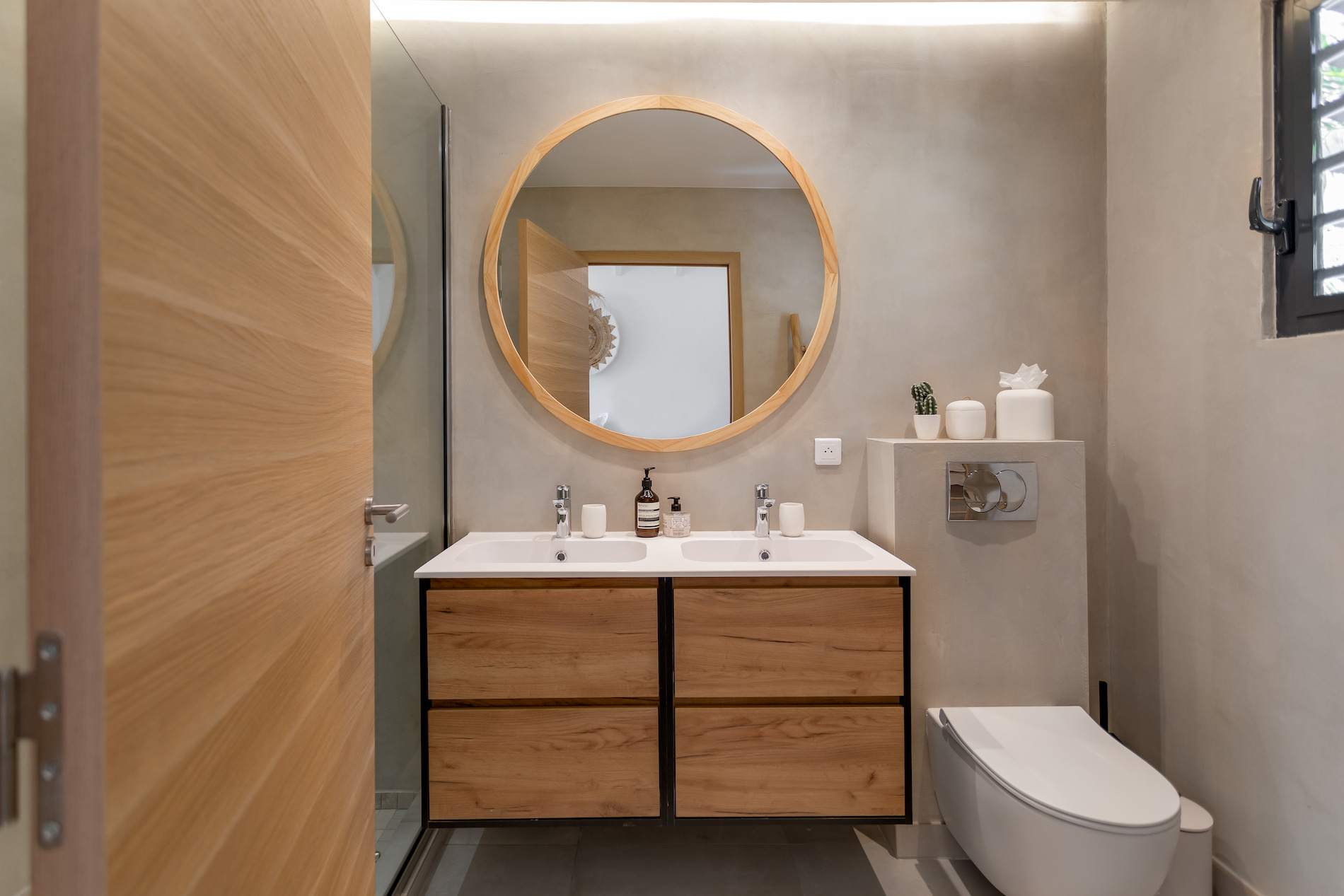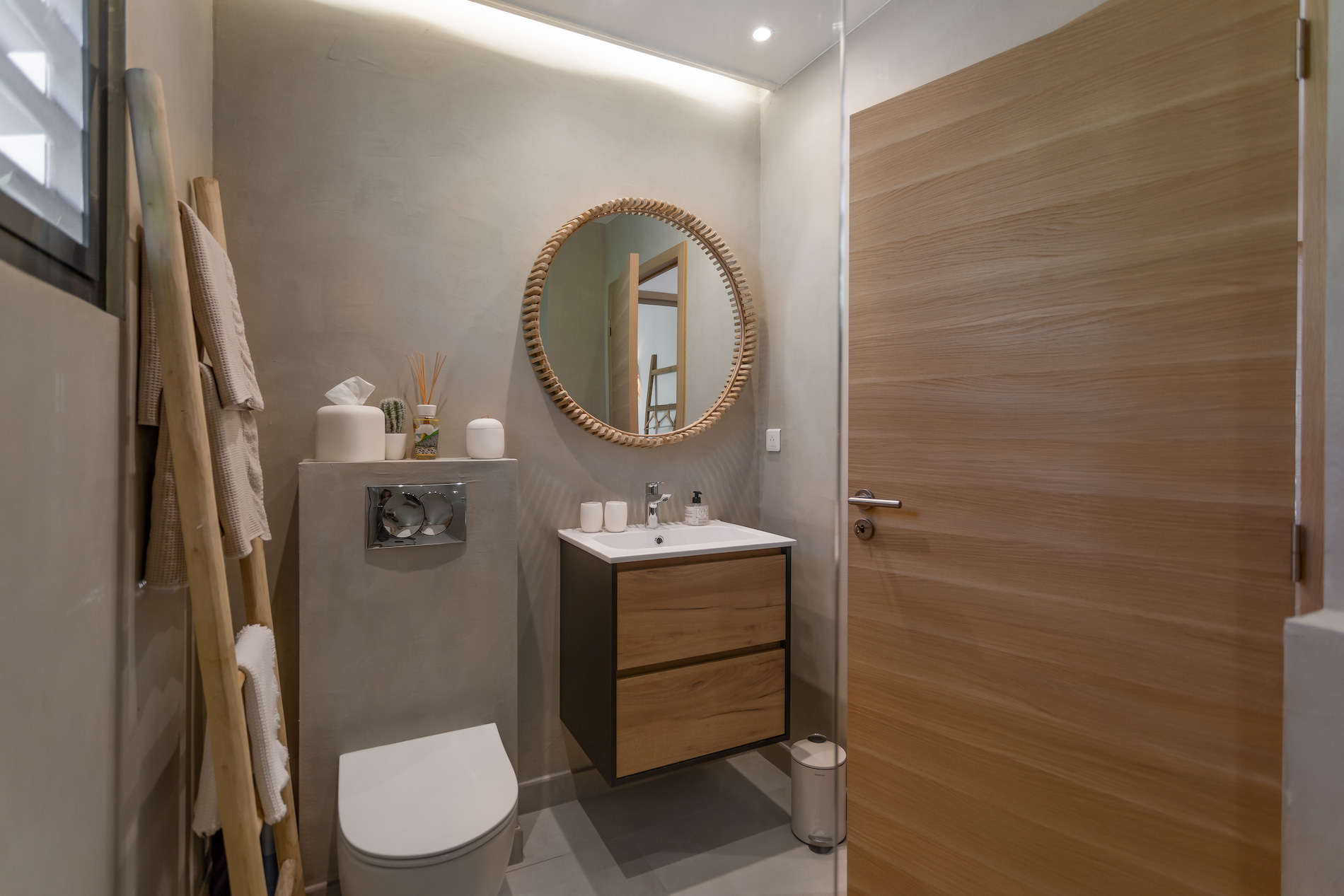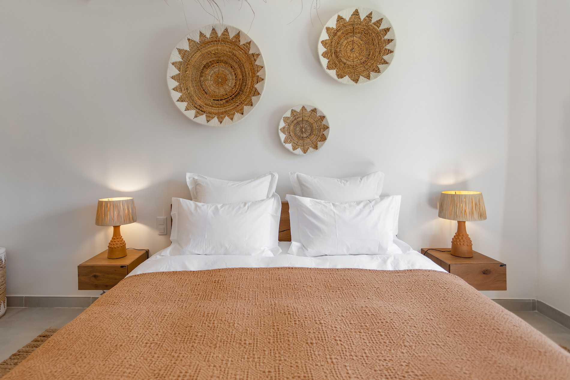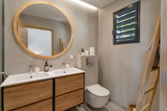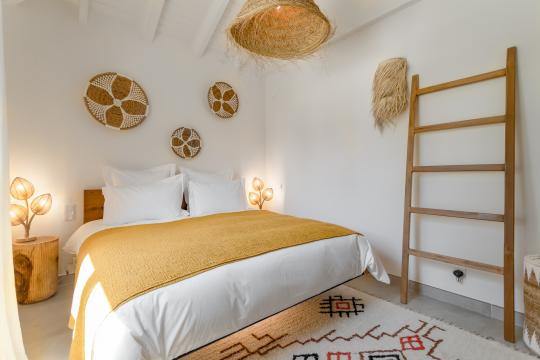 When it’s time to rest, the villa features three spacious bedrooms, each designed with comfort and tranquility in mind. The elegant and bright master suite boasts a king-size bed, an en-suite bathroom, and stunning sea views. The two additional bedrooms, both with king-size beds as well, share a modern bathroom. One of them opens directly to the outside, offering early risers the privilege of waking up to the sunrise over the bay.
