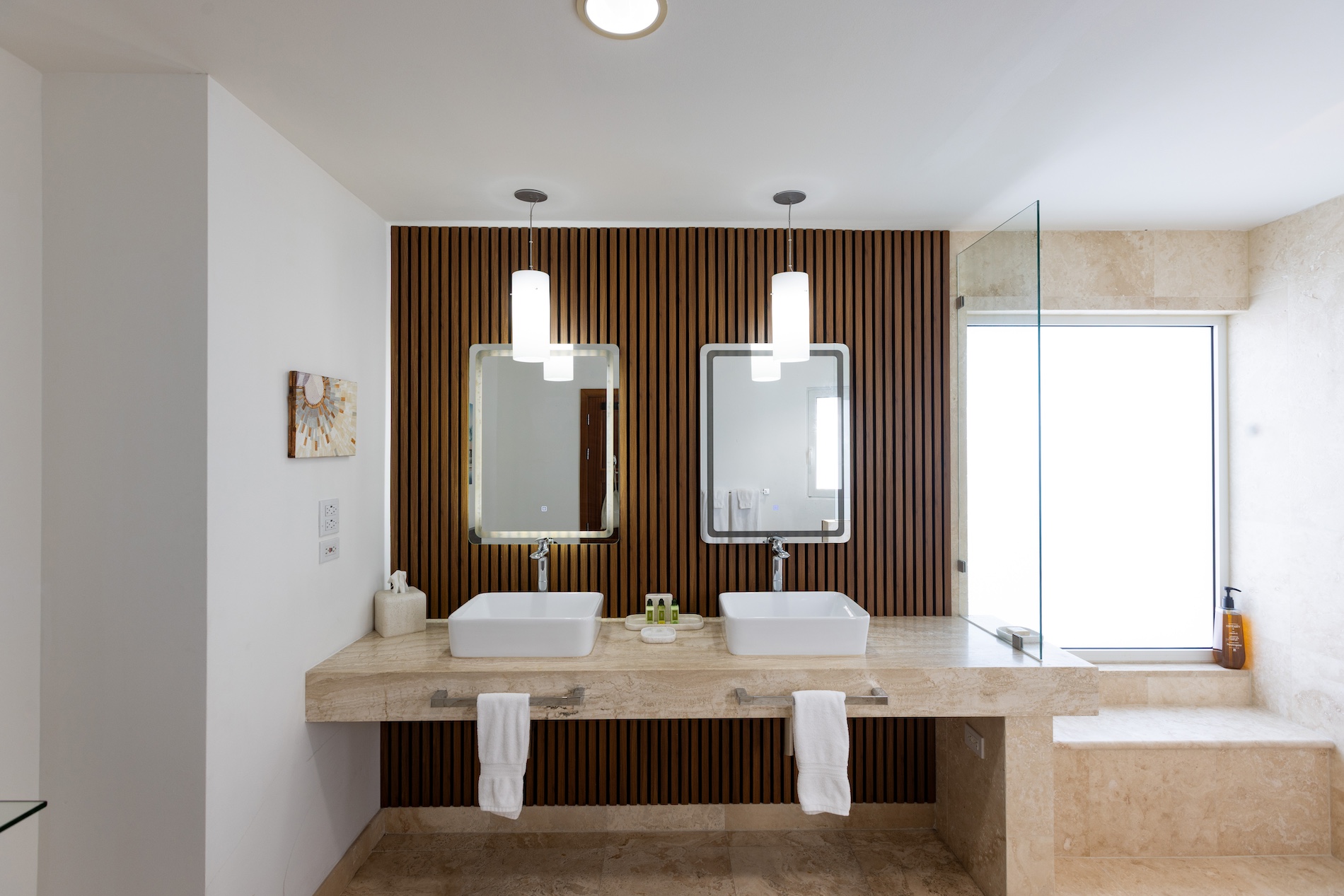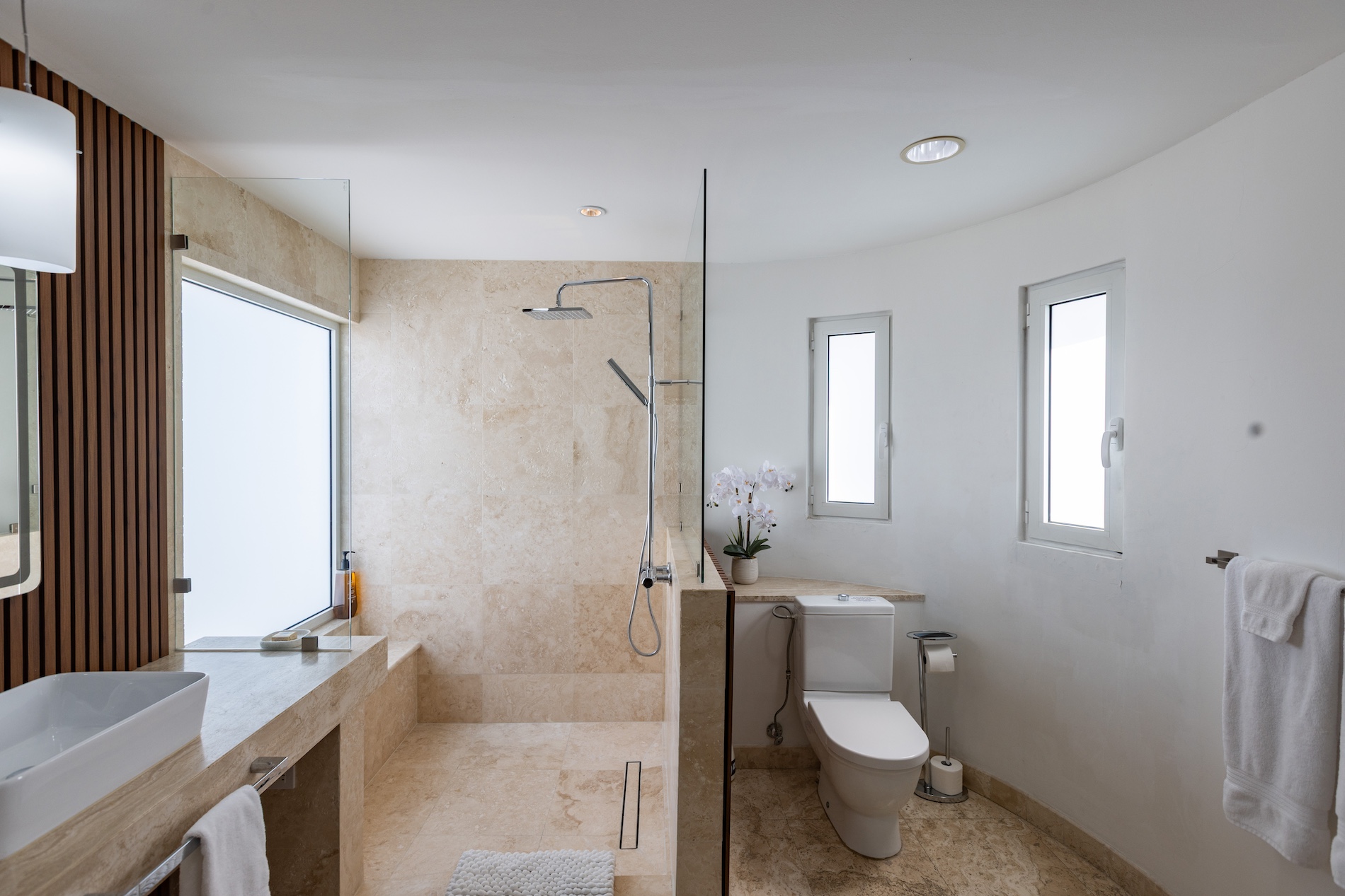 Spread over two levels, this elegant villa features three bedrooms with en-suite bathrooms, designed to provide both comfort and privacy for its guests. On the main level, the first bedroom offers a king-size bed, an en-suite bathroom, and direct access to the terrace, allowing guests to easily enjoy the outdoor living spaces and ocean views.