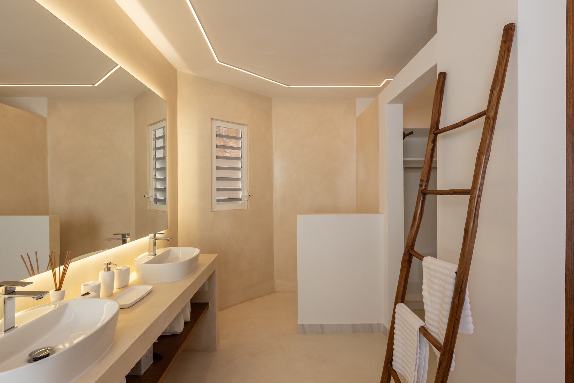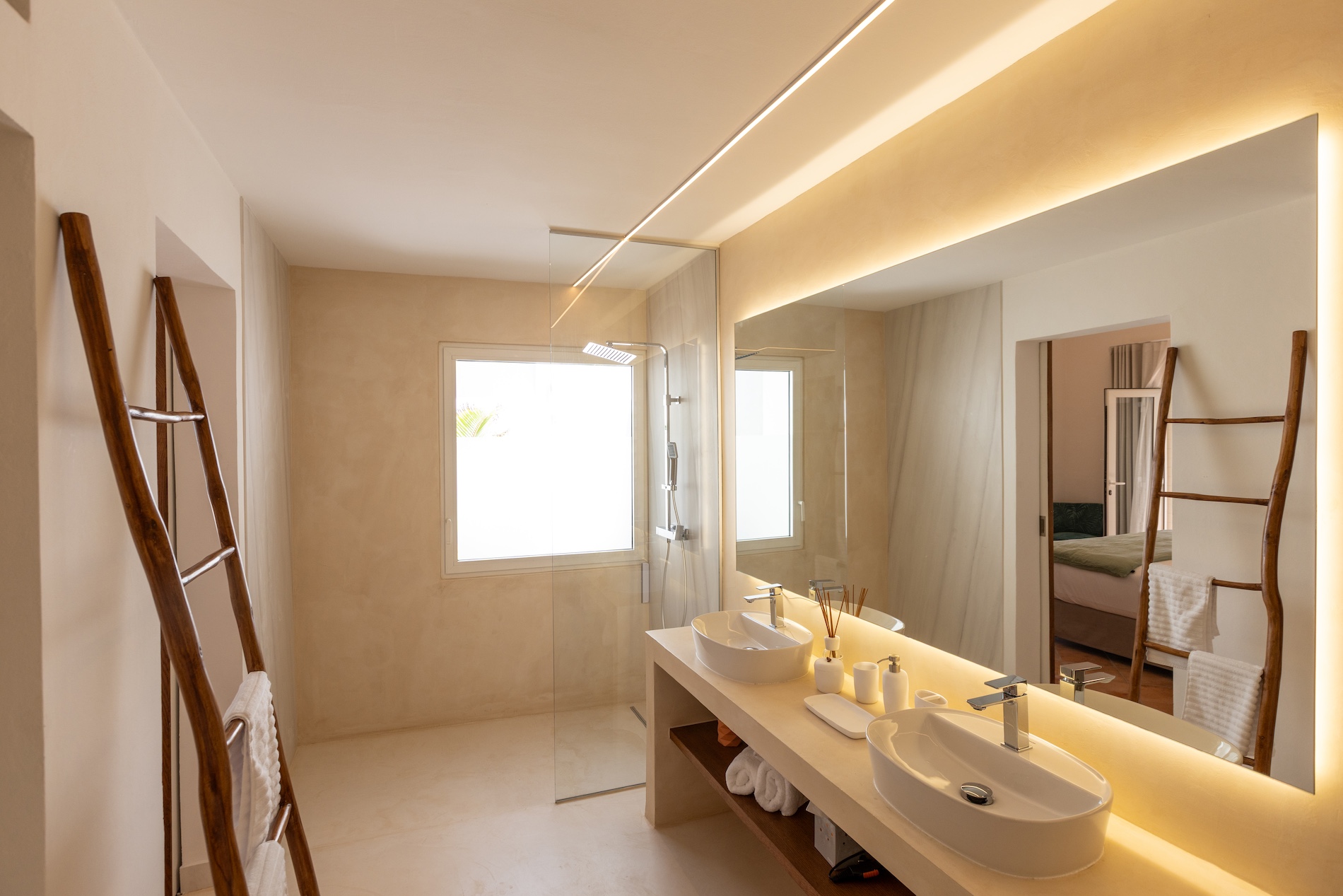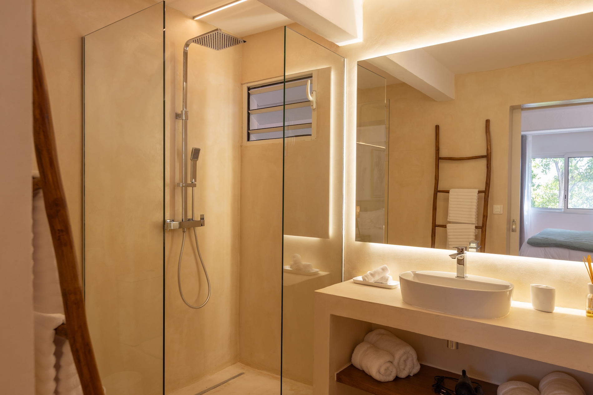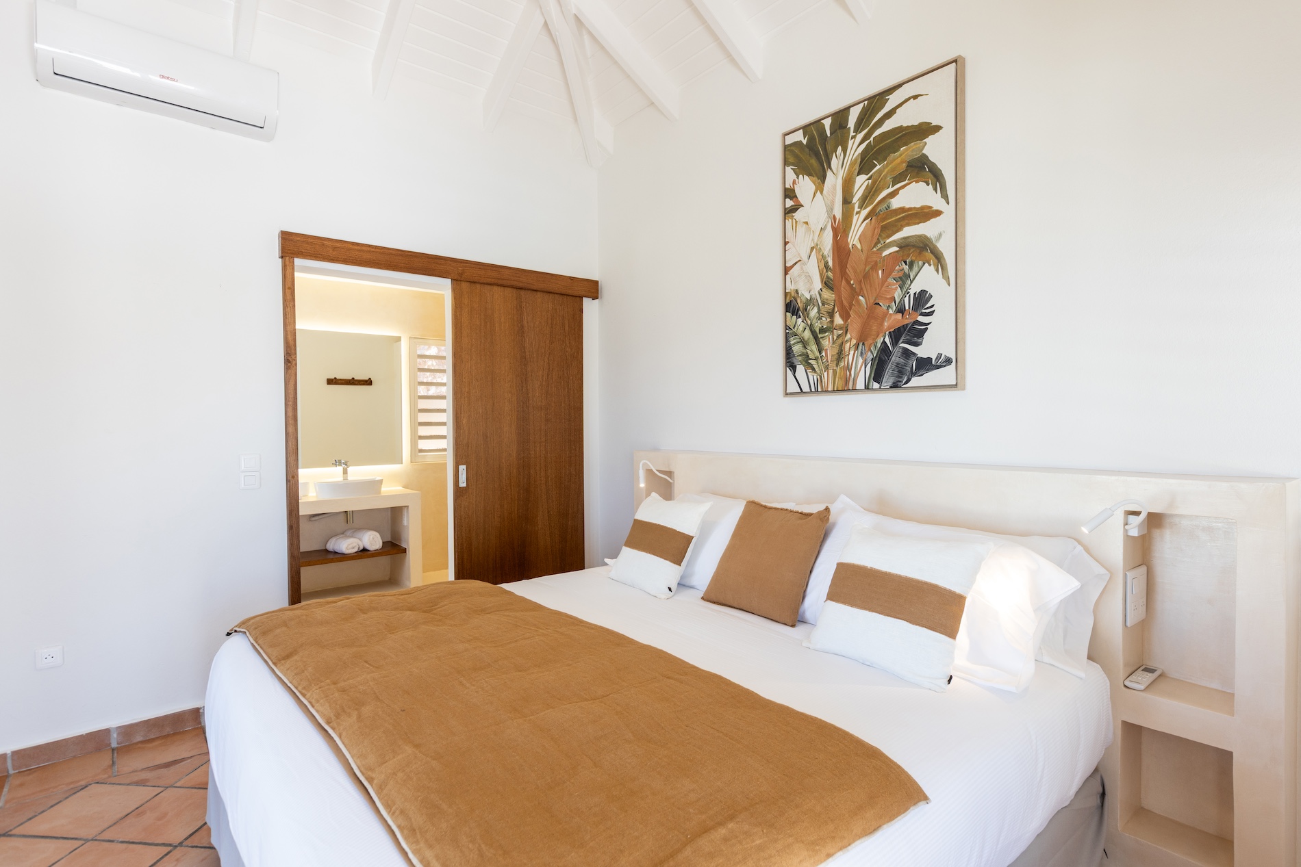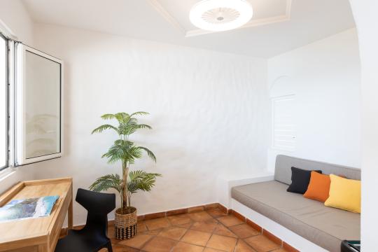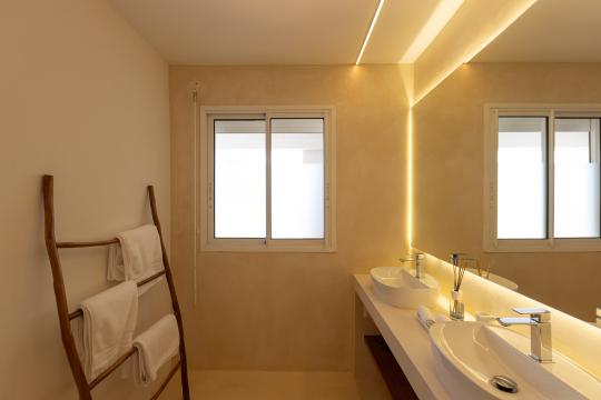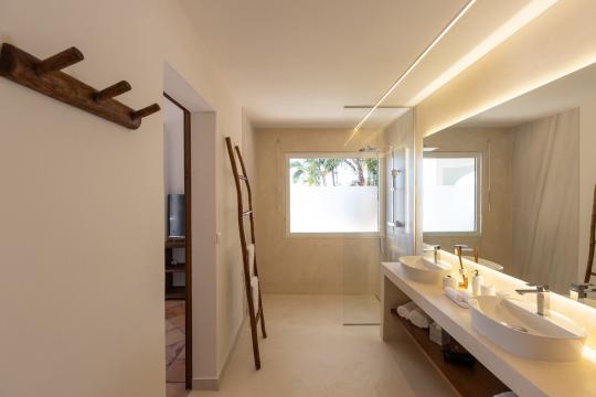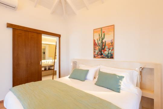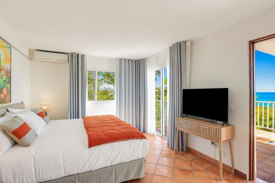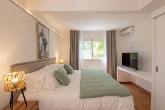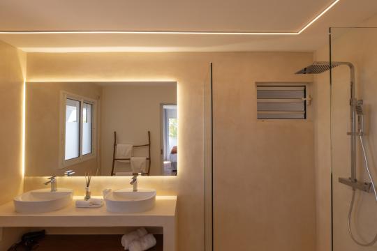 Spread over two levels, the villa features spacious bedrooms, each equipped with a king-size bed. Three of the bedrooms are located on the main level, close to the kitchen and living room, while the other two are situated on the lower level. Each bedroom has its own modern and refined en-suite bathroom. For your comfort, all rooms are equipped with smart TVs, ideal for unwinding in the evening.