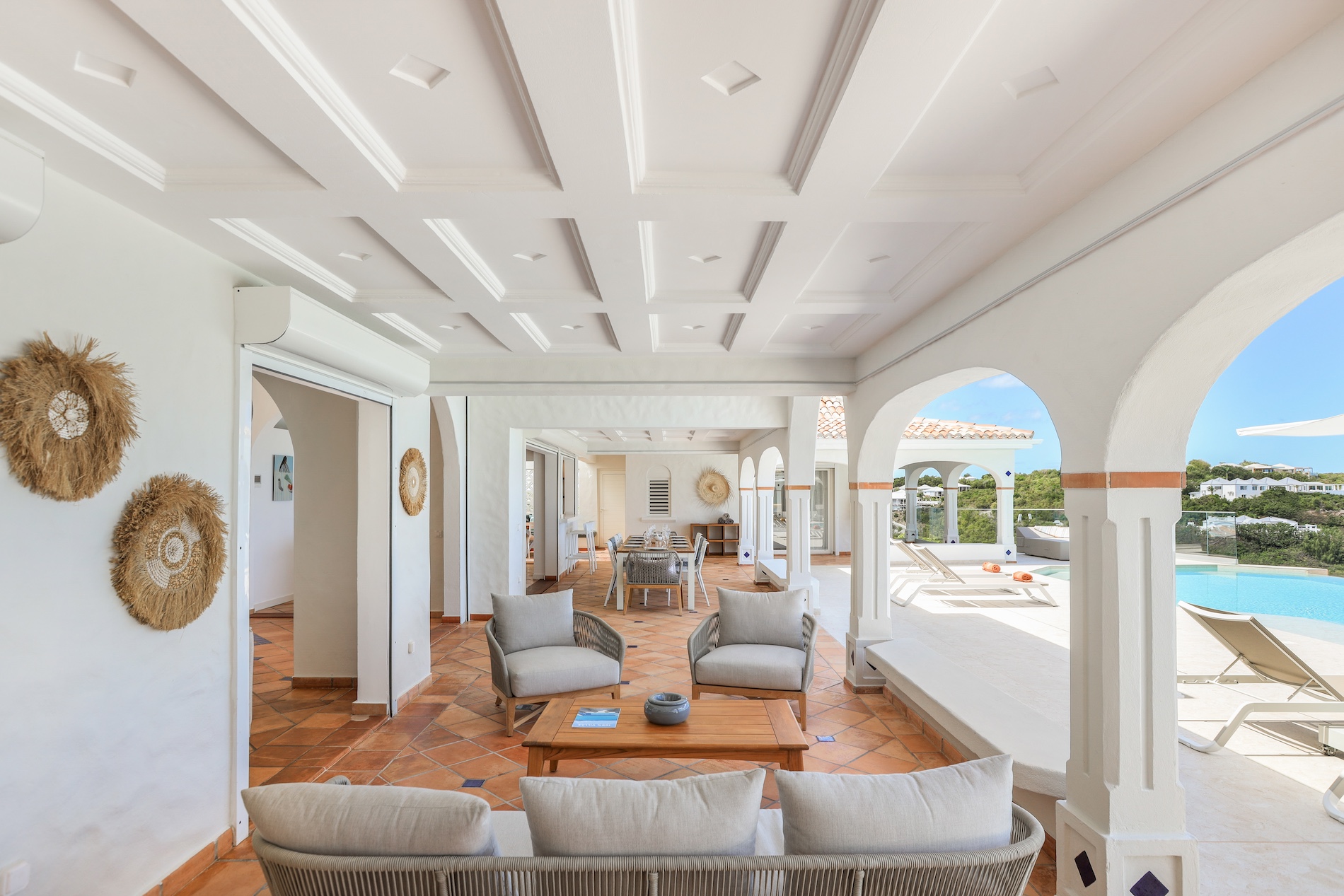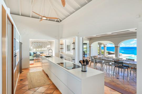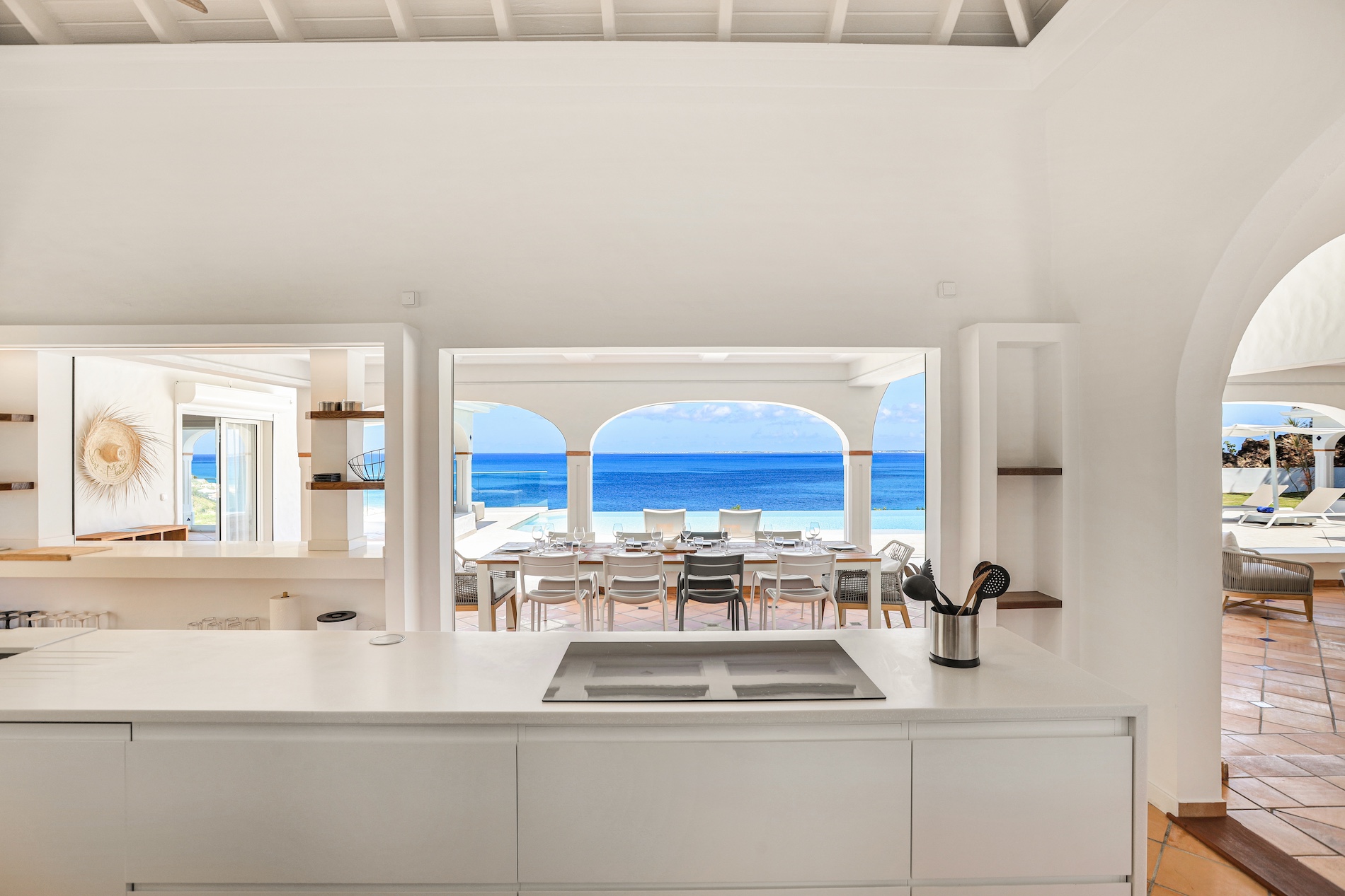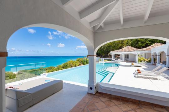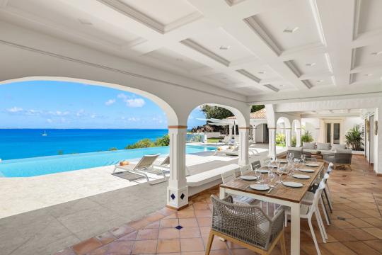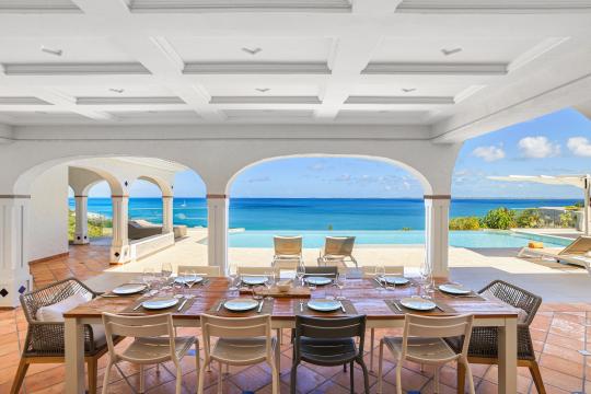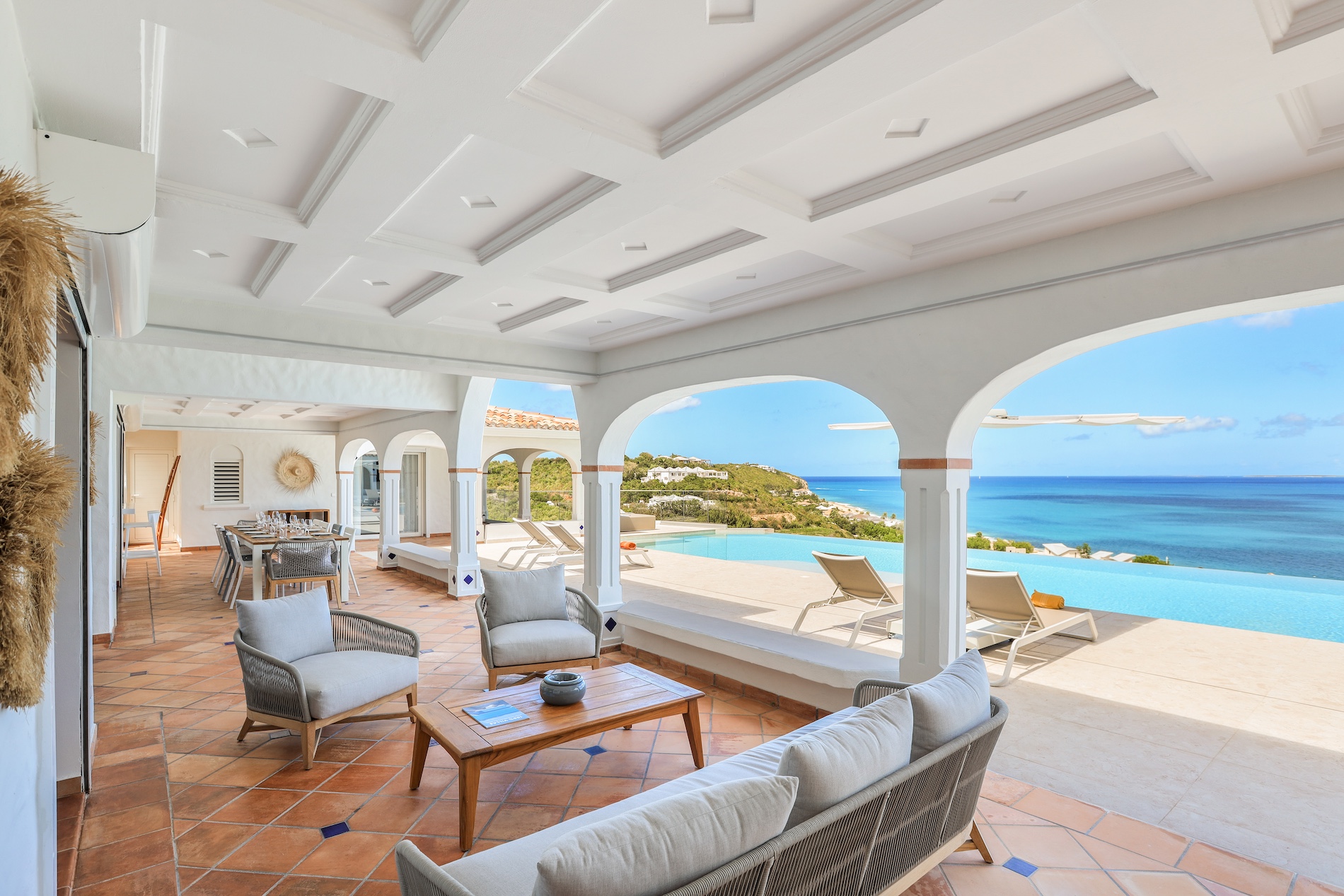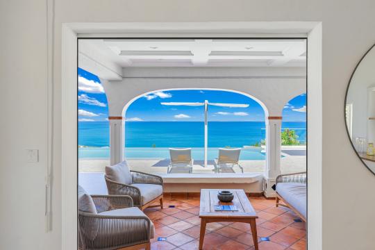 The heated infinity pool invites you to unwind while offering unobstructed views of the ocean and Anguilla Island. The outdoor spaces, including a sun-drenched terrace and a cozy lounge area, are perfect for enjoying al fresco meals or simply relaxing.