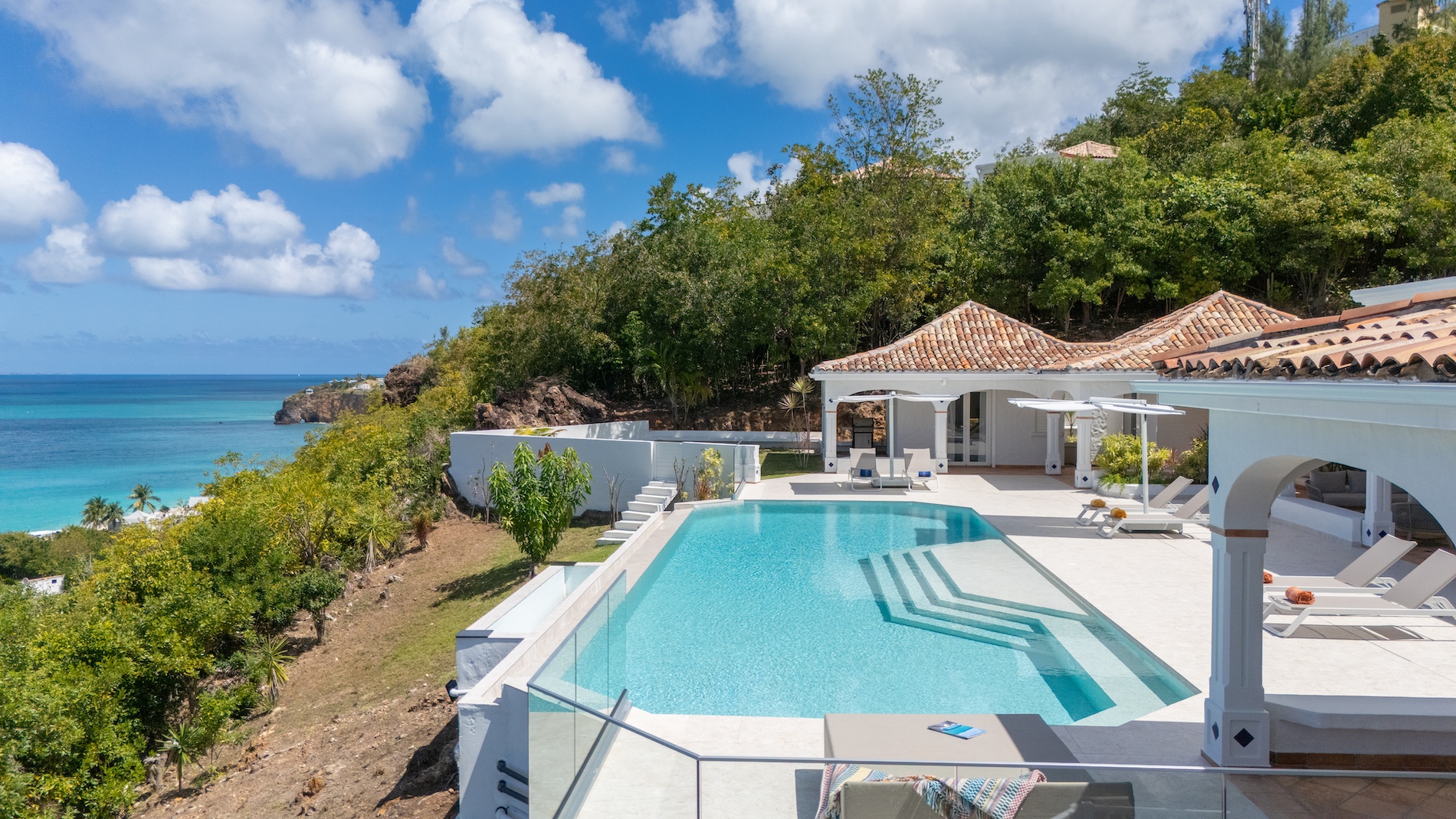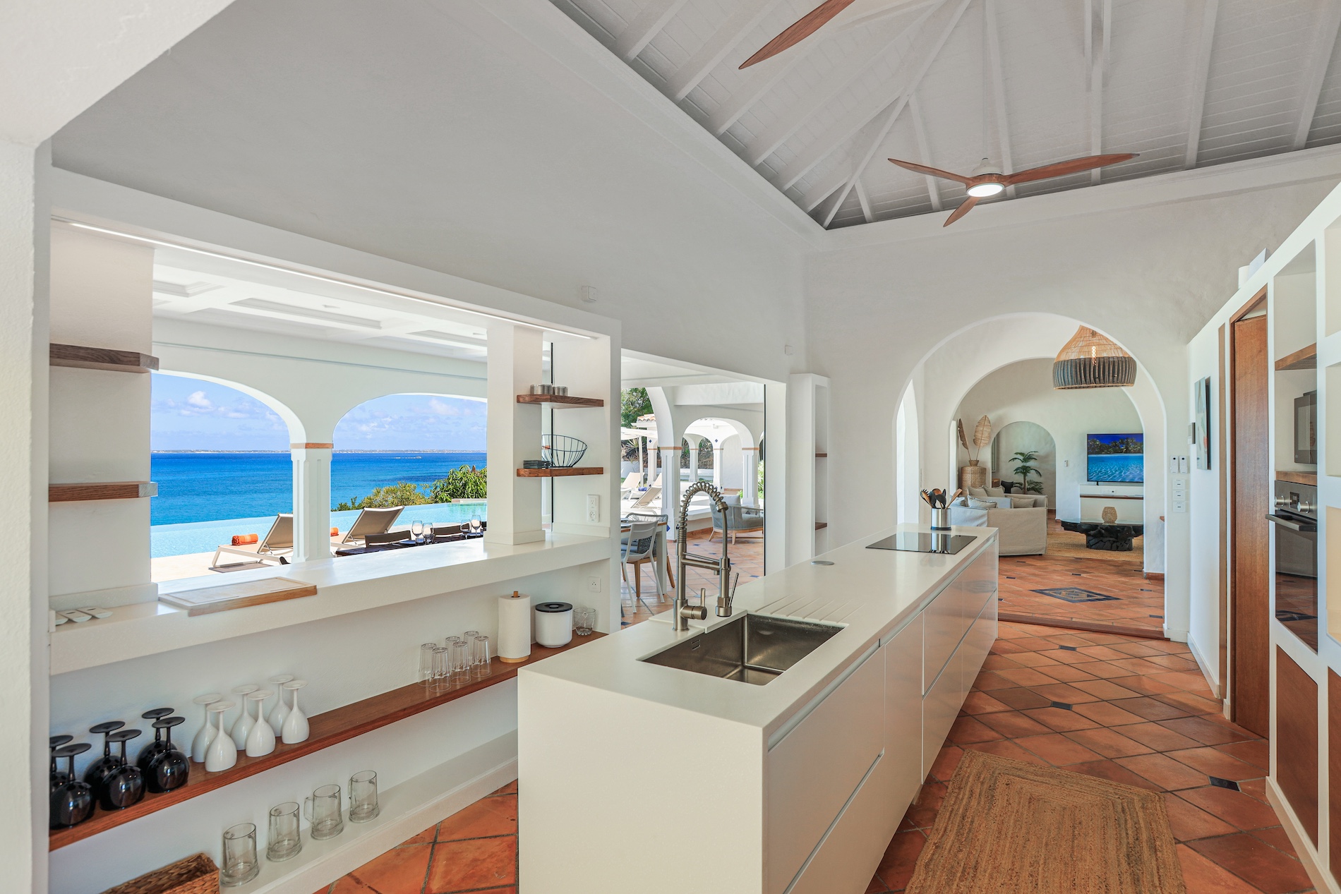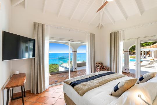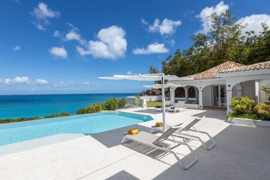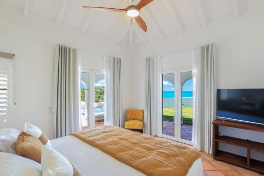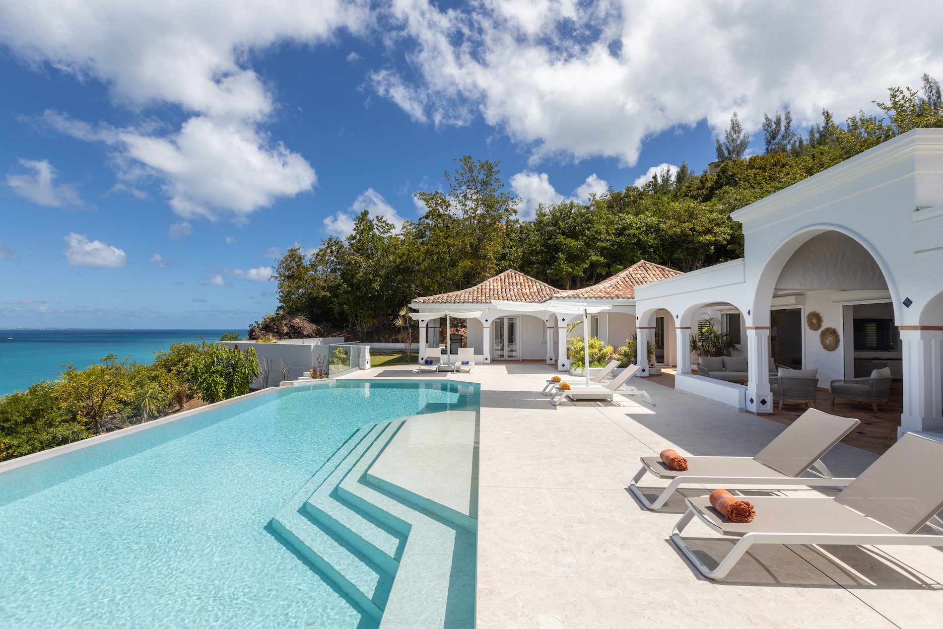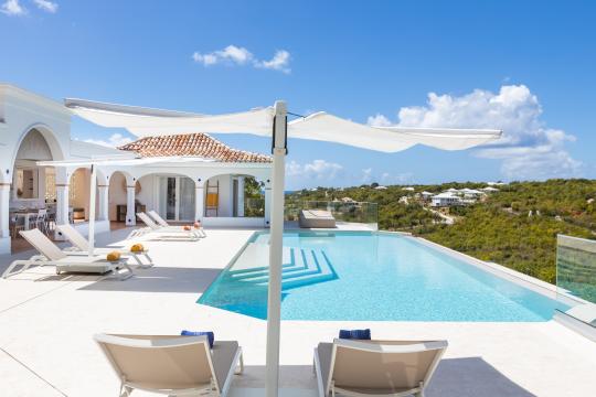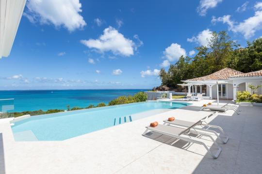 The heated infinity pool invites you to unwind while offering unobstructed views of the ocean and Anguilla Island. The outdoor spaces, including a sun-drenched terrace and a cozy lounge area, are perfect for enjoying al fresco meals or simply relaxing.