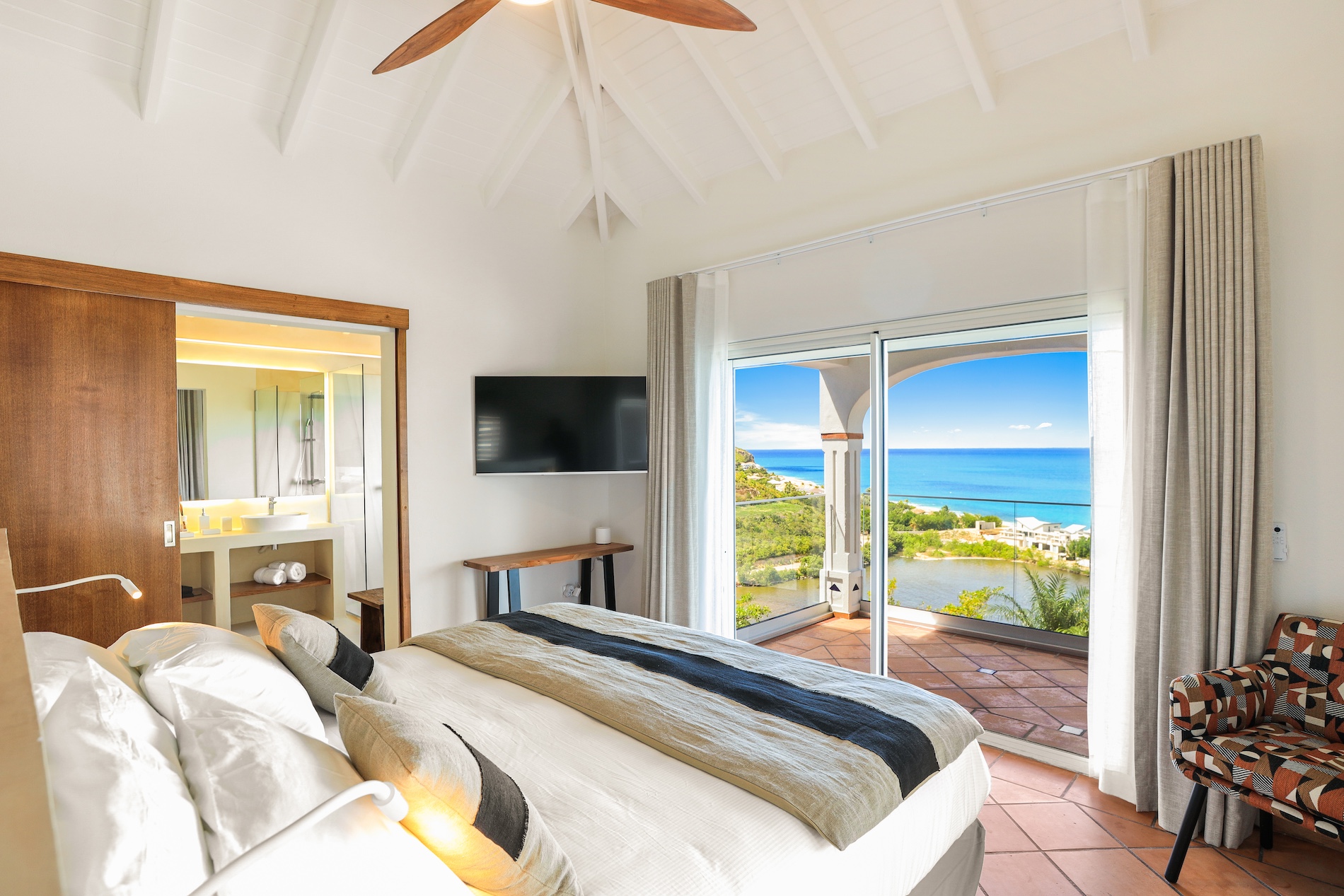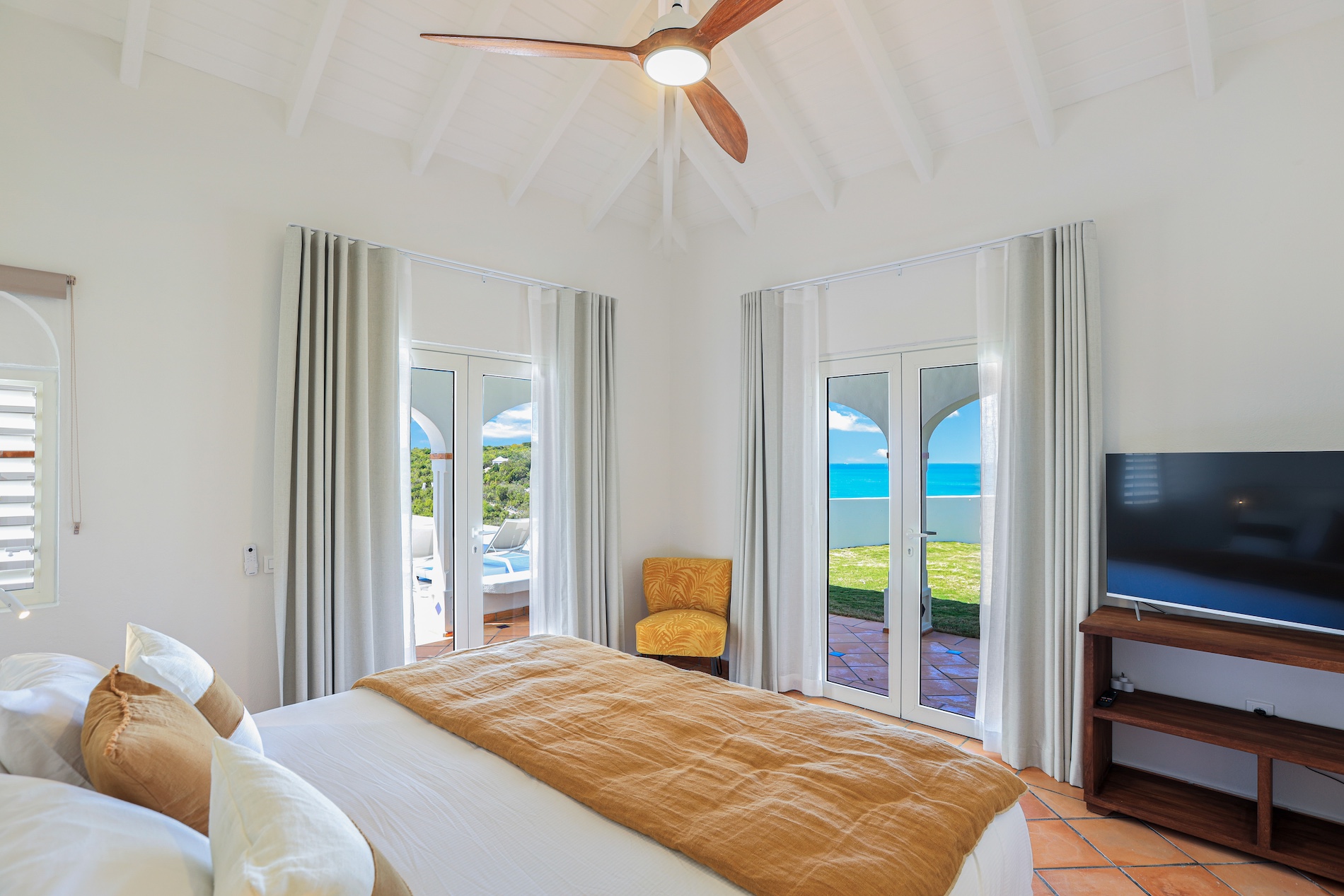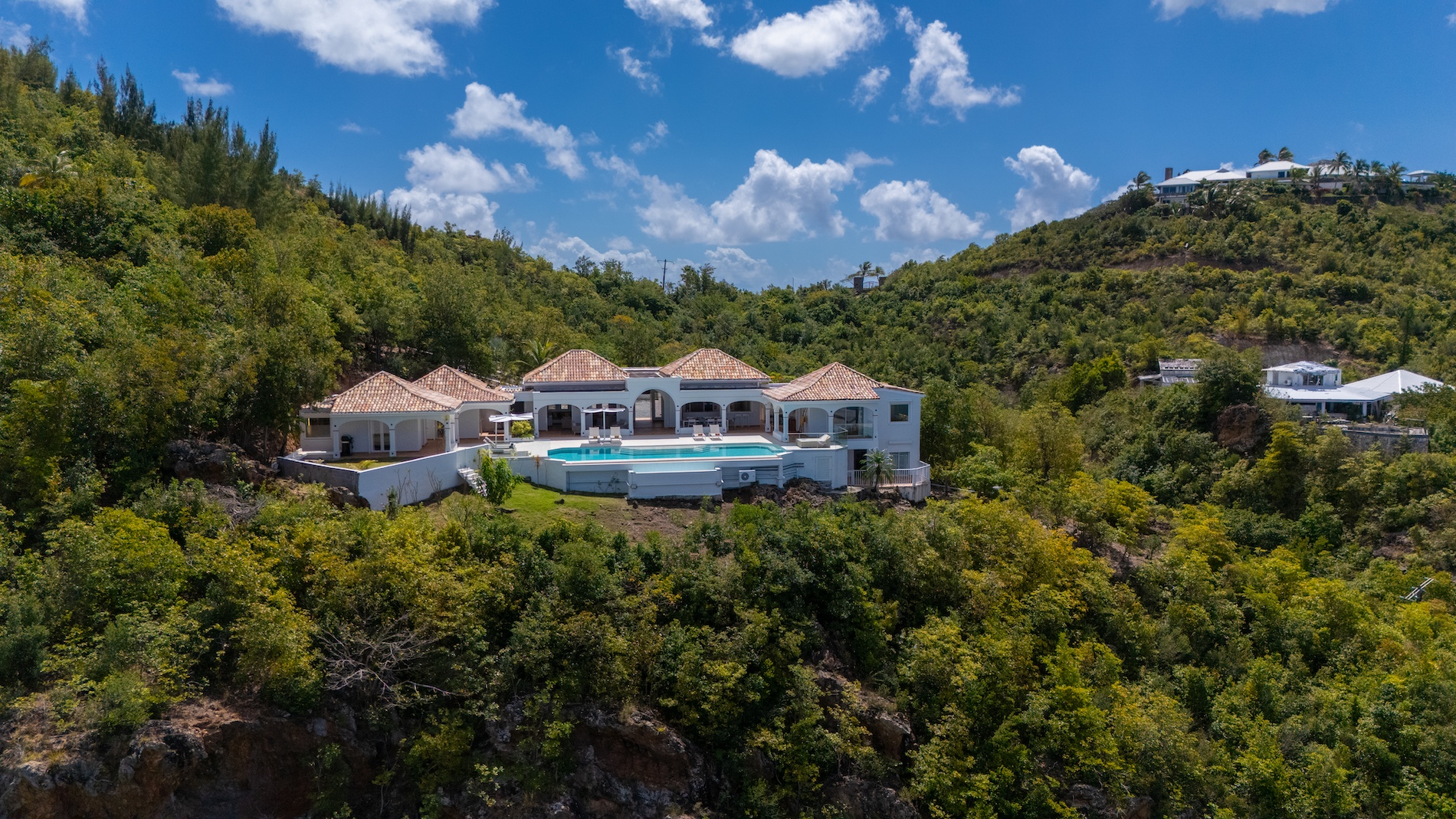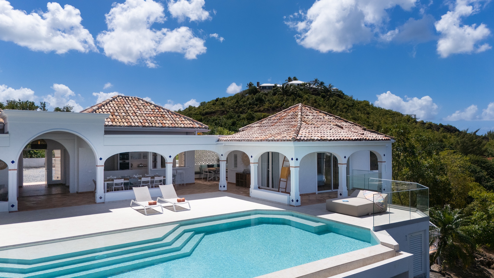 The heated infinity pool invites you to unwind while offering unobstructed views of the ocean and Anguilla Island. The outdoor spaces, including a sun-drenched terrace and a cozy lounge area, are perfect for enjoying al fresco meals or simply relaxing.