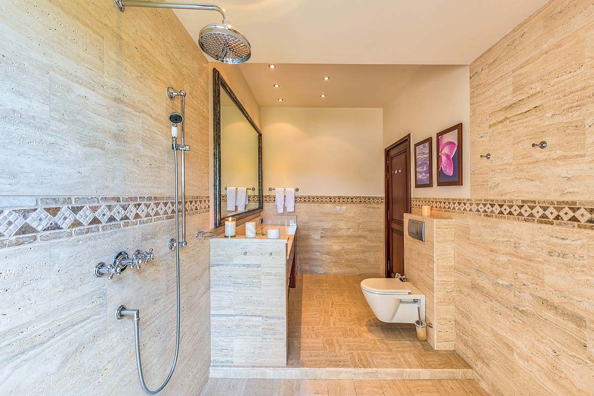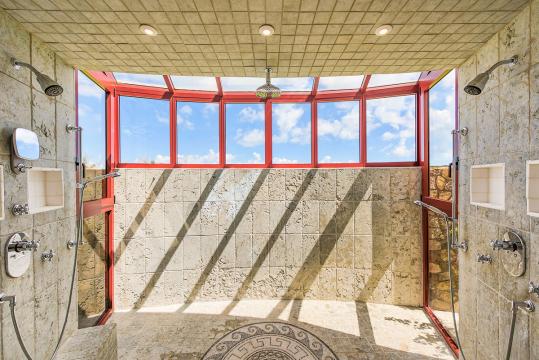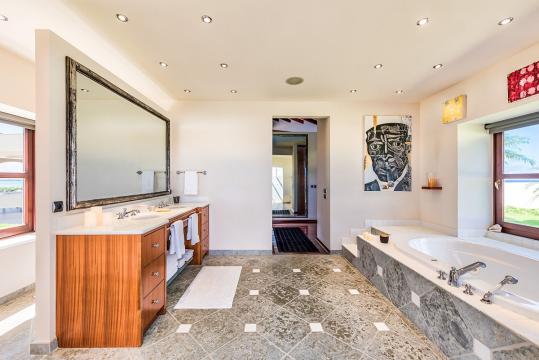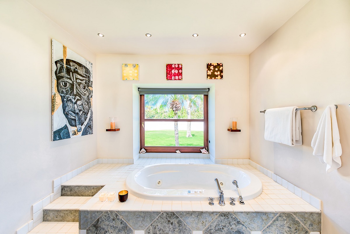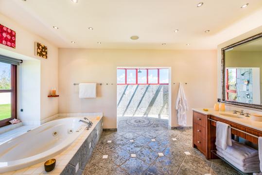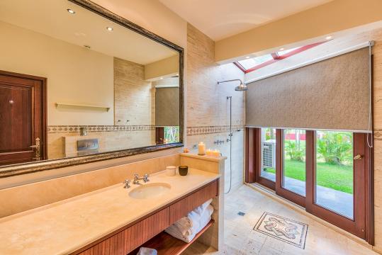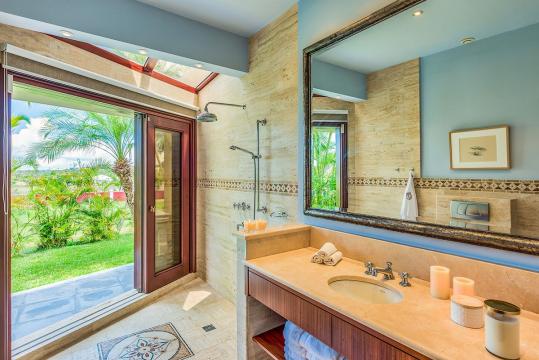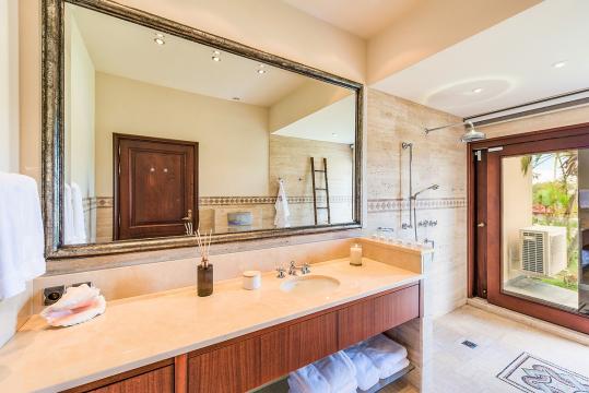 The five bedrooms in Villa Casa de la Playa are strategically laid out to offer beach views and privacy. Each bedroom has its own private access under the covered terrace, allowing you to enjoy the stunning scenery at any time. The master bedroom, located separately from the Great Room, features an en-suite bathroom with a soaking tub and a spacious rain shower, creating a tranquil oasis for relaxation.
