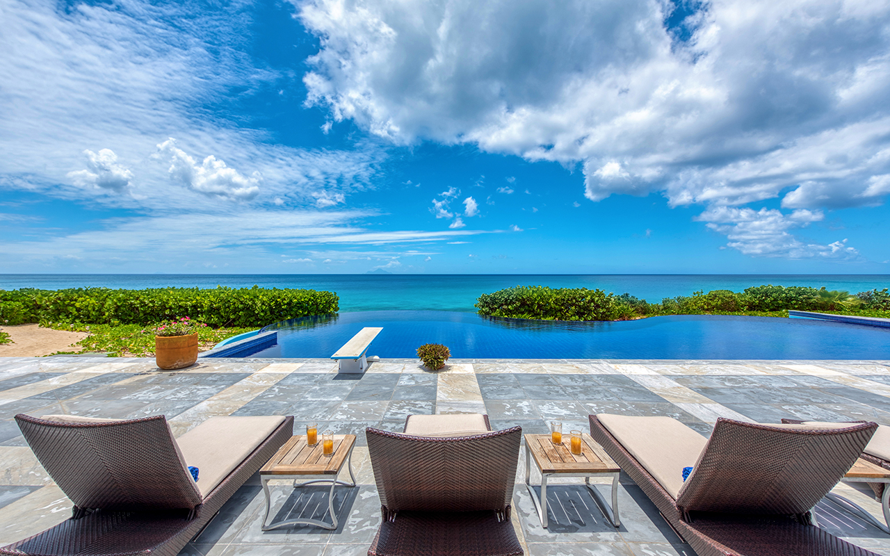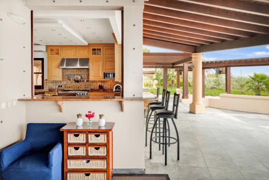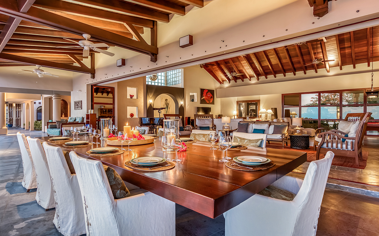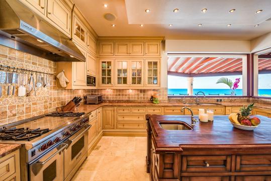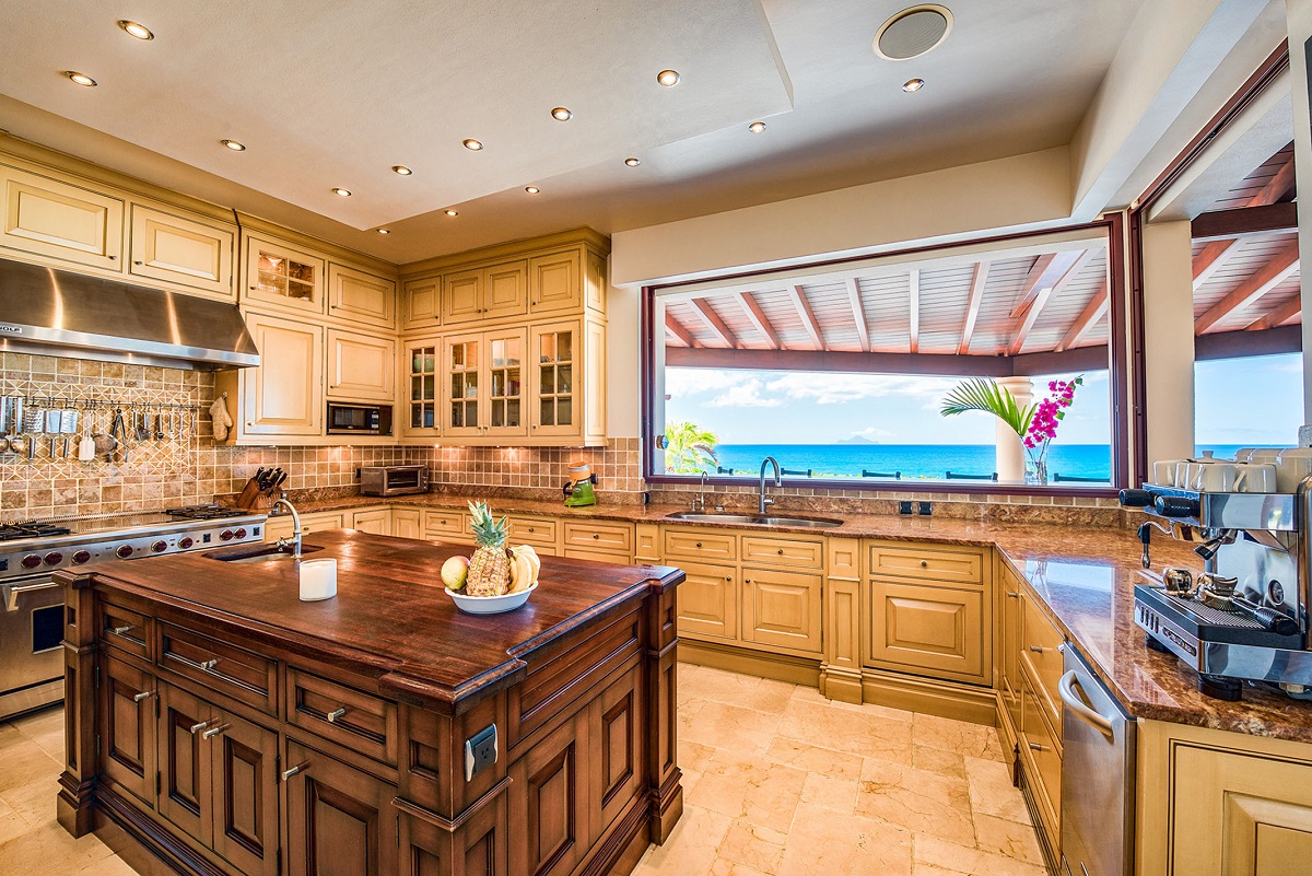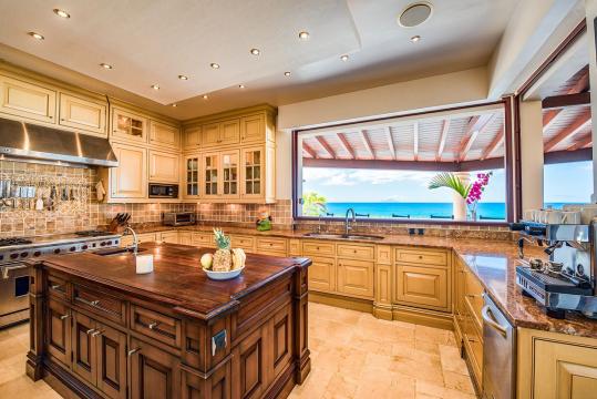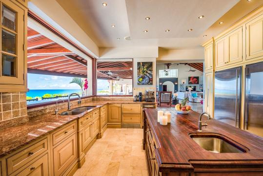 The large gourmet kitchen, attached to the Great Room, is a chef's dream. Guests may choose to enjoy the villa with or without chef service, depending on their preference. When included, the in-house Chef prepares three meals per day : breakfast, lunch, and dinner - cost of food and beverages additional.