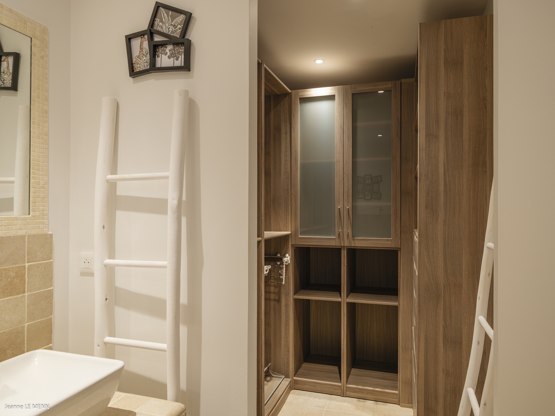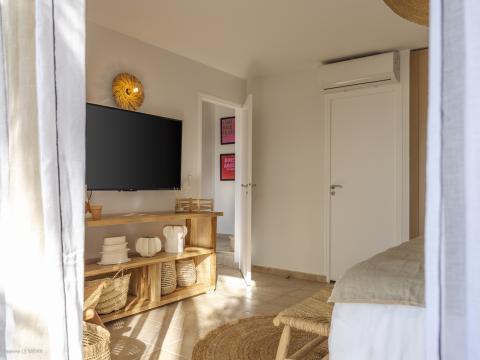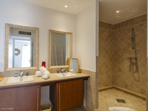 The lower floor features two beautifully decorated bedrooms with direct access to a private pool. Imagine savoring a quiet moment by the water, gently caressed by the sea breeze. Each bedroom is equipped with an en-suite bathroom, guaranteeing a stay marked by privacy and tranquility.