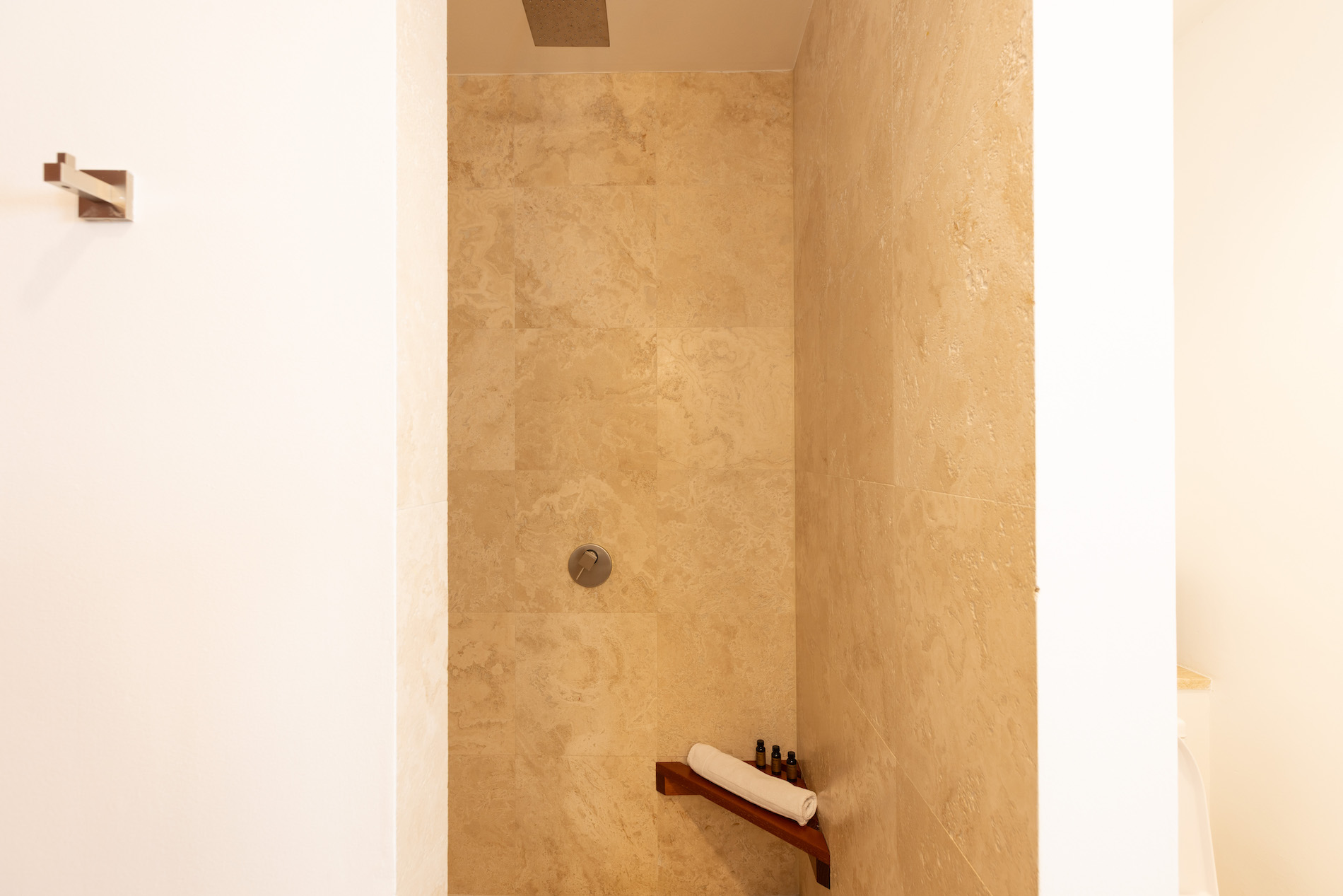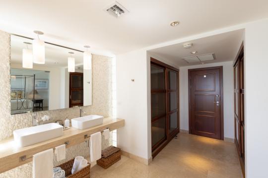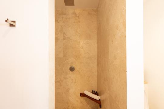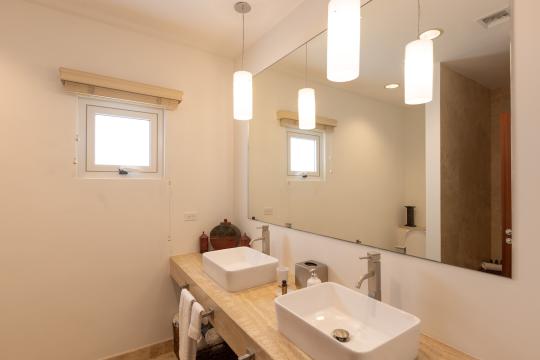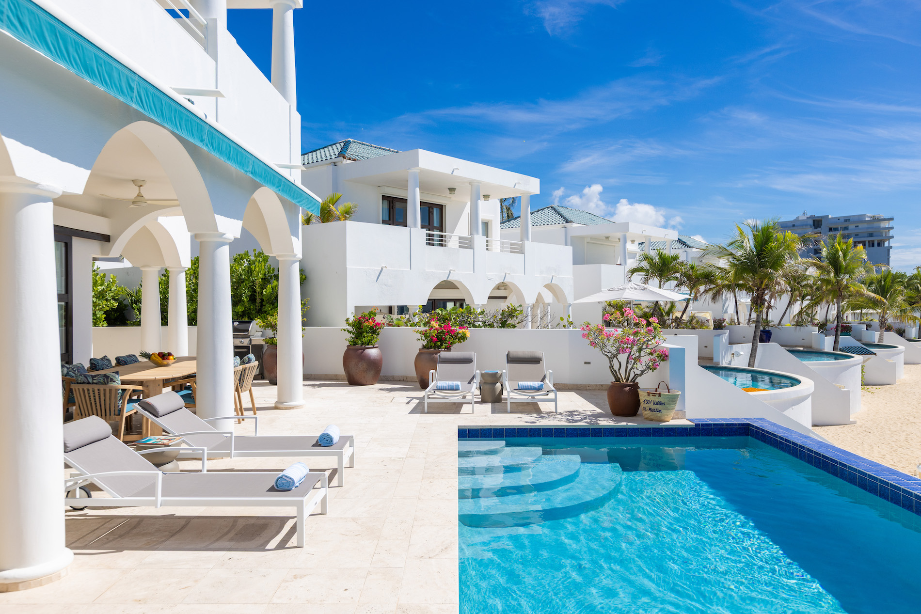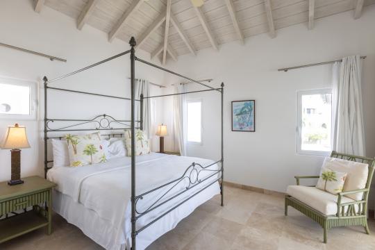 On the upper level, two of the bedrooms share a common terrace furnished with a small outdoor lounge area, while the third bedroom, set slightly apart, has its own terrace with two sun loungers. This terrace connects to the one shared by the other two bedrooms, creating a generous outdoor space to enjoy the tropical climate. All bedrooms are air-conditioned and equipped with storage and high-quality bedding, ensuring optimal comfort throughout your stay.