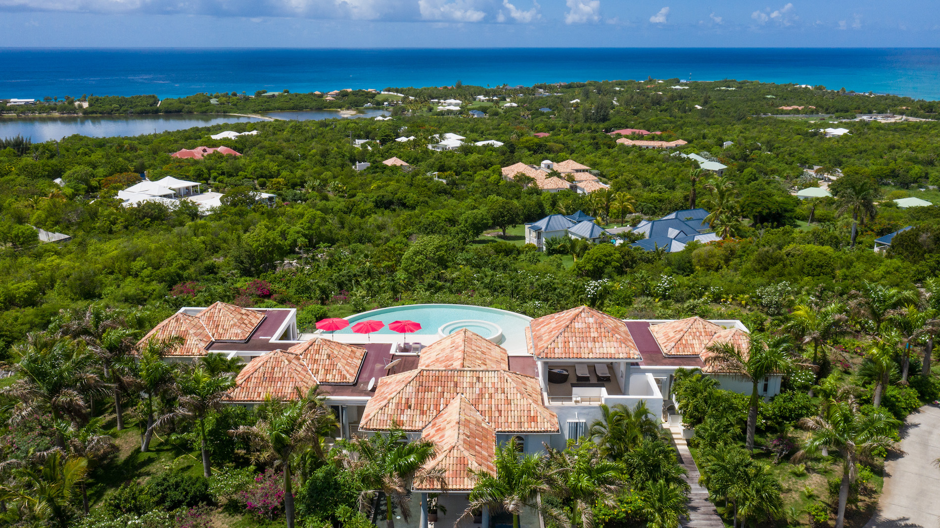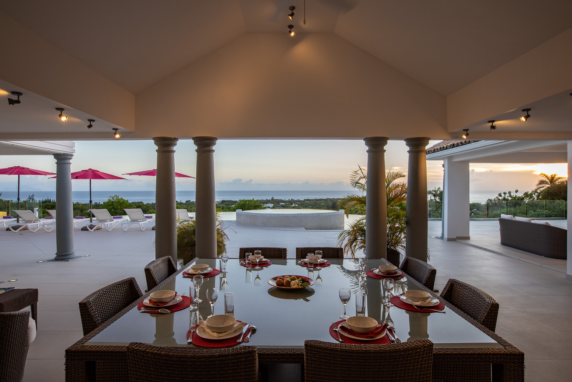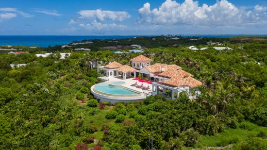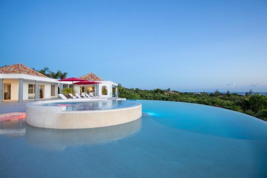 Nestled in a lush tropical setting, Villa Just in Paradise lives up to its name. From the moment you arrive, you are surrounded by the soft fragrances of jasmine and vibrant bougainvillea entwined around majestic palm trees. The covered entrance, gracefully framed by decorative water features and tropical foliage, sets the tone for an unforgettable stay. As you step through the double doors, a breathtaking 360-degree panoramic view unfolds before you, like a living masterpiece blending sky and sea.The living and dining areas are thoughtfully designed to make the most of this exceptional setting. Elegant lounge spaces and dining areas invite you to relax while taking in the view. The stunning infinity-edge swimming pool, with its organic, nautilus-inspired curves, appears to melt seamlessly into the horizon. The villa also features a swimming pool heated from October 15 to April 15; outside of this period, pool heating is available as an option for an additional $350 per week.