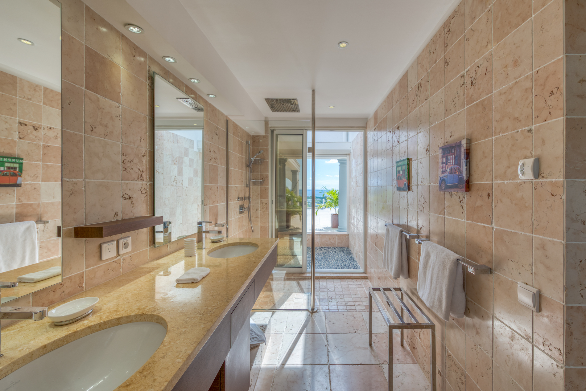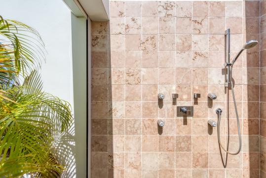 The three bedrooms are equally sized, spacious, and designed for ultimate comfort. The beautifully appointed bathrooms feature travertine and Indonesian river stones, high-end finishes, and elegant walk-in showers extended to outdoor showers with breathtaking ocean views.