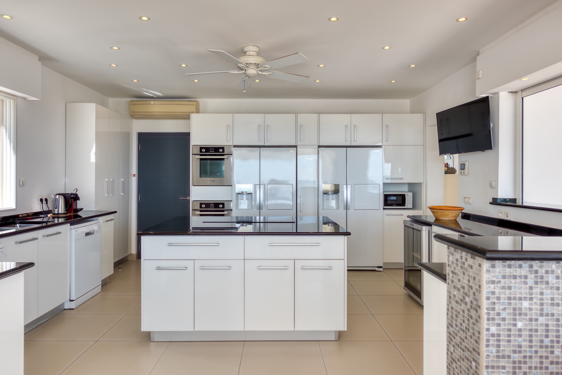 The modern, fully equipped kitchen opens onto the terrace, allowing the chef to remain connected with guests while enjoying the scenery.