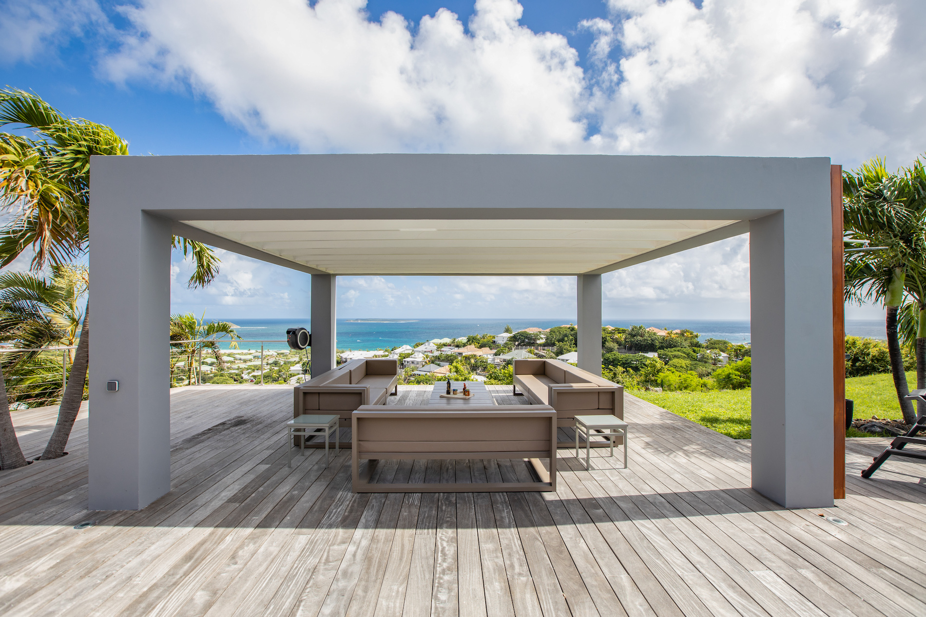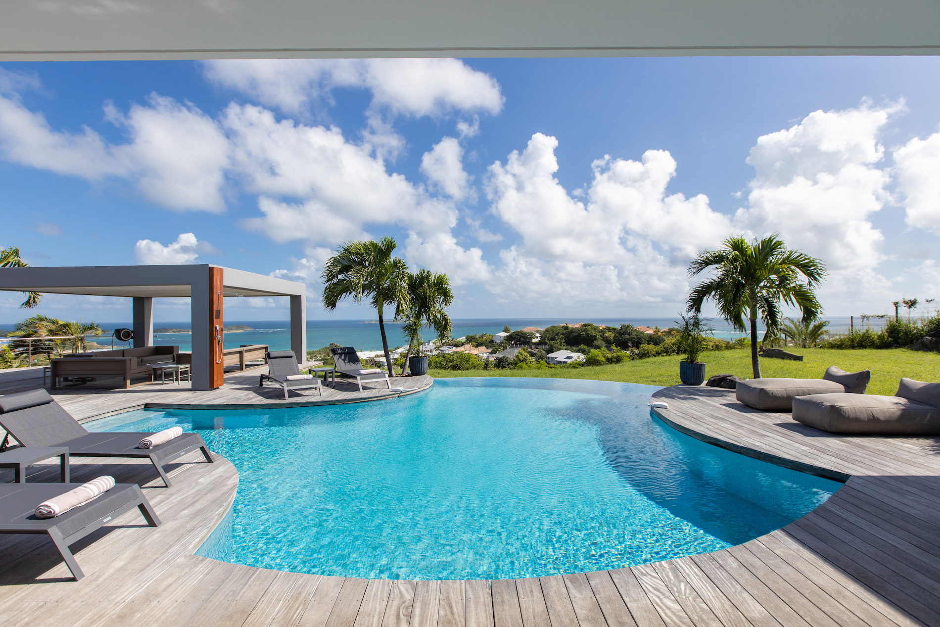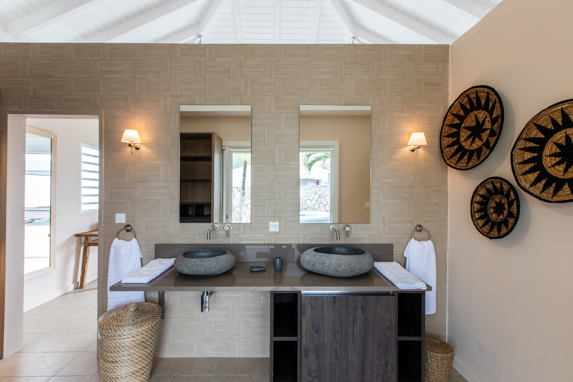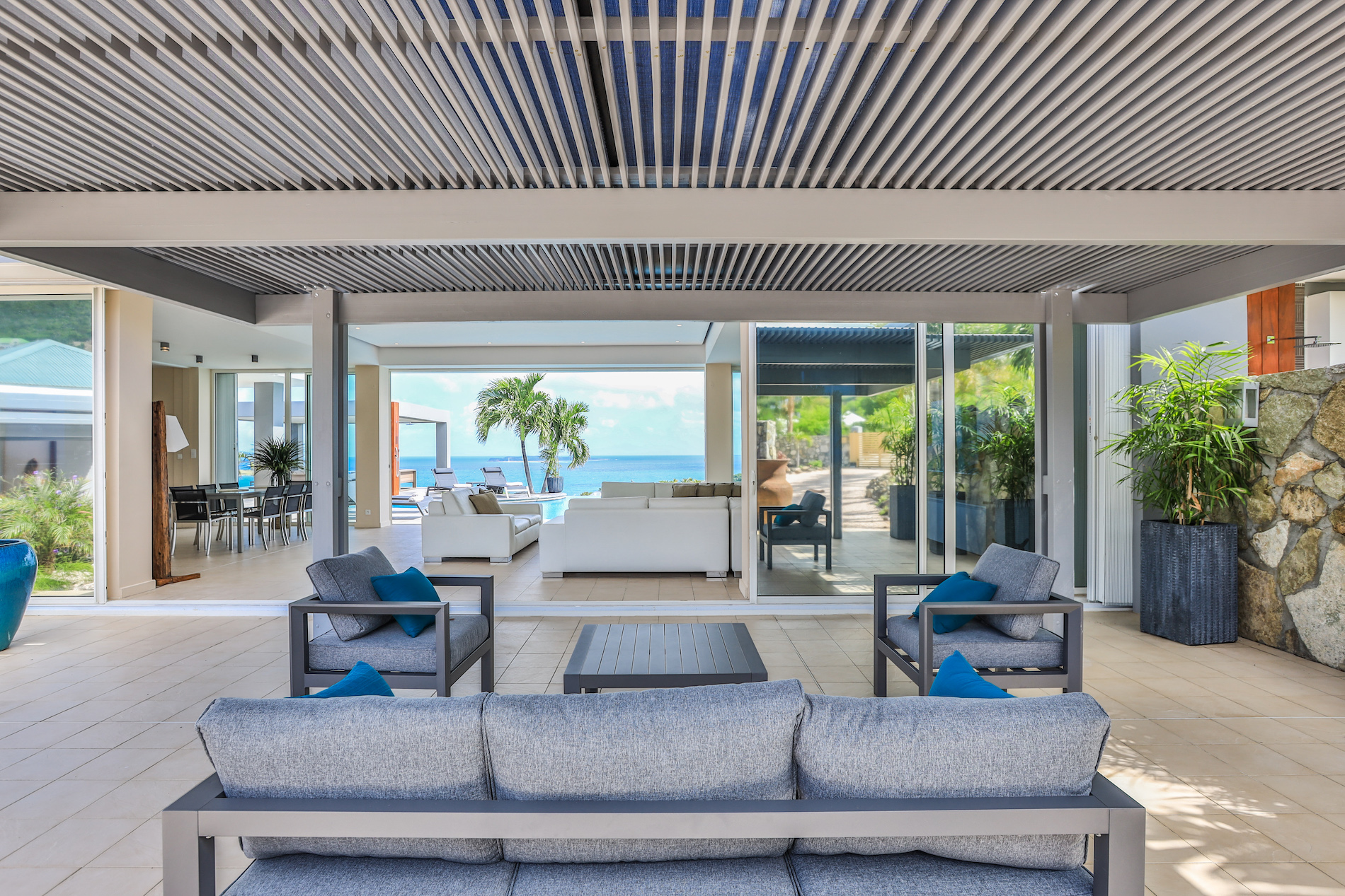 The villa’s beautiful outdoor spaces open to a free-form infinity pool, a large open deck with plenty of room for poolside sunbathing, and a gazebo with a sitting area to enjoy the cool island breeze and views of our smaller neighboring islands, Green Cay, Pinel and Tintamarre.