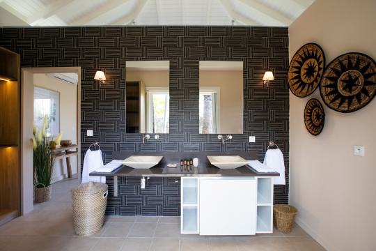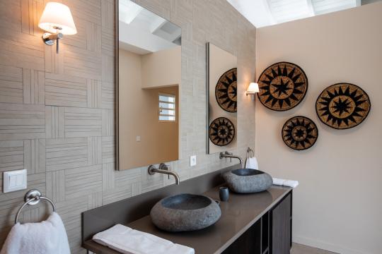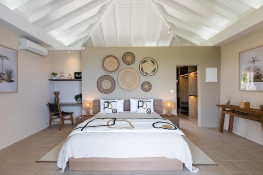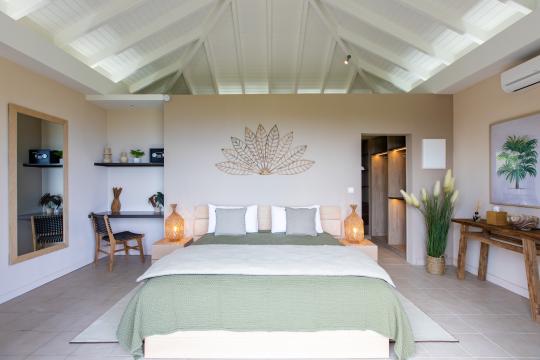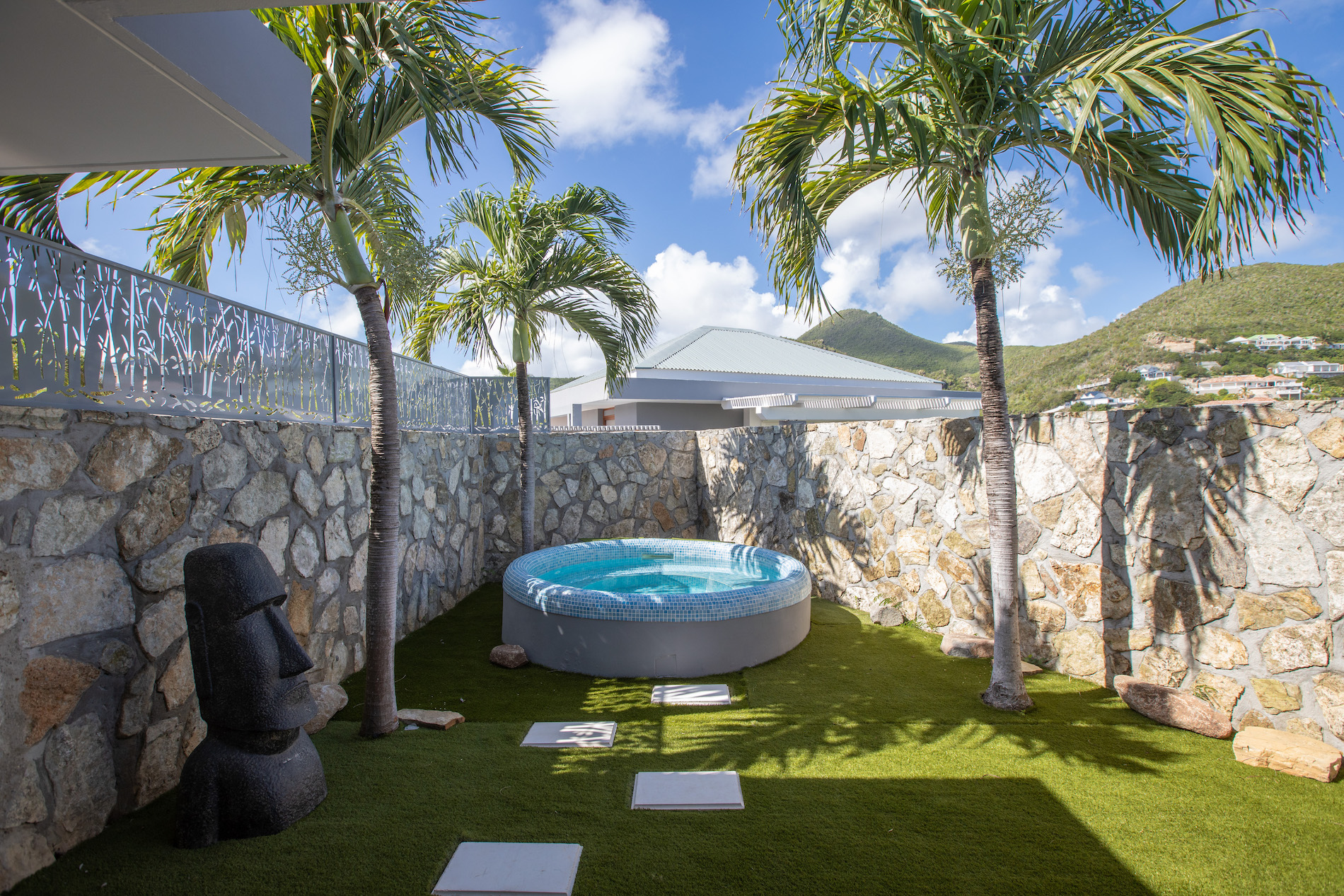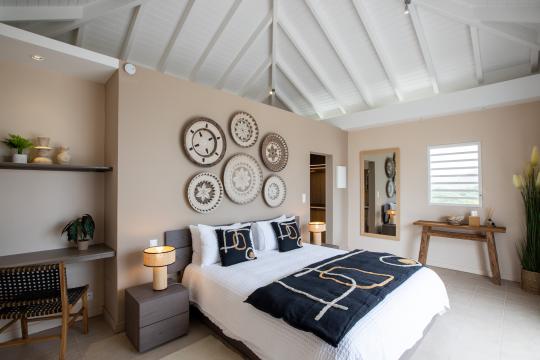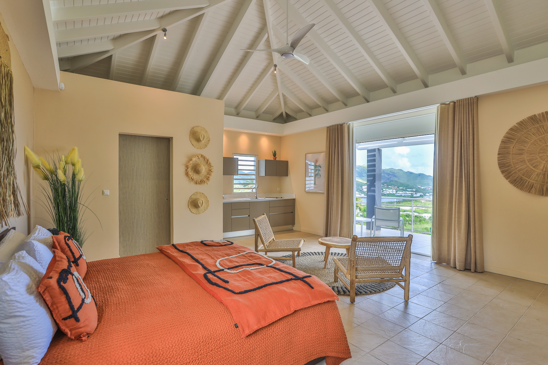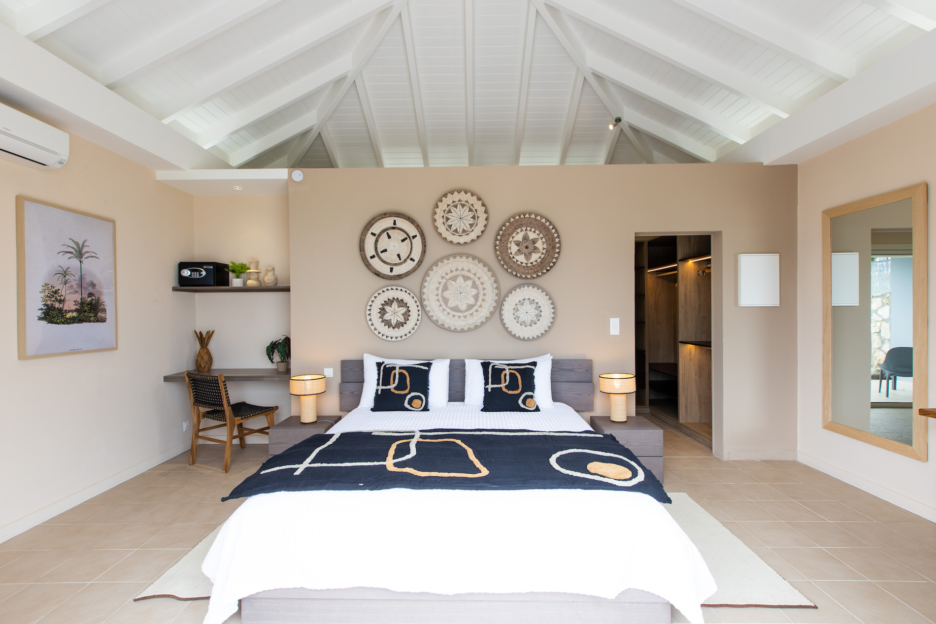 The villa’s beautiful outdoor spaces open to a free-form infinity pool, a large open deck with plenty of room for poolside sunbathing, and a gazebo with a sitting area to enjoy the cool island breeze and views of our smaller neighboring islands, Green Cay, Pinel and Tintamarre.