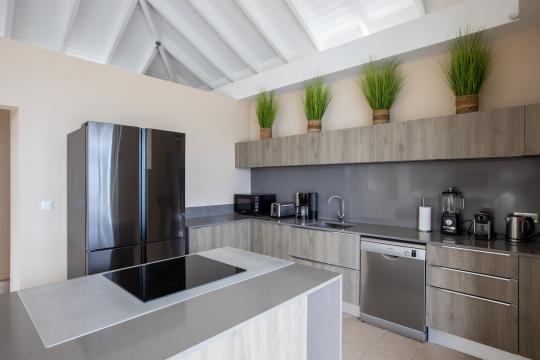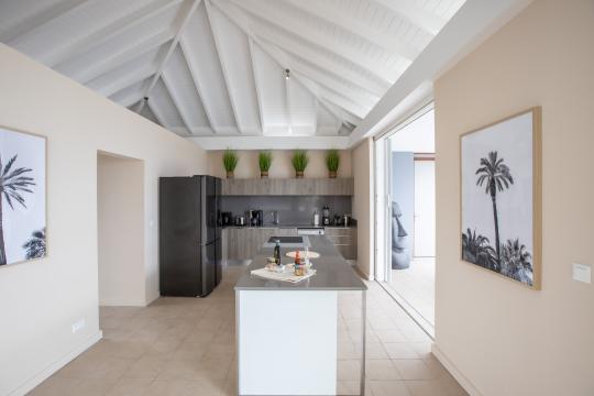 The villa has a fully equipped kitchen with an island where you can prepare your meals or have them prepared by one of our recommended chefs, while enjoying a beautiful ocean view.