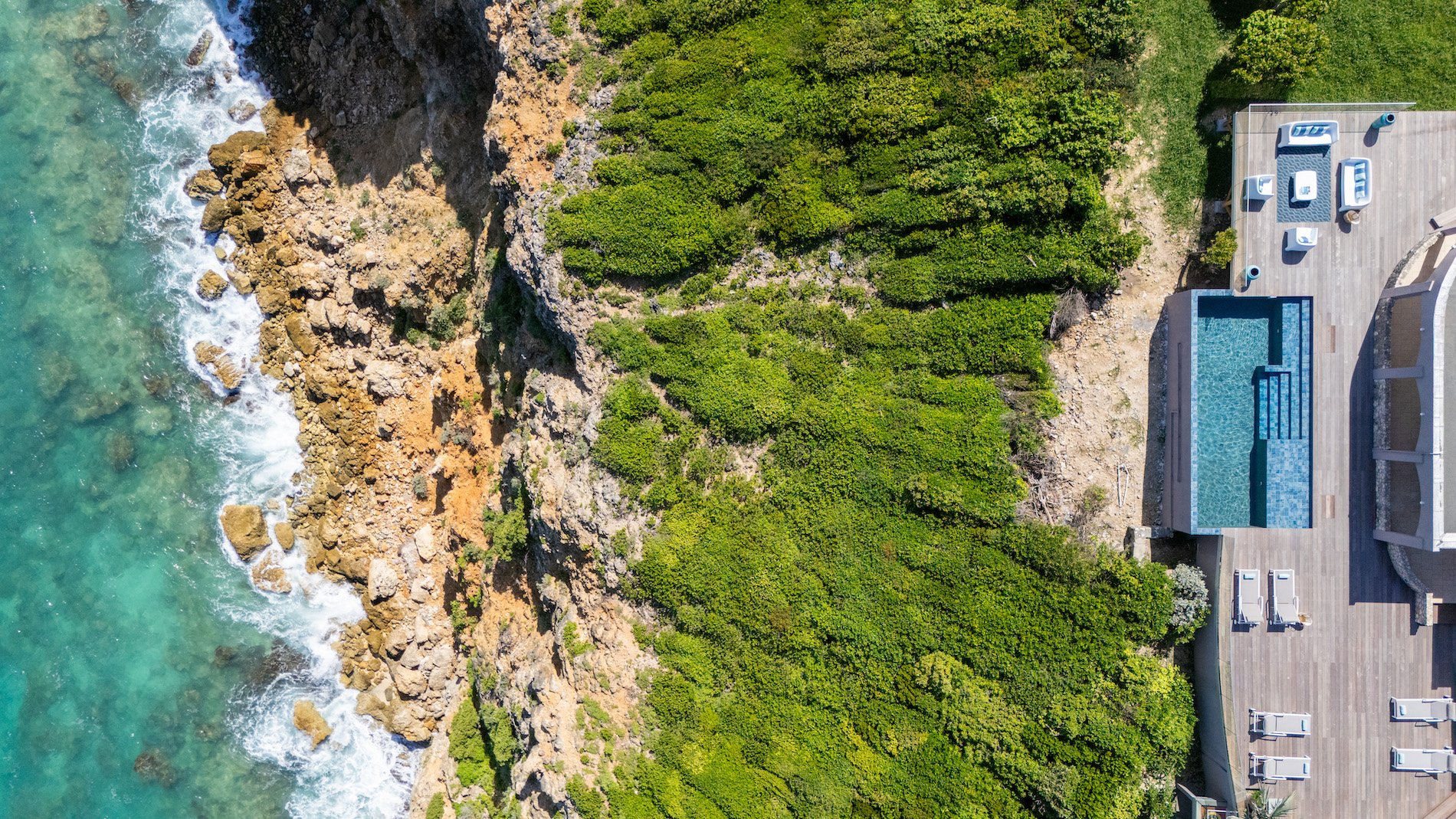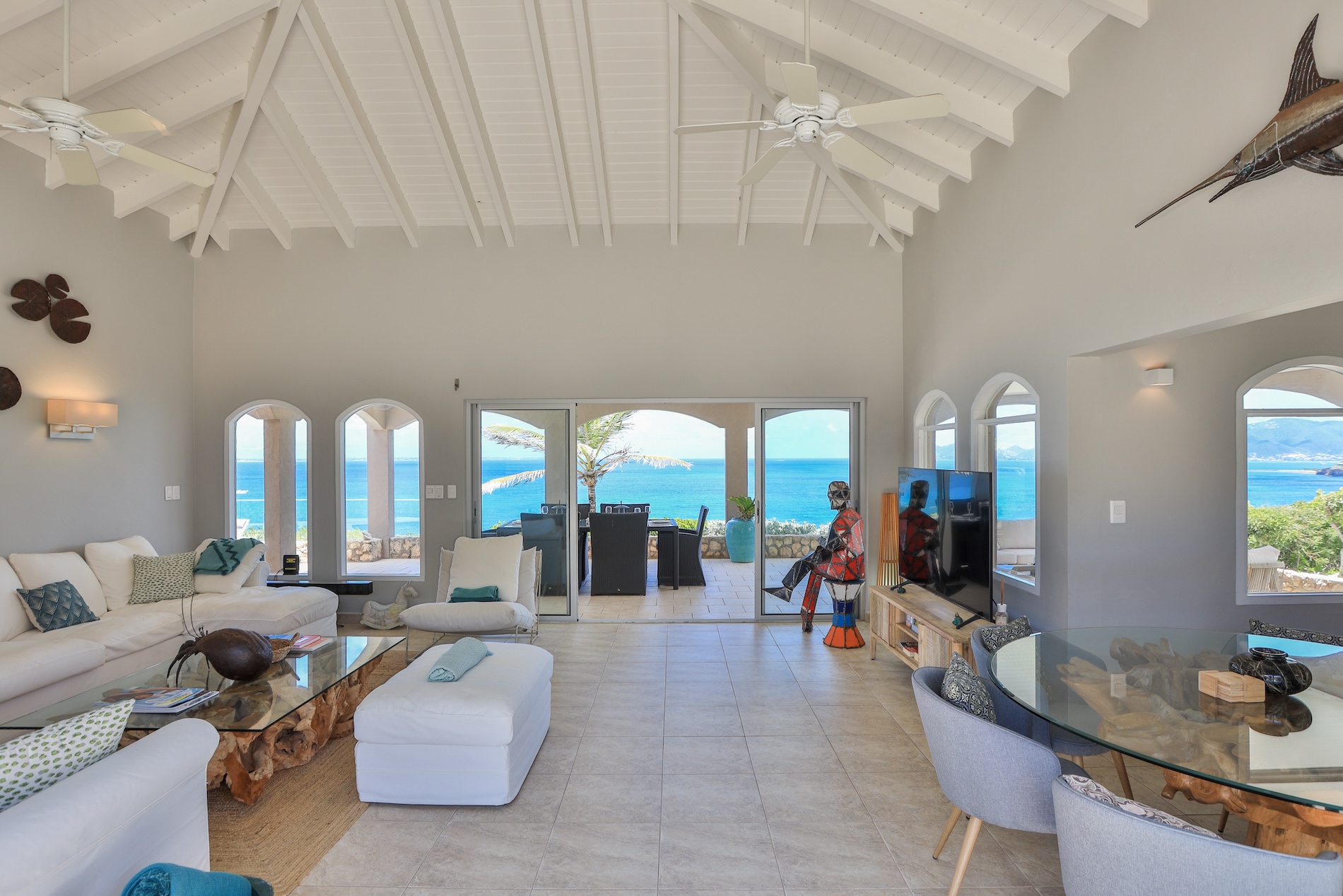 The outdoor living room is the perfect place for family meals or evenings out with friends, with an outdoor table offering breathtaking ocean views, and comfortable sofas inviting relaxation and contemplation.