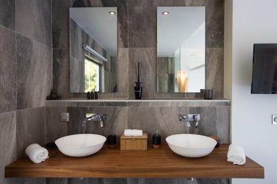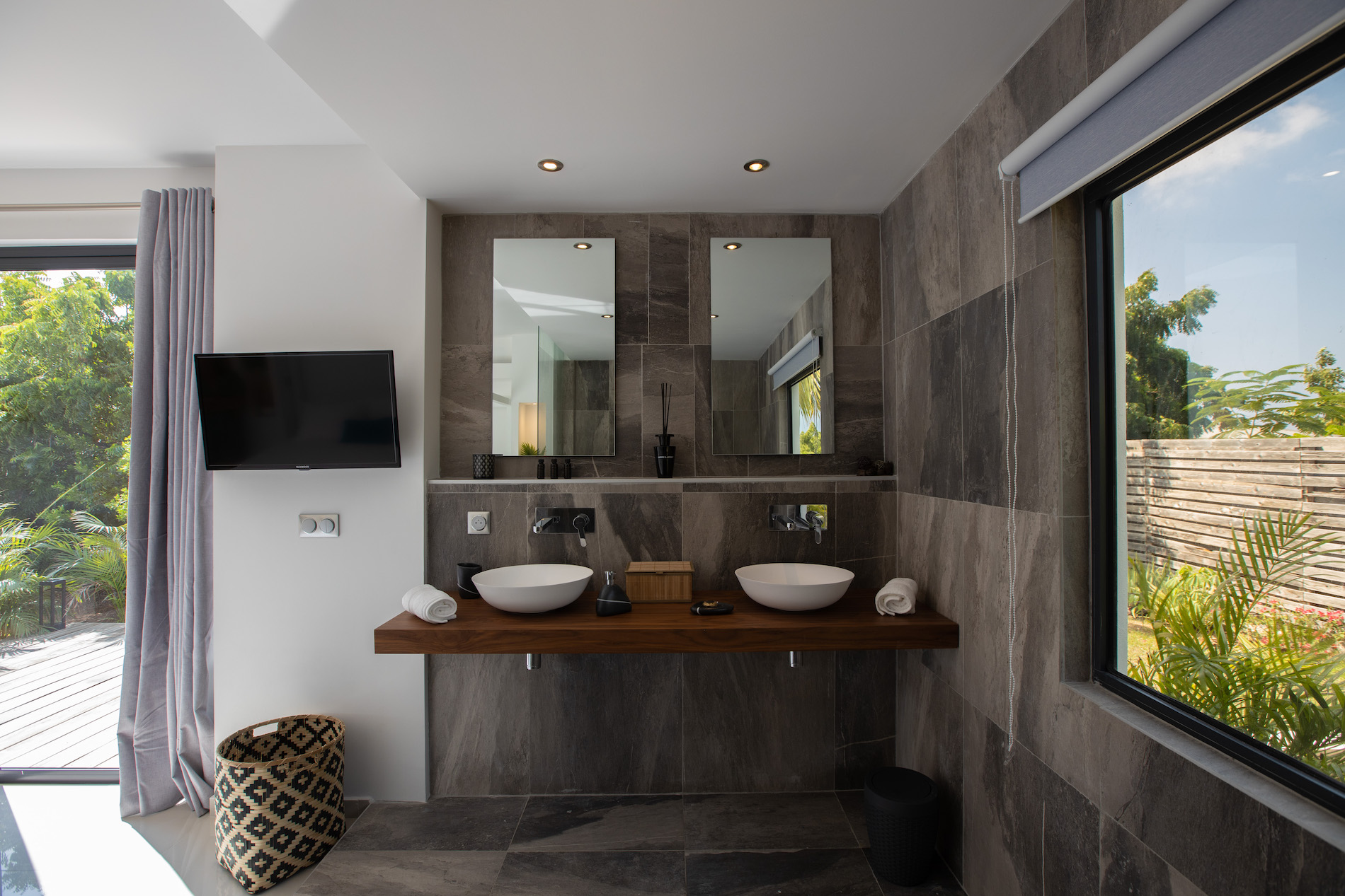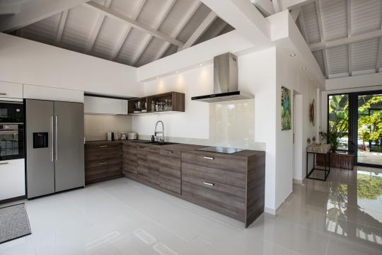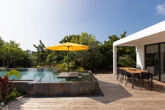 Surrounding the infinity pool, several wooden terraces on different levels provide endless opportunities : dining, lounging, or sunbathing. You can truly relax and enjoy the tropical ambiance of the outdoor spaces.