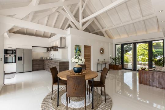 Villa Nuit d'Étoiles is a stunning two-bedroom property that has recently been renovated and is located in Terres Basses in Saint Martin. This villa provides all the comfort and privacy you need for a wonderful stay. The cozy interior living space features a lounge area with a large corner sofa and a television, as well as a small dining area that opens up to the open-plan kitchen.