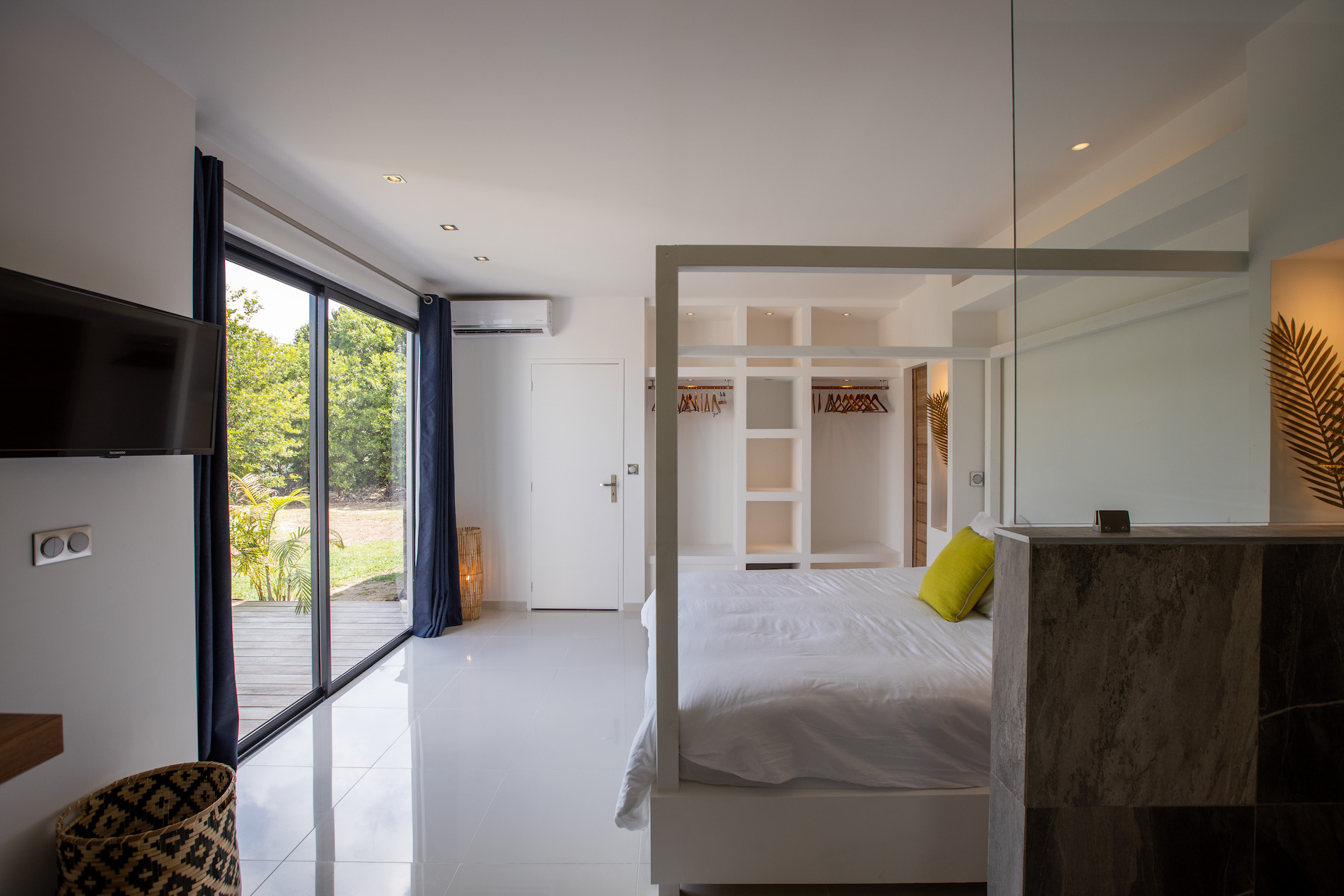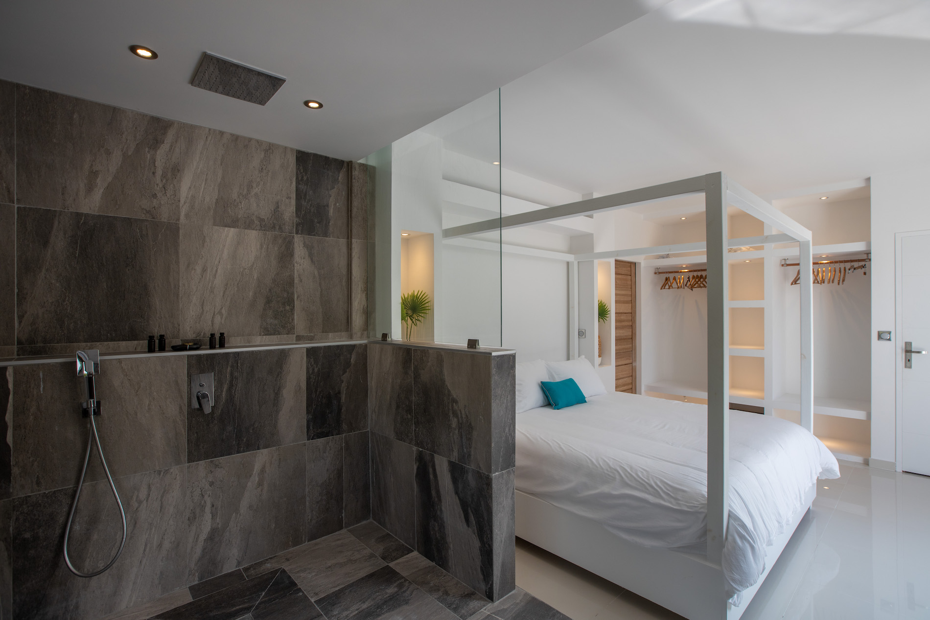 Two bedrooms, equipped with air conditioning, king-size beds, en-suite bathrooms, and outdoor showers, are connected to the main living area. These bedrooms offer a tranquil and comfortable retreat.