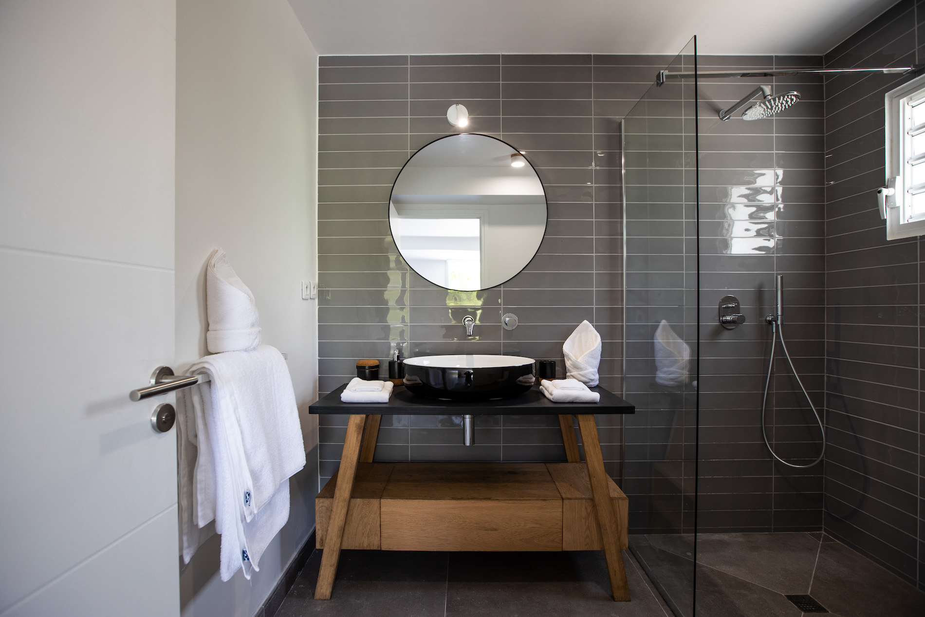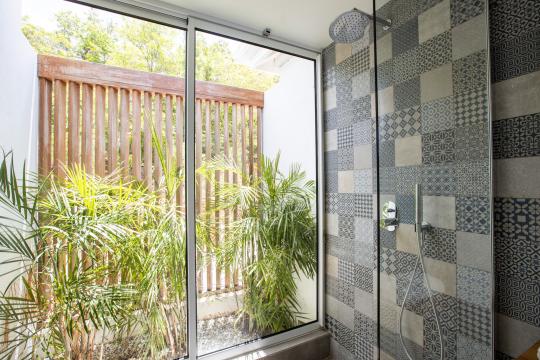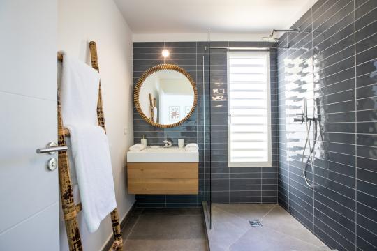 This stunning villa features 4 bedrooms, each equipped with its own ensuite bathroom. Three of the bedrooms are situated on the upper level, providing privacy and comfort. The fourth bedroom is located on the lower level, along with a gym where you can stay active during your stay.